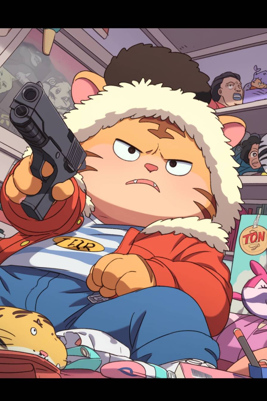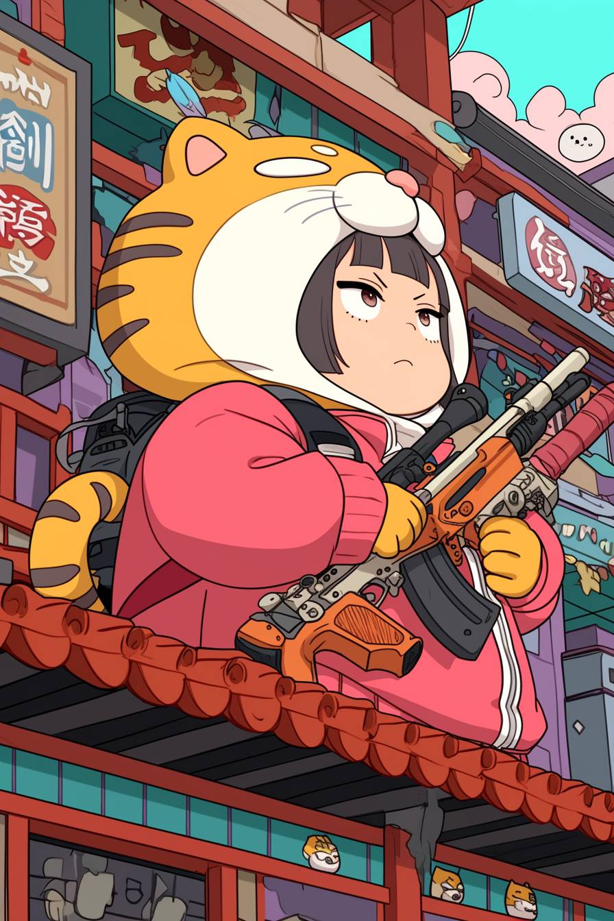 호랑이 마스크를 쓴 캐릭터가 총을 들고 있는 지브리 스타일 애니메이션 장면