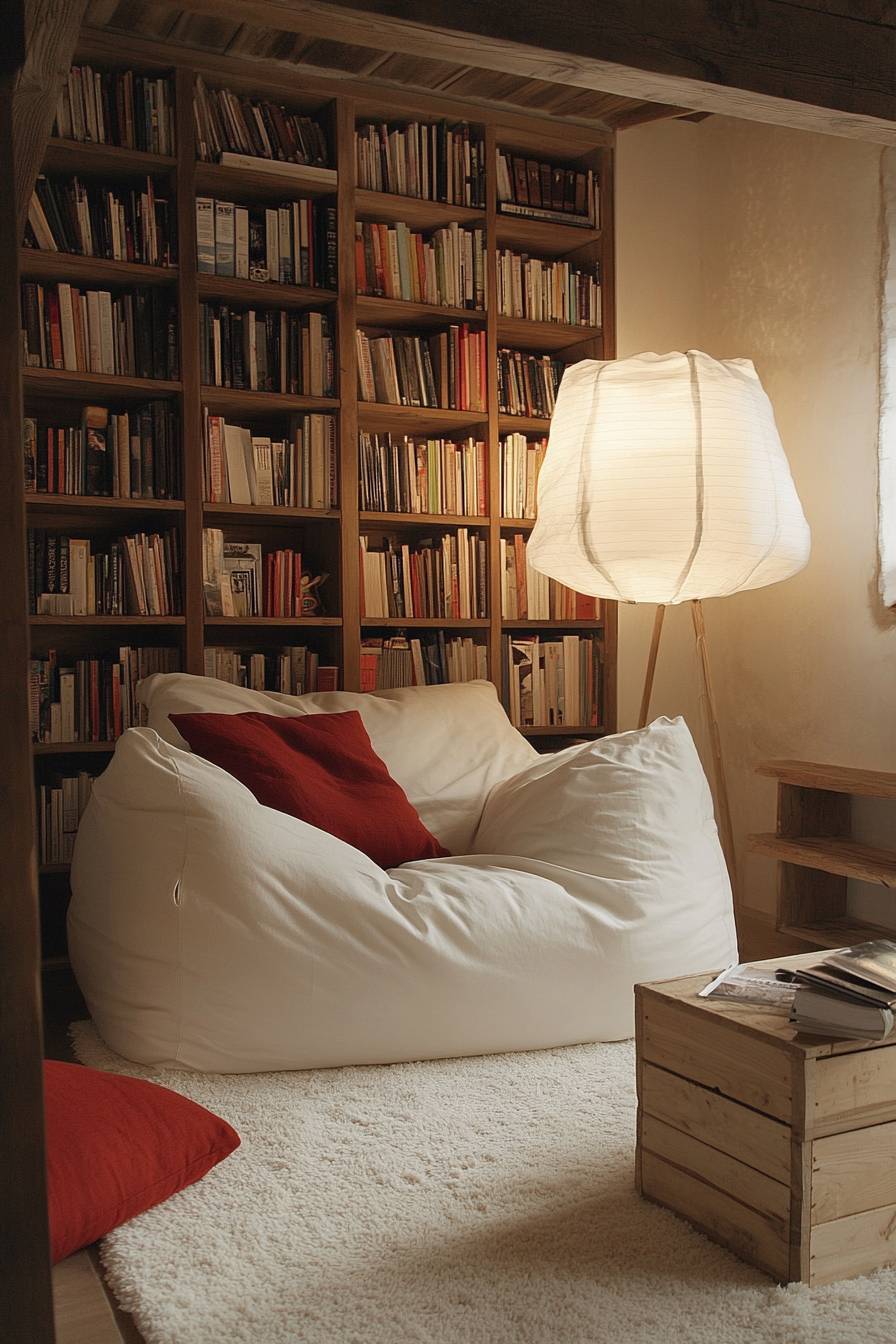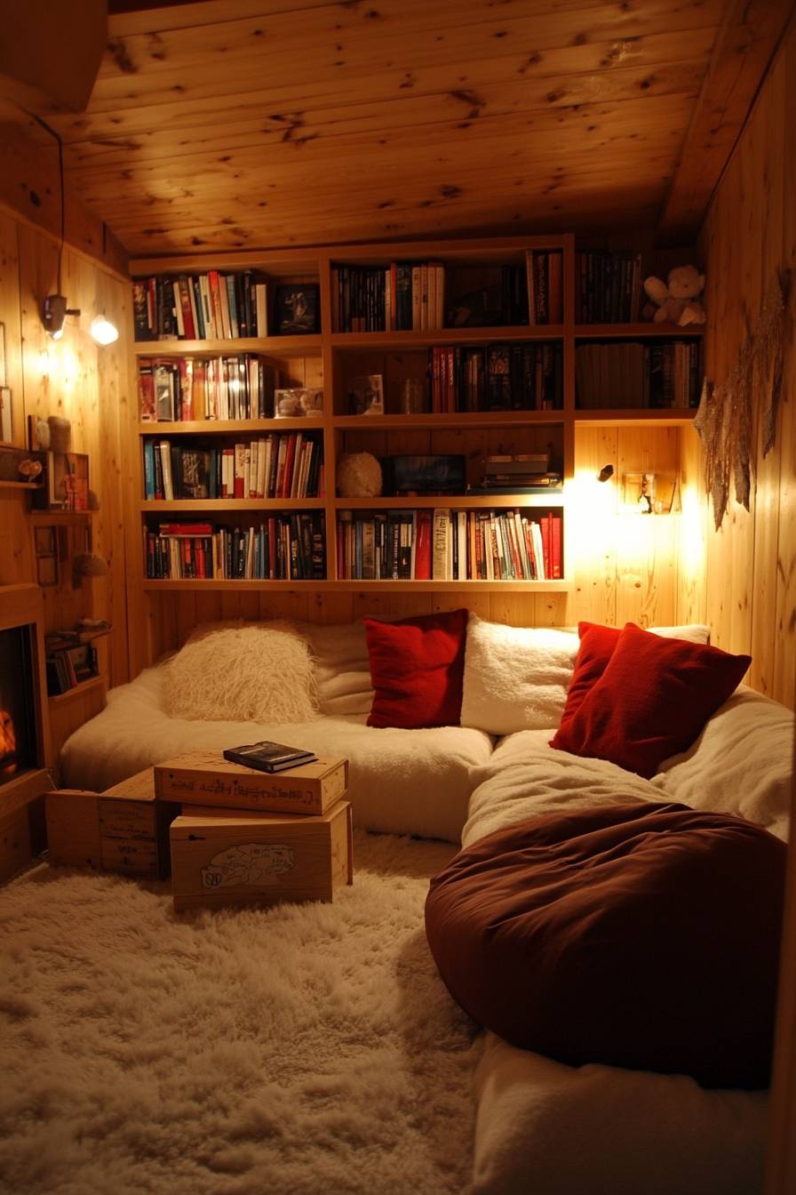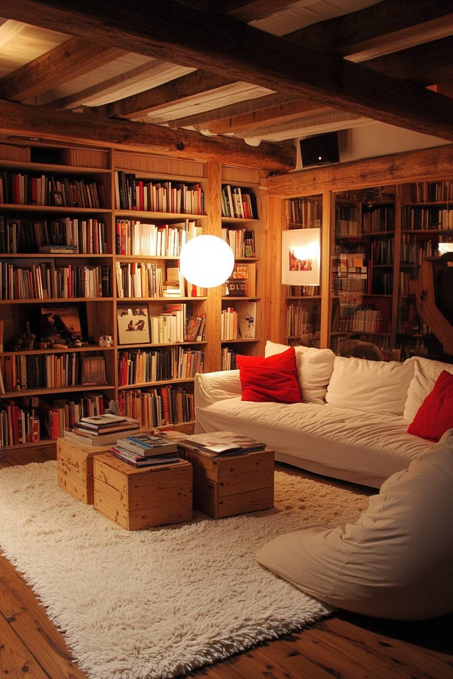A cozy, rustic, and modern living room in an alpine chalet with built-in bookshelves, a white sofa, red accents, wooden boxes used as coffee table cubes, illuminated by warm lamps and warm lighting, a white rug, and a large bean bag chair. --ar 2:3 --v 6.1