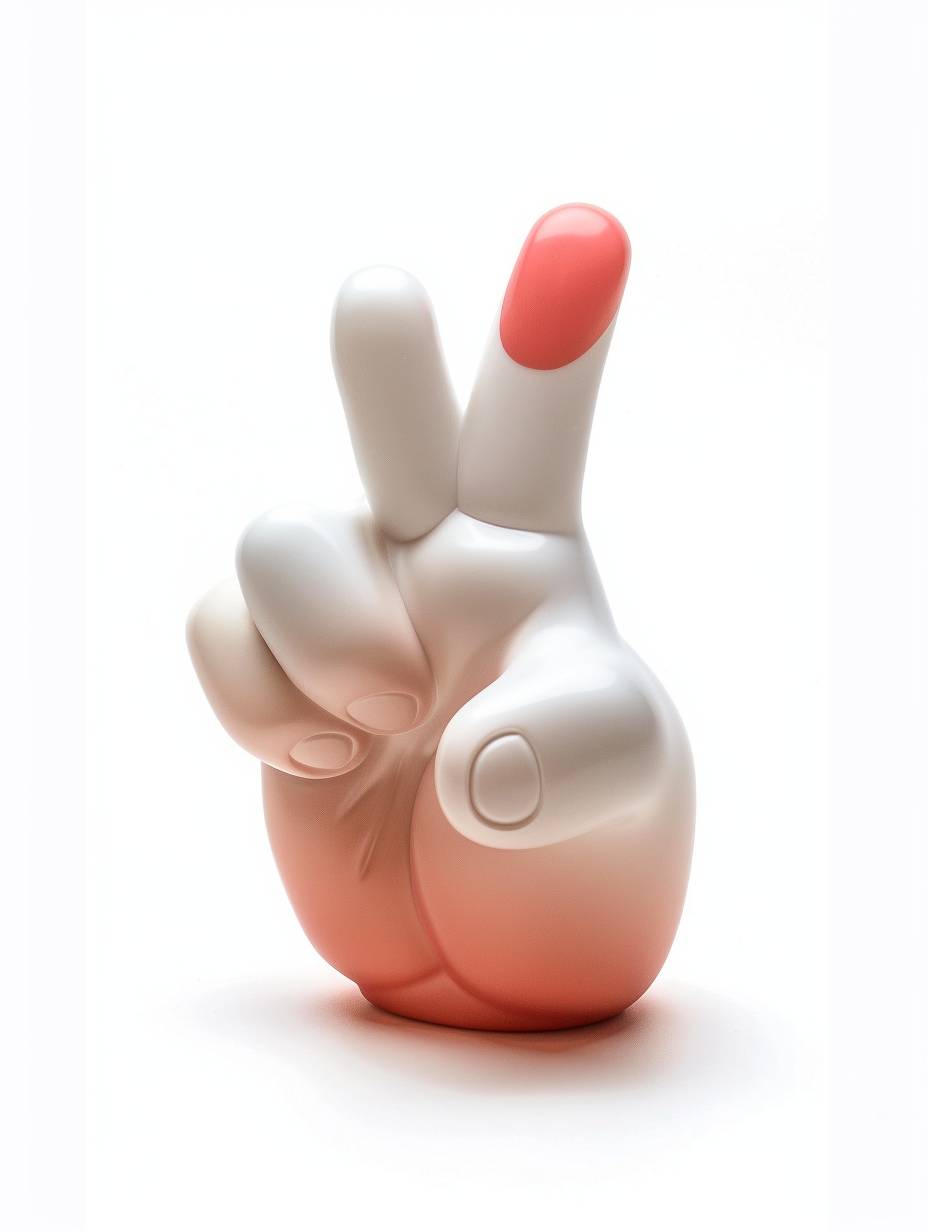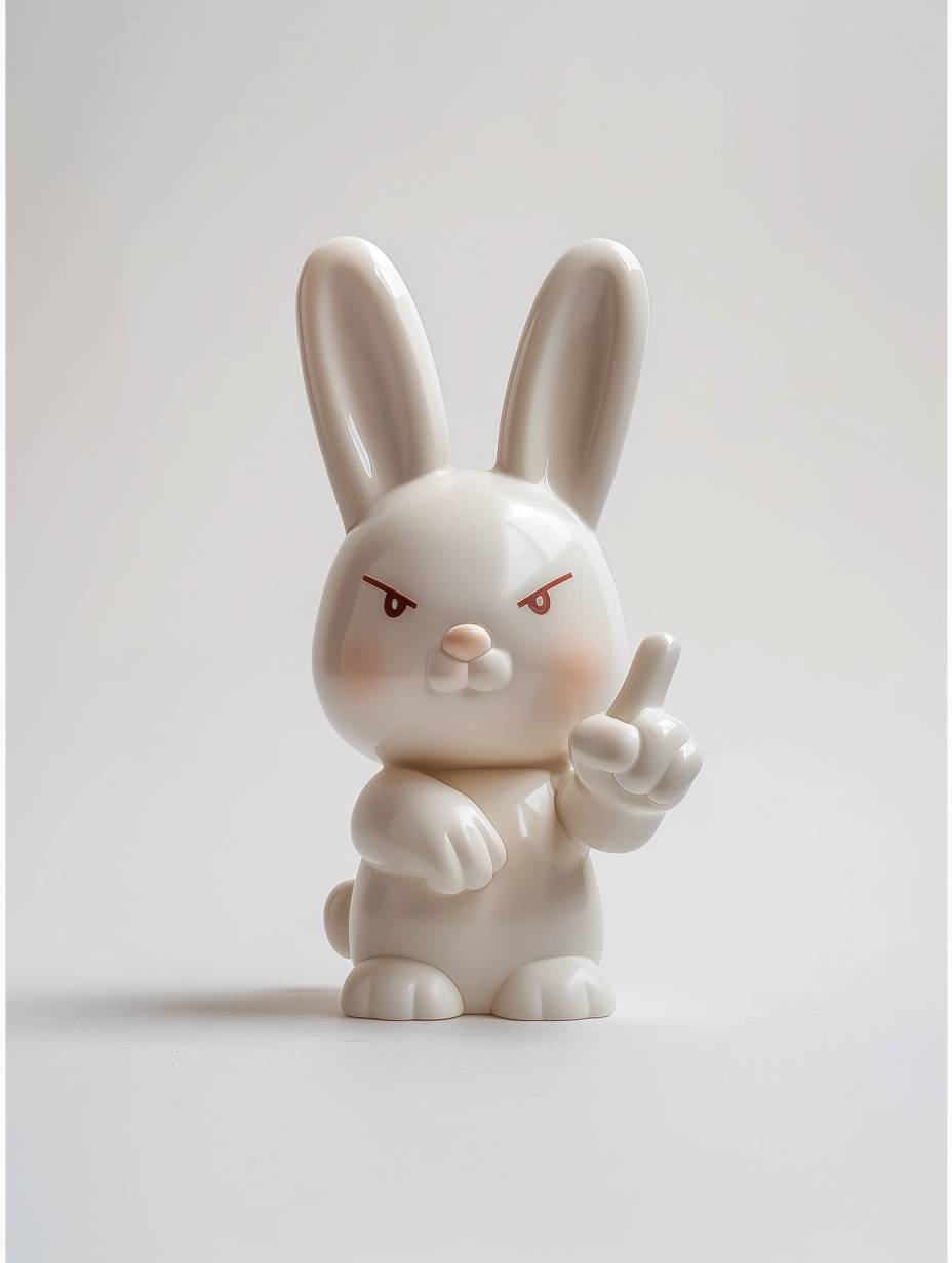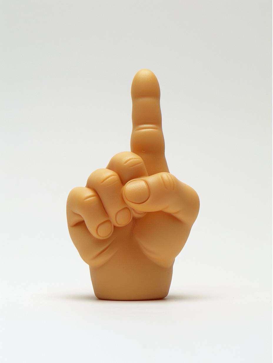 흰색 배경에 중지를 세운 손 제스처를 묘사한 귀엽고 간단한 비닐 장난감, Chris LaBrooy와 Craig Mullins 스타일로.