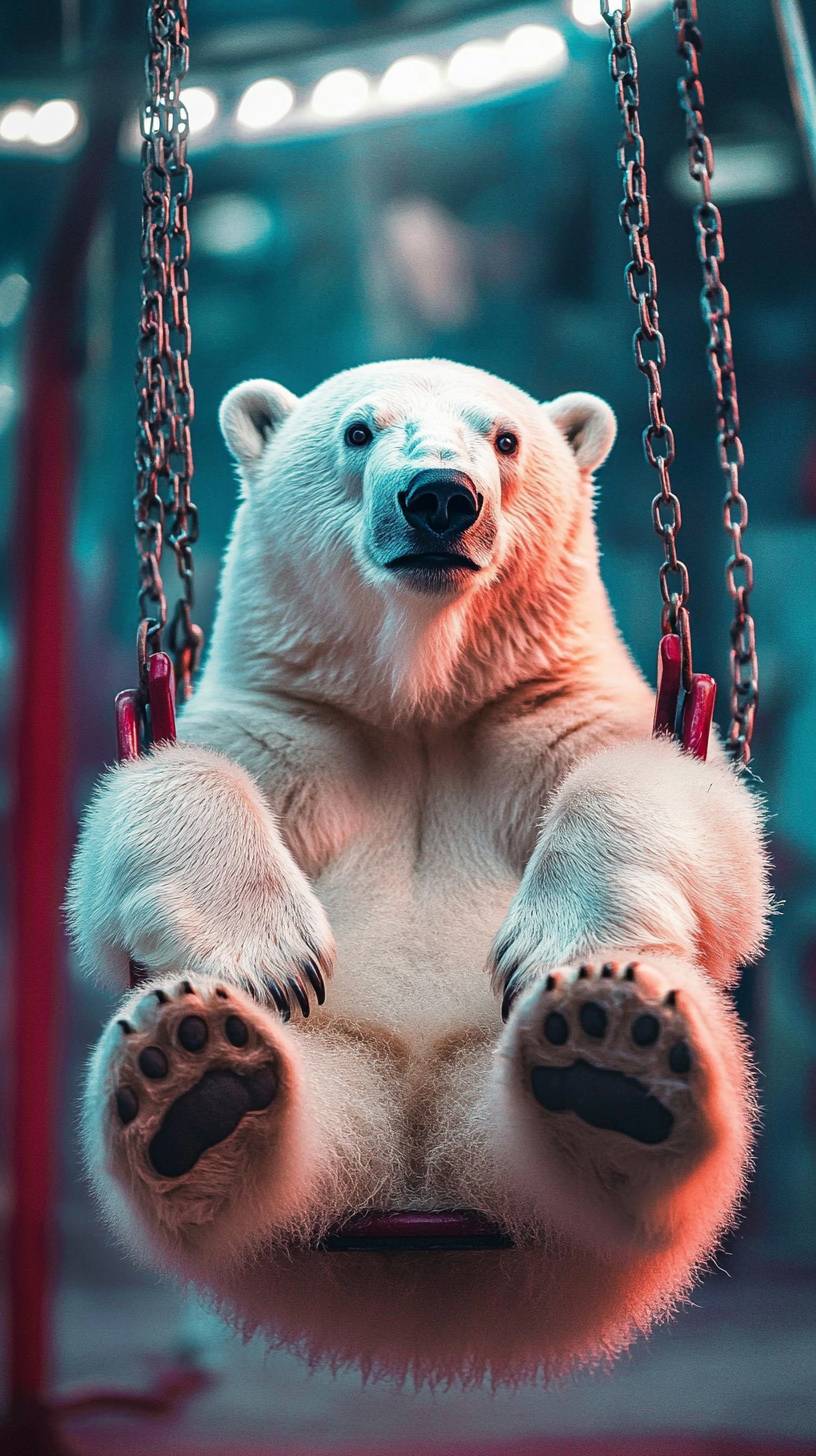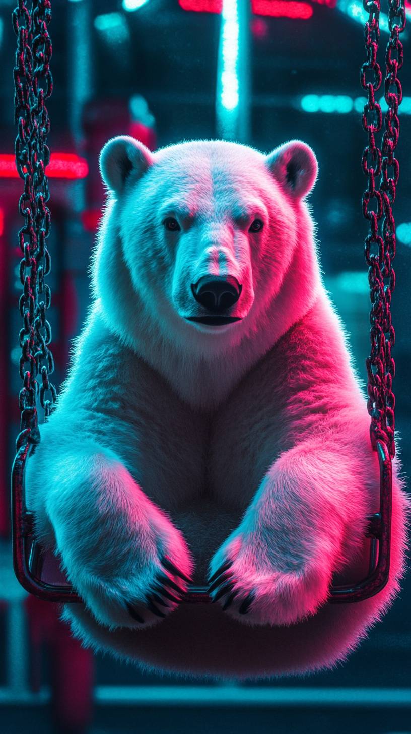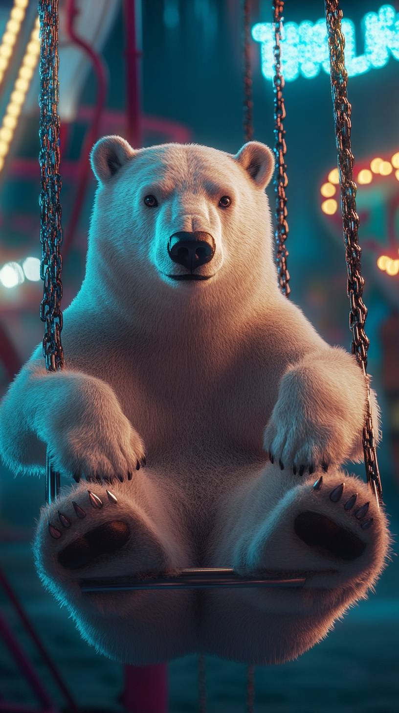 close up shot of polar bear, sitting on a swing in an amusement park, evening, neon lighting. Captured using Canon EOS R5 camera with RF60mm F2 lens for sharpness and detail., ultra realistic photo, cinematic light --ar 9:16 --v 6.1