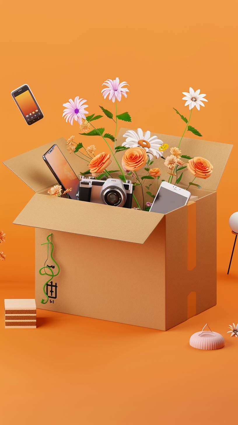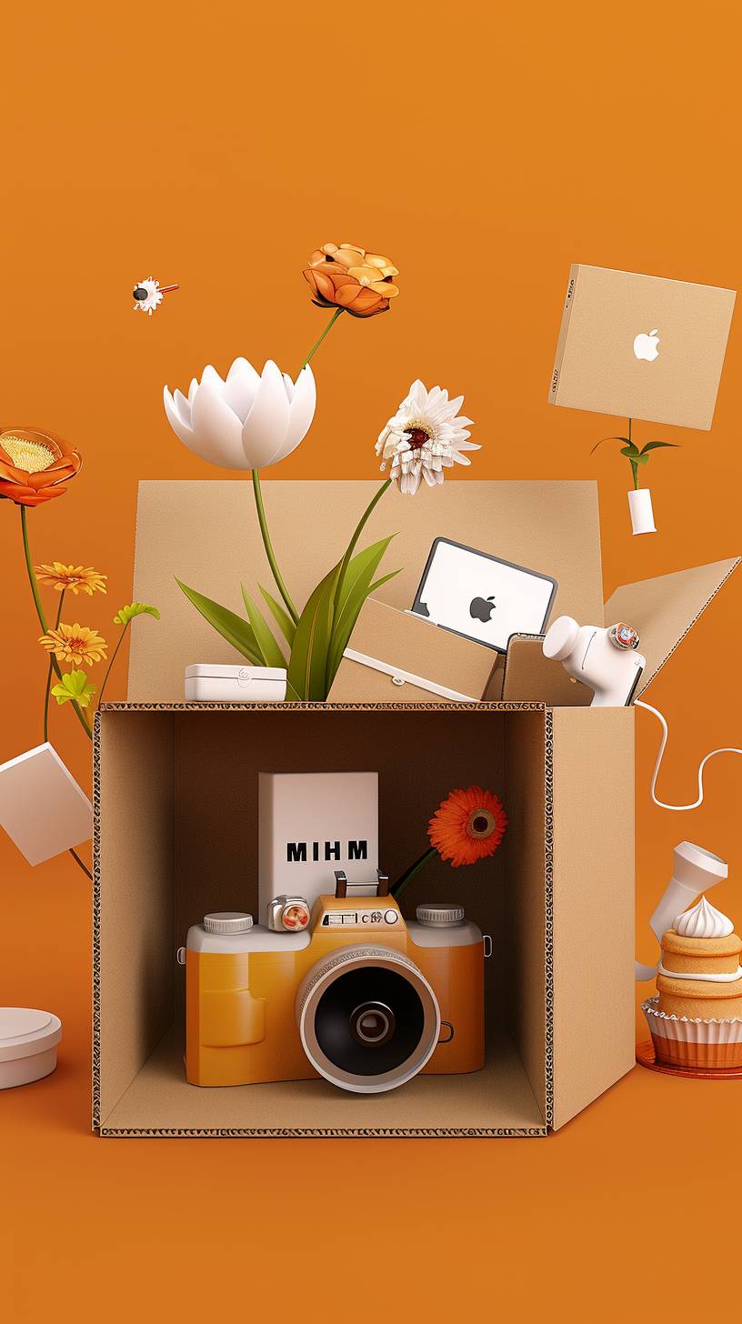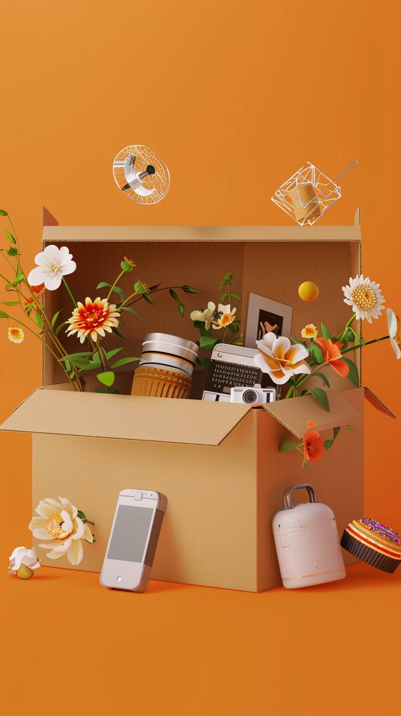 <https://s.mj.run/HYYQW-FZfCA> <https://s.mj.run/oaPNGImh0e8> The cardboard box is open and filled with items, including flowers, computers, mobile phones, cameras, cakes, daily necessities, 3d style, oc renderer, high-definition texture, clean orange background space --ar 9:16 --v 6.0