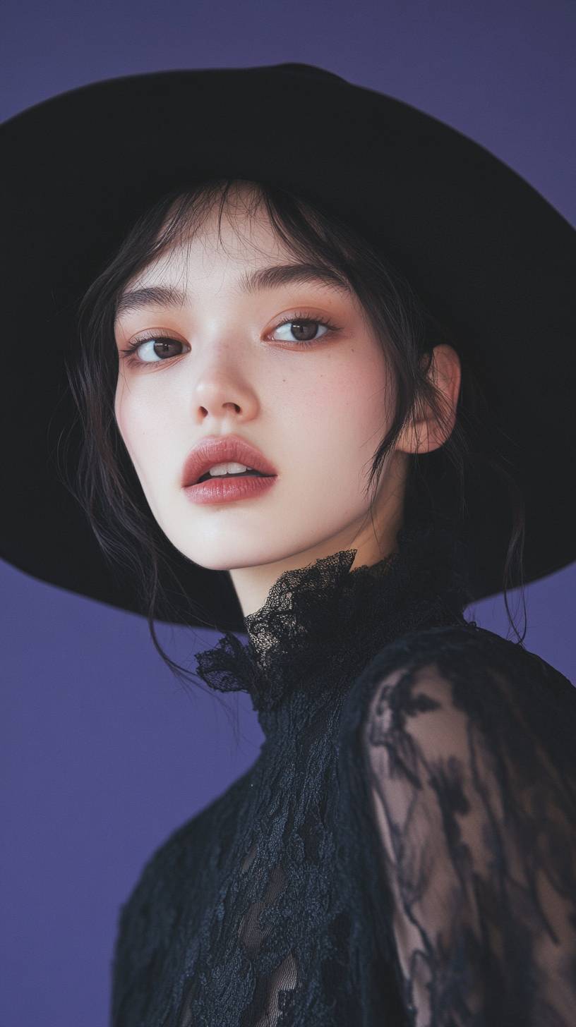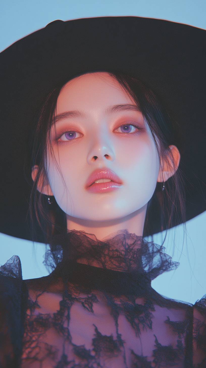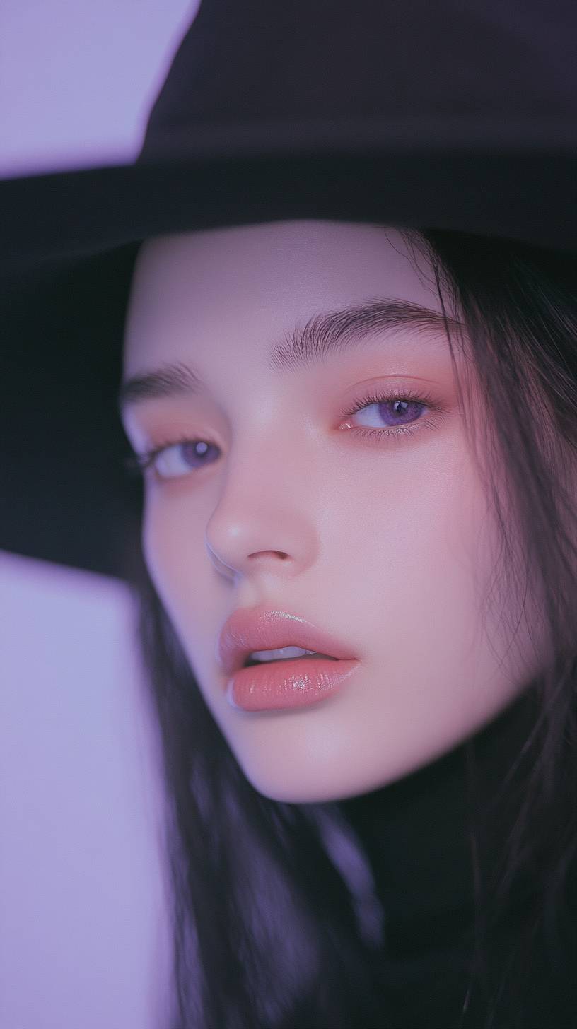 Photograph of a witch theme, background should be dark and mystical, with elements like a full moon, eerie trees, and fog to set a spooky, magical atmosphere. The model is wearing a sleek, modern witch outfit with a black hat and subtle, elegant details like lace or shimmering fabric. Her makeup is bold, featuring dark purple or black lips, smoky eyes, and a pale but glowing complexion. The colored contact lenses should stand out, with an enchanting, mystical hue such as vivid purple or glowing green, giving her a captivating and mysterious look. The overall mood should feel magical, powerful, and slightly eerie, capturing the essence of a Halloween witch. our protagonist is having a conversation with us, image of staring at the front slightly, expressive focused eyes, closeup photo of a gorgeous beautiful korean young model, cute, hourglass figure, studio portrait, studio light, style creates a sense of mystery and intrigue, shot on Canon EOS R6:1 --ar 9:16 --style raw --personalize 57e8bjg v3pozu2 --v 6.1