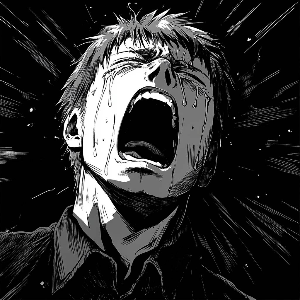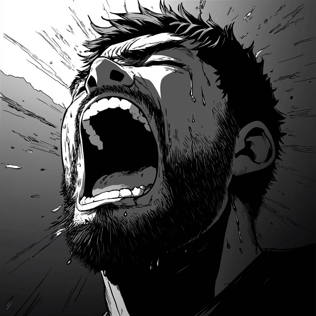 극도의 감정적 고통 속에서 울고 소리 지르는 남자, 흑백 애니메이션 스타일, 1:1 비율. 과장된 얼굴 특징과 얼굴을 타고 흐르는 눈물, 입을 크게 열고 소리 지르고 있다. 감정의 강도를 강조하기 위해 강한 빛과 그림자의 대비. 구부린 어깨와 쥔 주먹으로 드라마틱한 신체 언어. 음영 처리에 크로스 해칭을 사용한 세밀한 선화. 고립감이나 혼란을 암시하는 배경 요소.