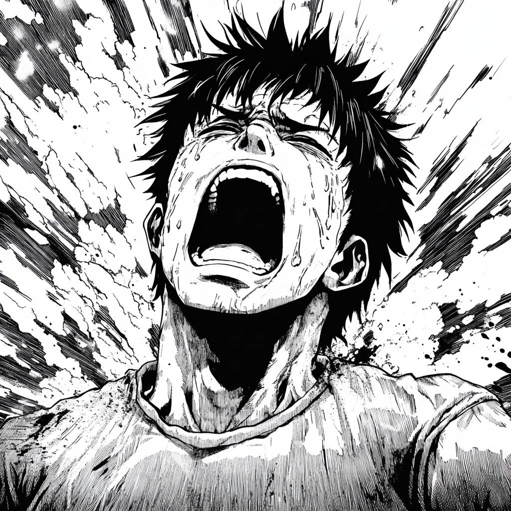 A man crying and screaming in intense emotional distress, black and white anime style, 1:1 aspect ratio. Exaggerated facial features with tears streaming down his face, mouth wide open in a scream. Strong contrast between light and shadows to emphasize the emotional intensity. Dramatic body language with hunched shoulders and clenched fists. Detailed line art with cross-hatching for shading. Background elements suggesting a sense of isolation or turmoil. --v 6.1