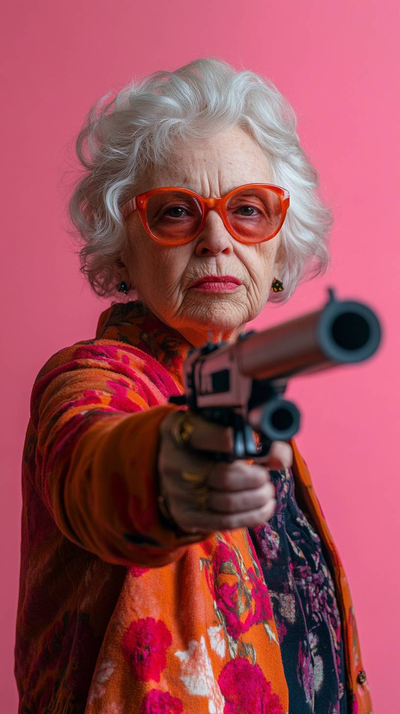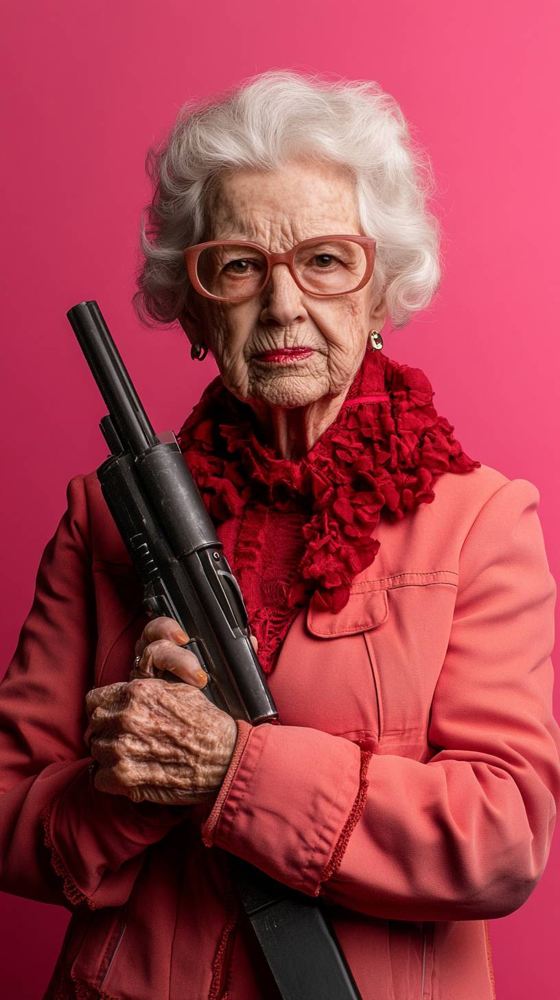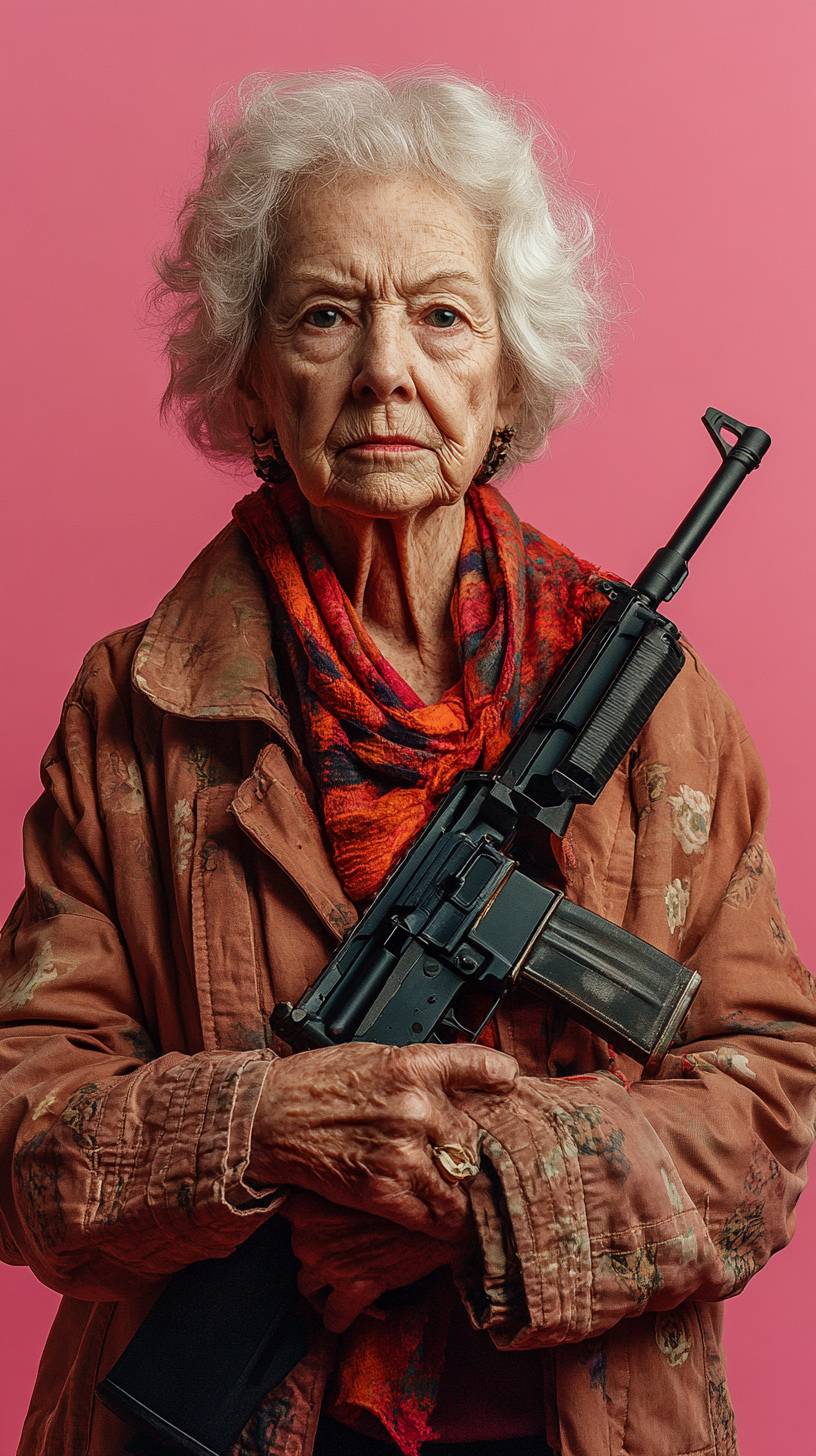 ‘할머니 터미네이터’라는 영화 커버를 만드세요. 클래식하고 사랑스러운 외모의 할머니가 바주카를 들고 있습니다. 할머니는 키가 크고, 분홍색 스튜디오 배경에서 스튜디오 조명이 켜져 있습니다.