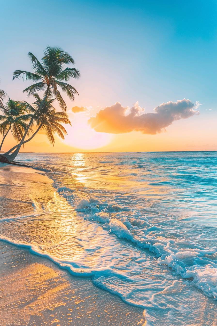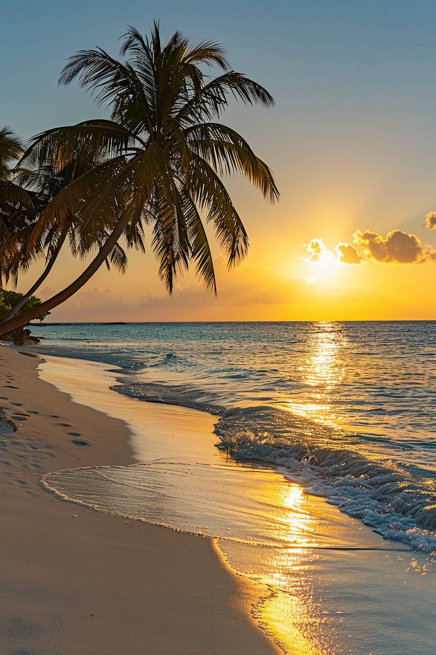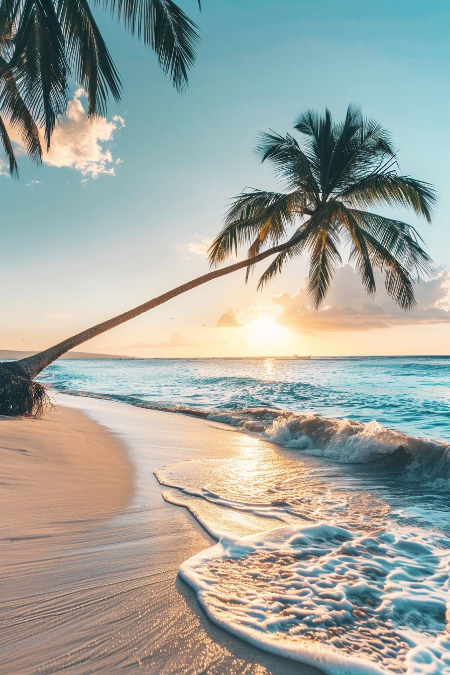 A serene beach at sunset, with palm trees swaying gently in the warm breeze and the golden sun sinking below the horizon, casting a romantic glow over the turquoise waters.-sref 275318946 --ar 2:3 --v 6.0