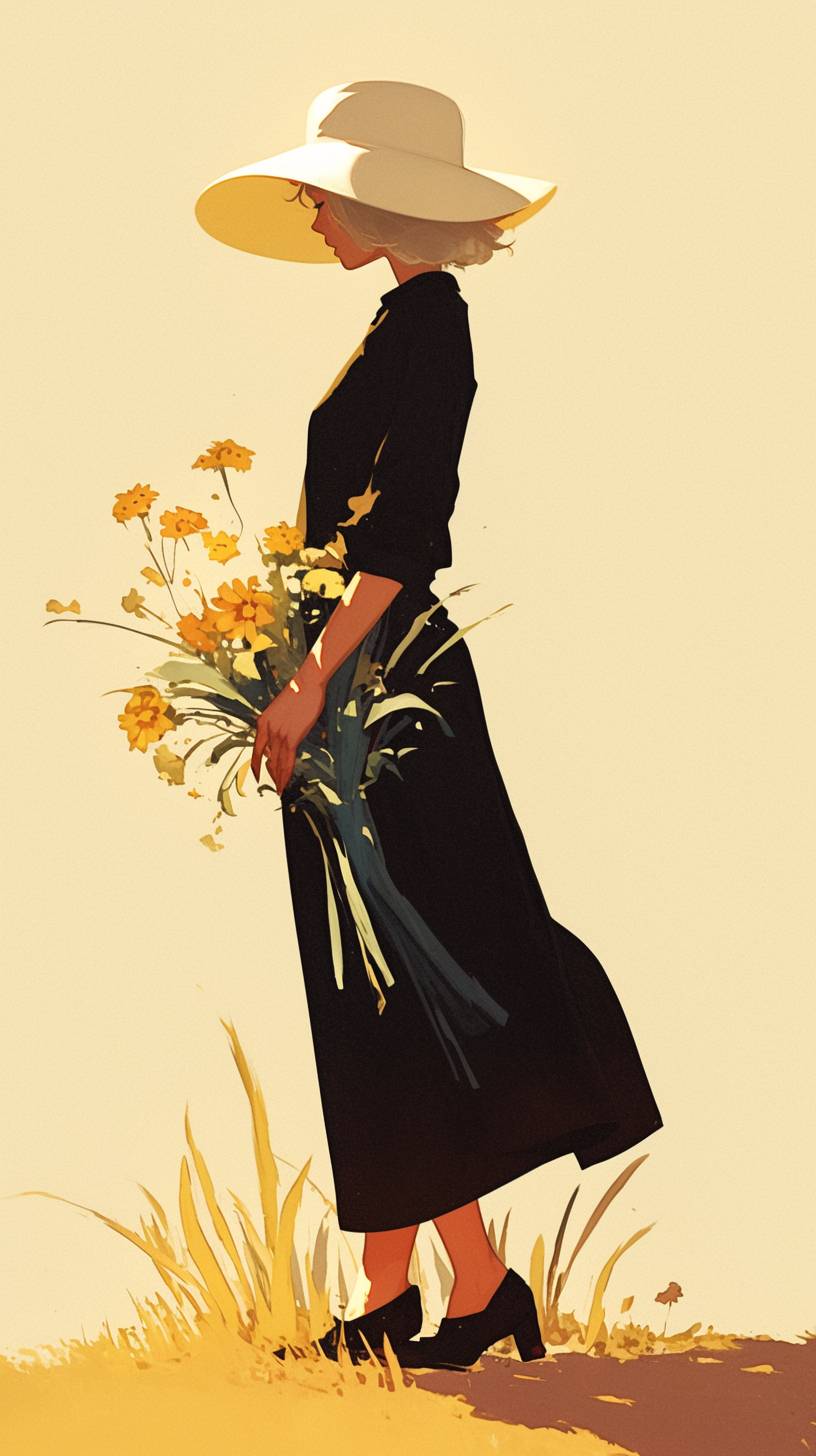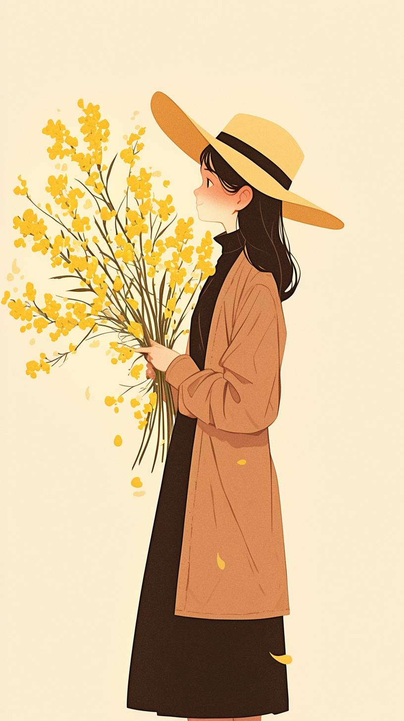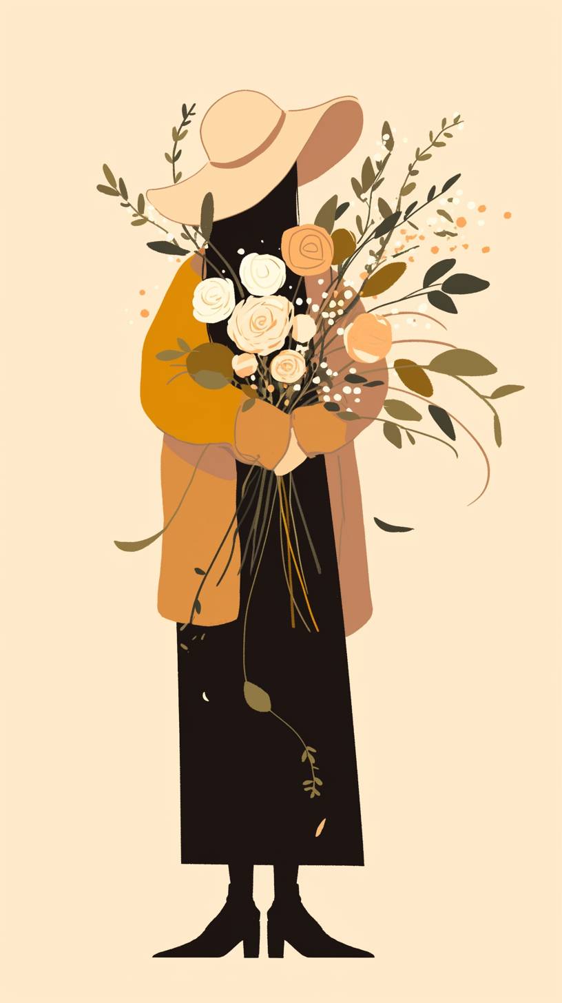 모자를 쓰고 신선한 꽃을 들고 있는 소녀, 미니멀리즘, 따뜻한 덴마크 디자인, 기하학적, 전신 샷, 고품질, HD, 2K.