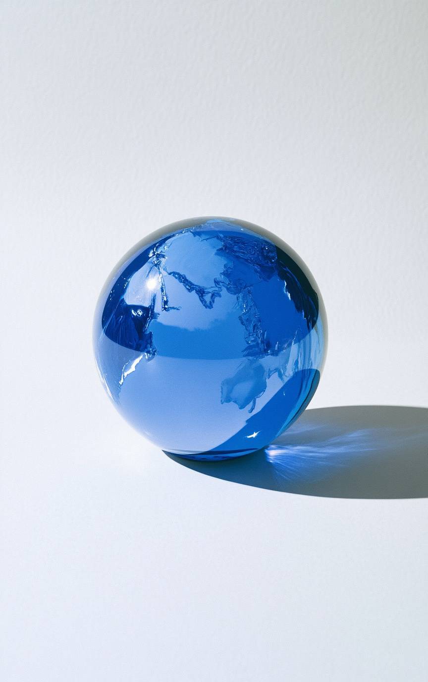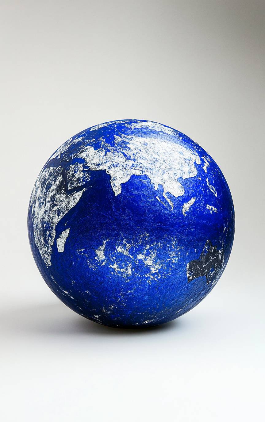 균일한 흰색 배경에 균일한 파란 지구본, 이브 클라인 스타일로.