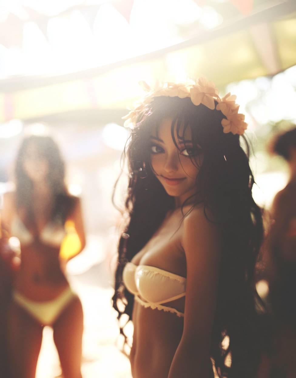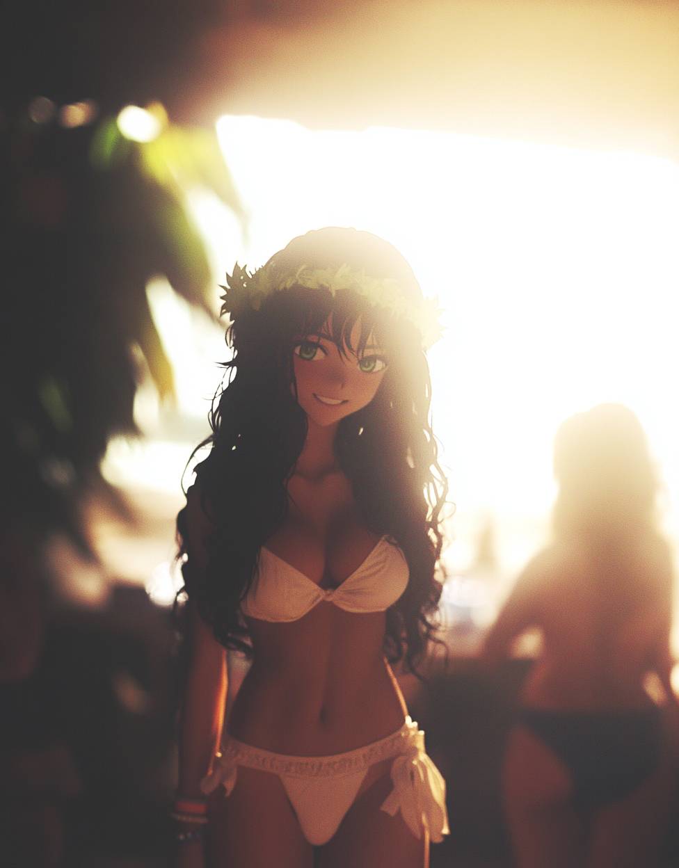 비치 파티에 참석한 할터탑과 미니스커트를 입은 애니메이션 소녀, 태양에 그을린 피부와 활기찬 파티 장면.
