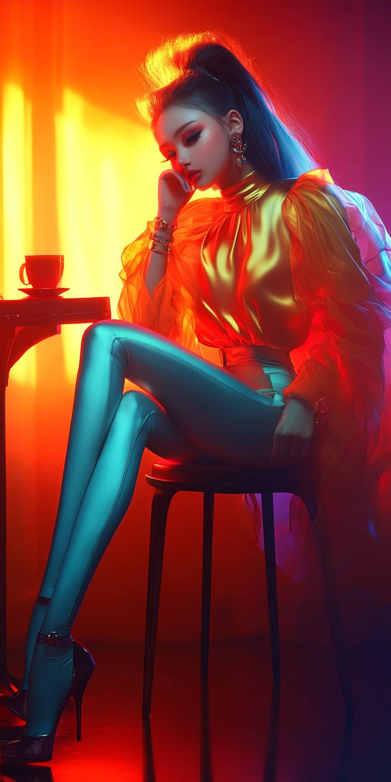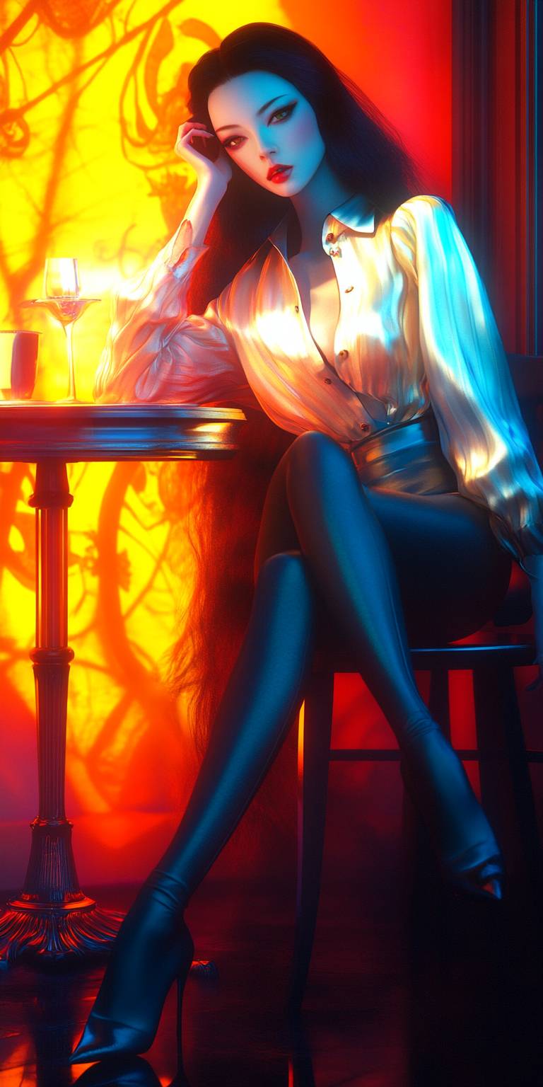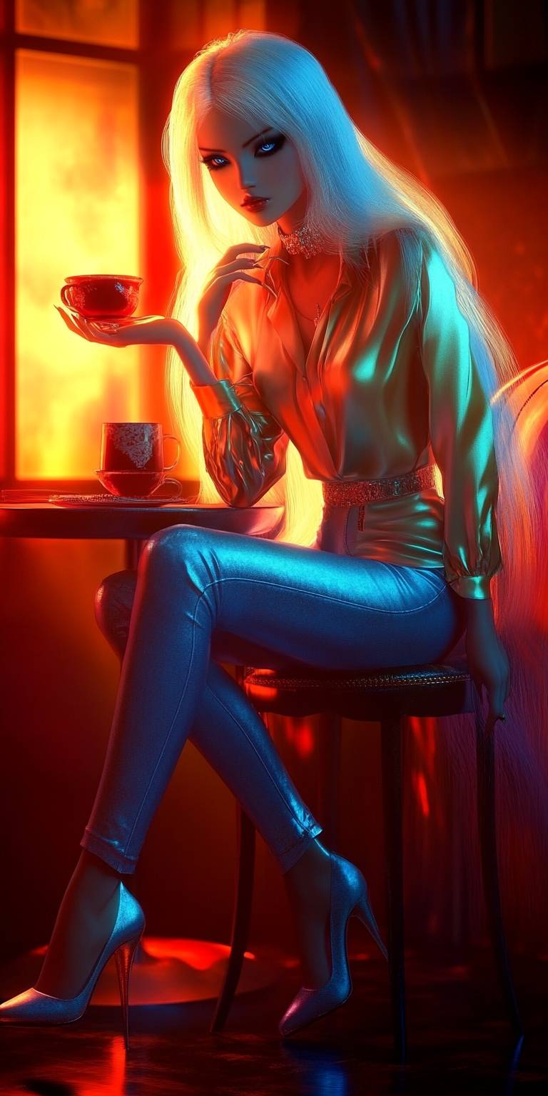 애니메이션 여성 캐릭터, 캐주얼 우아함, 실크 블라우스, 핏된 청바지, 하이힐, 햇살 가득한 카페.