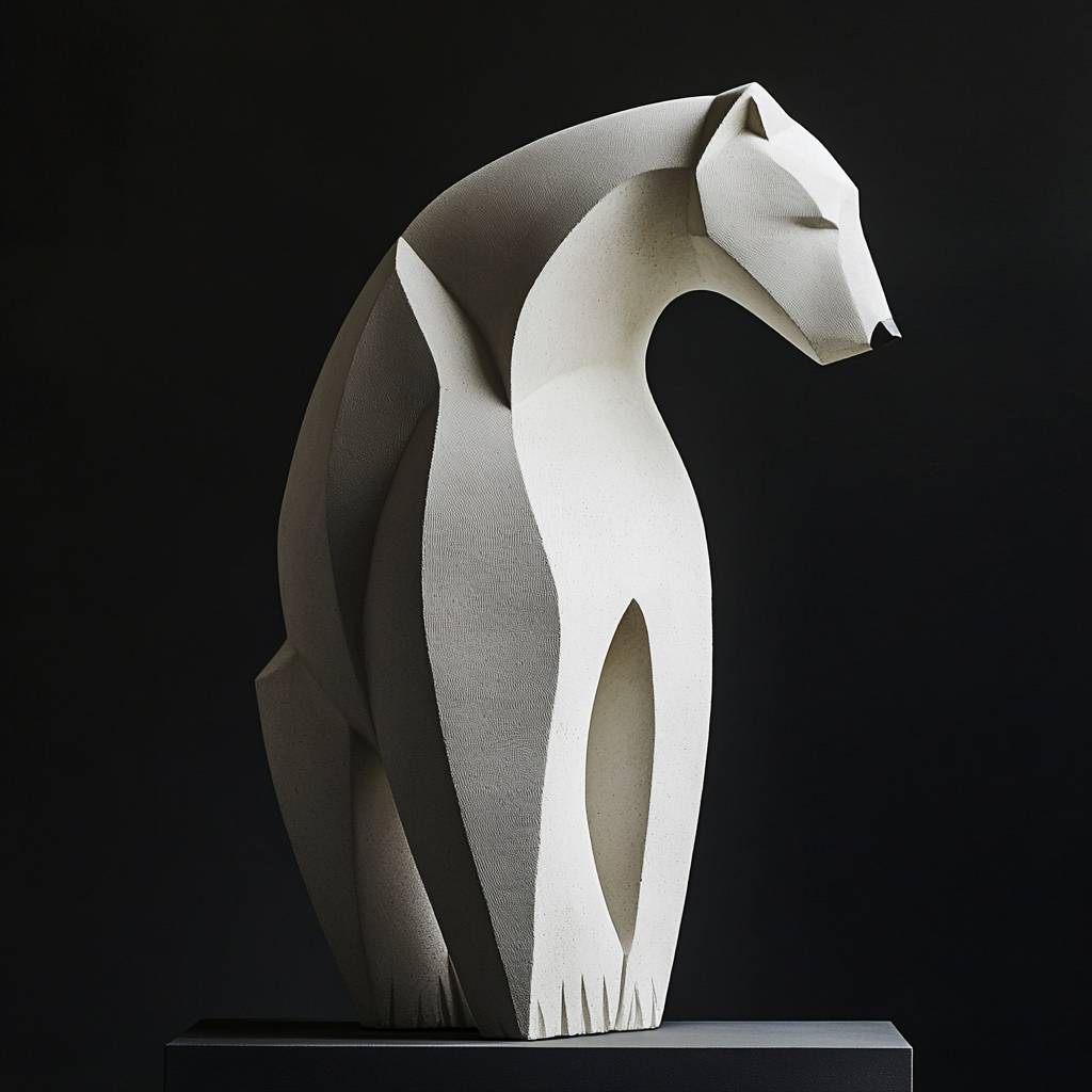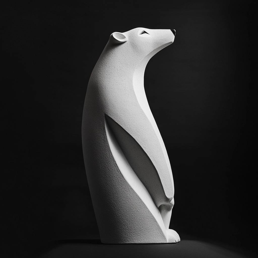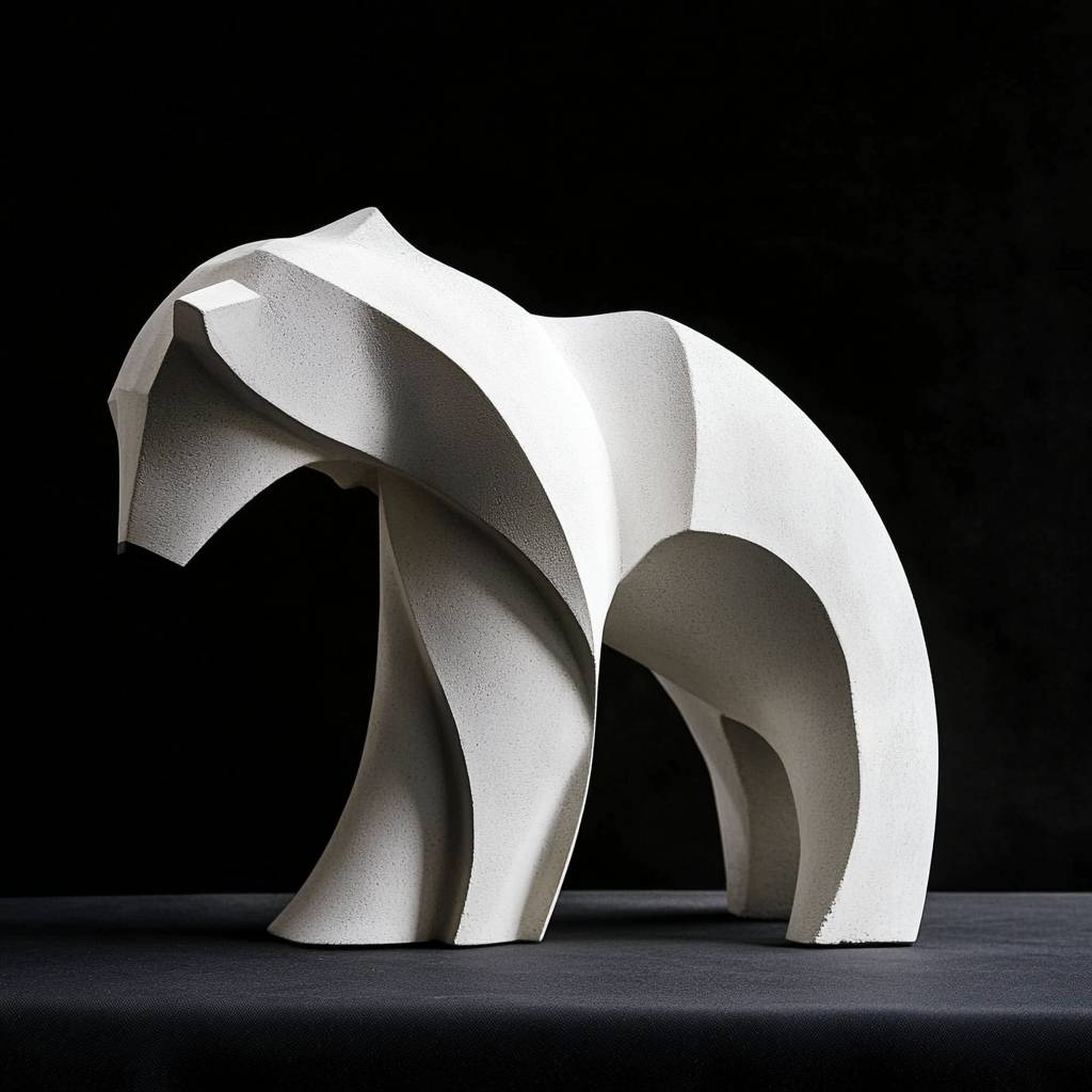 날카로운 모서리와 부드러운 곡선을 가진 흰색 콘크리트 조각물인 북극곰입니다. 두 다리로 서 있고 머리를 치켜들고 있으며, 곡선 모양이 공격적인 외관을 부여합니다. 최소한의 스타일로 단순한 형태와 매끄러운 질감과 표면을 검은 배경에 나타냅니다.