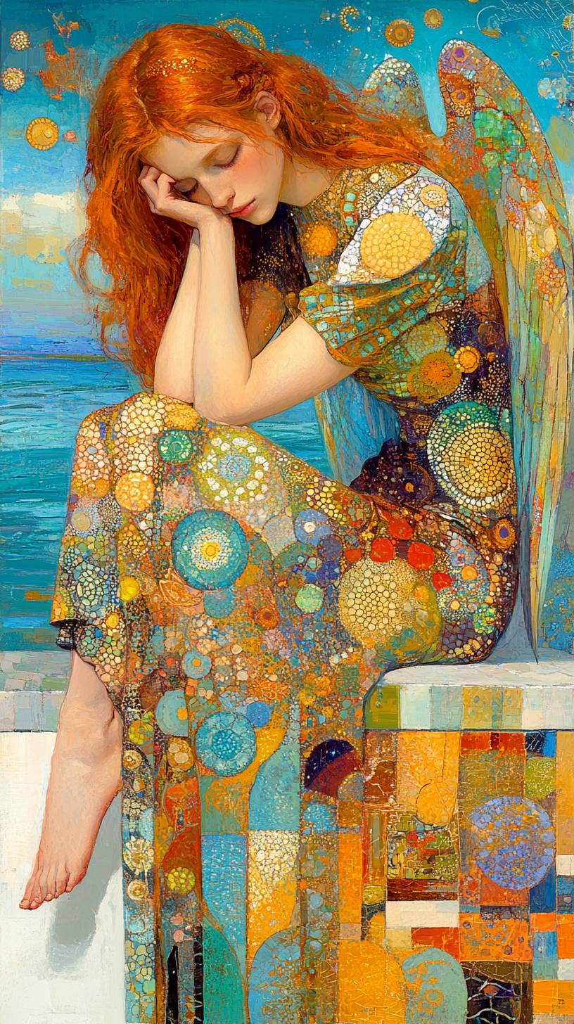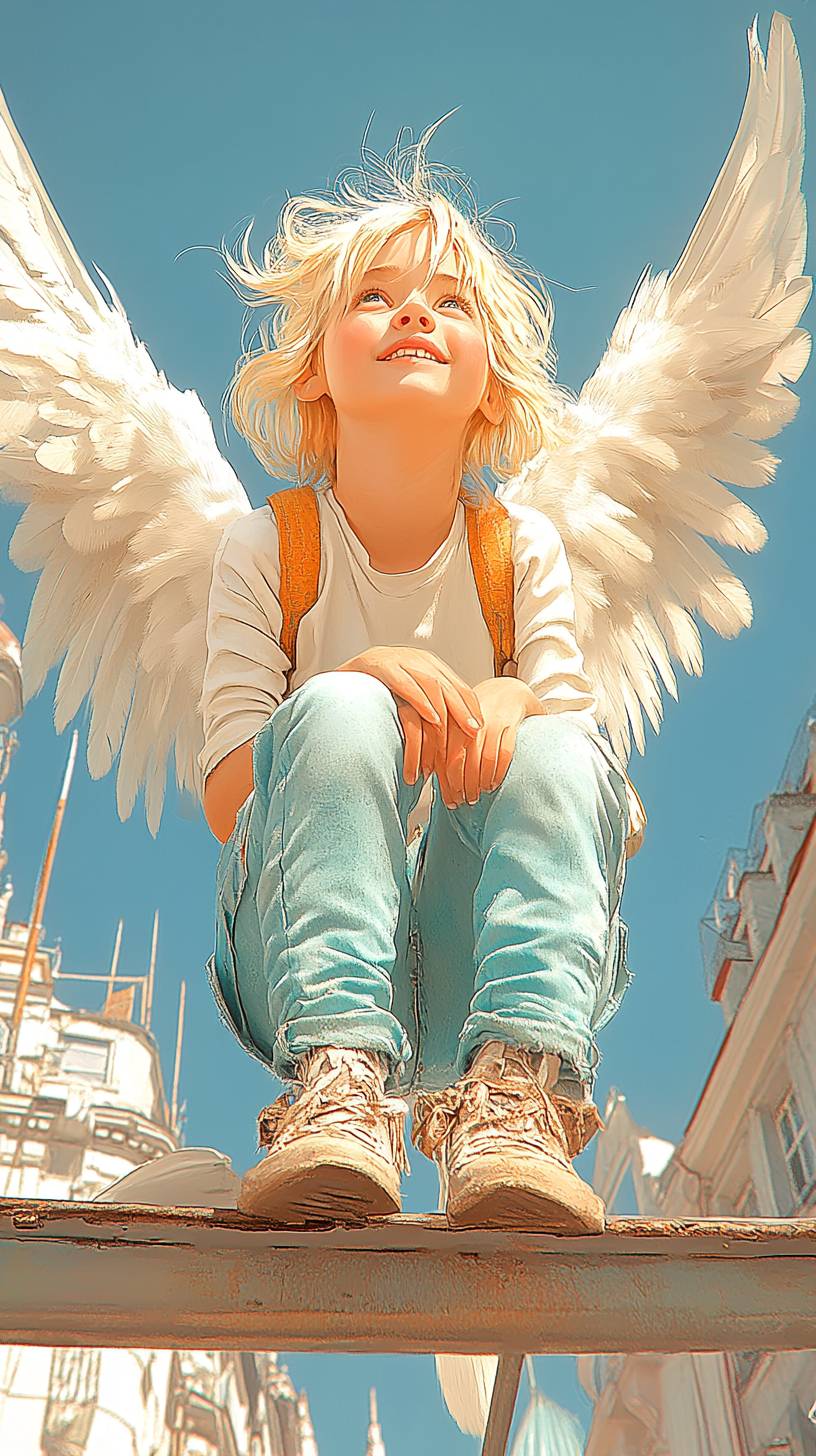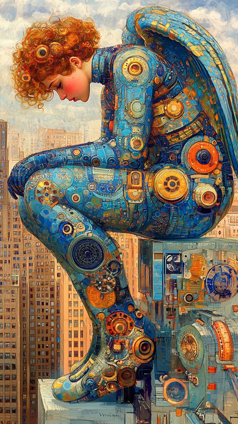 a painting of an angel sitting on top of a building, a detailed painting, by ,Victor Nizovtsev, fantasy art, beautiful armor, fantasy card game art, close up high detailed, angel a nice girl sitting on a rooftop with wings, ultra-detailed --chaos 75 --ar 9:16 --style raw --personalize te6jts6 --stylize 1000 --v 6.1