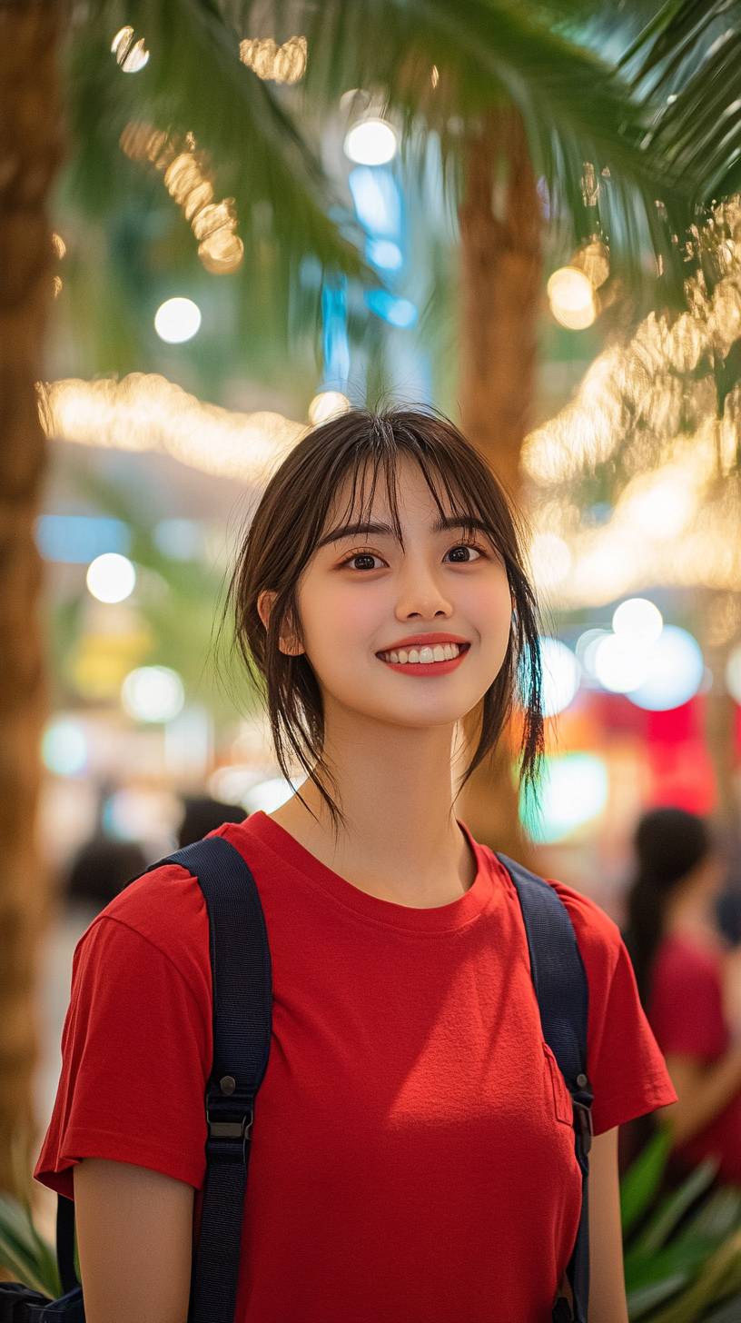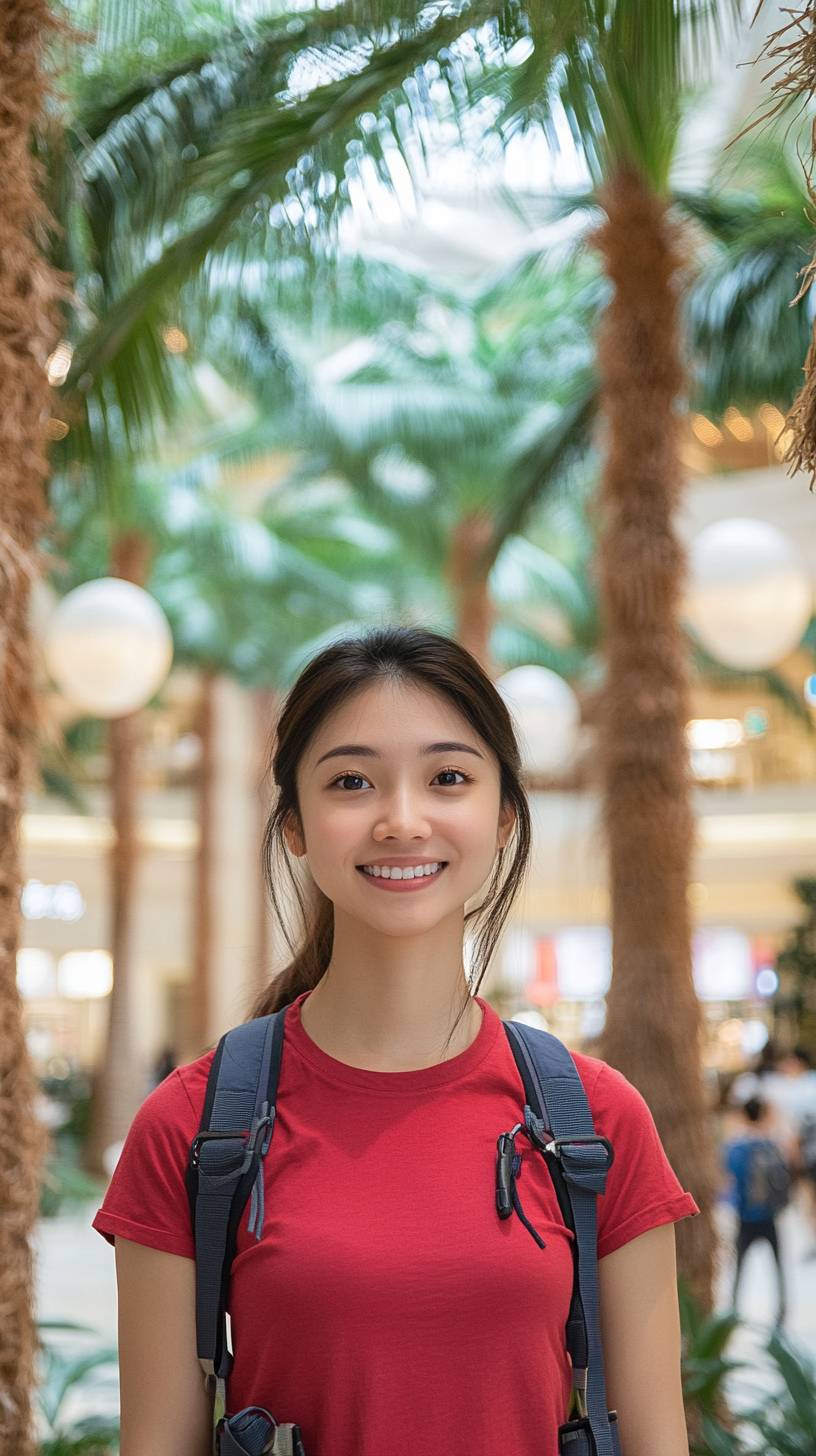 Composition style happy photo of smiling Chinese woman wear red t shirt with dark blue safety harness standing in front of 1 coconut tree in shopping mall, short hair, high resolution, model, front view, potrait, indoor mall background, super realistic, facing camera --ar 9:16 --stylize 250 --v 6.1