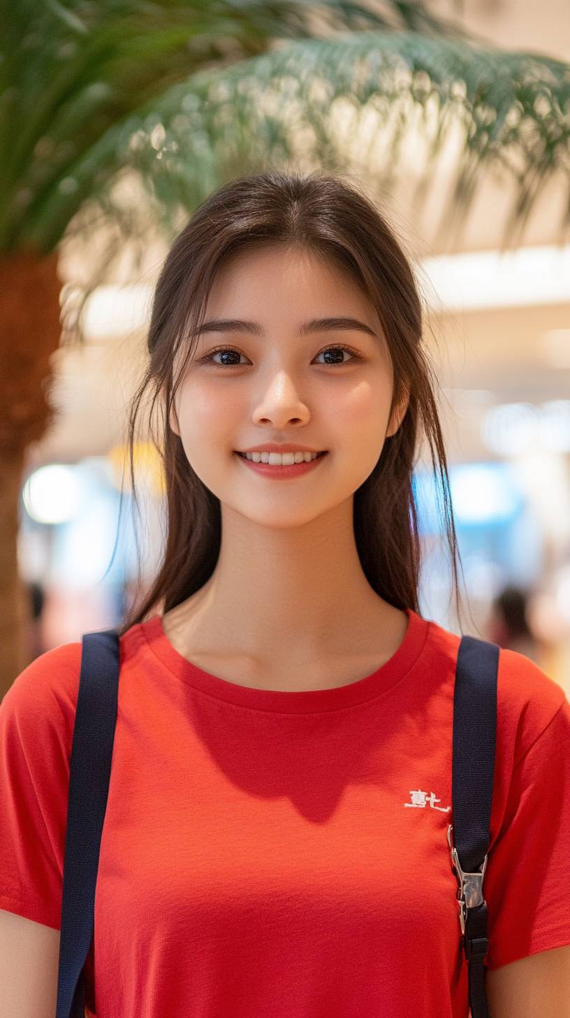 이 사진은 쇼핑몰 앞에서 웃고 있는 빨간 T셔츠를 입은 중국 여성의 고해상도 사진입니다.