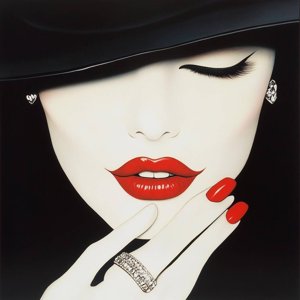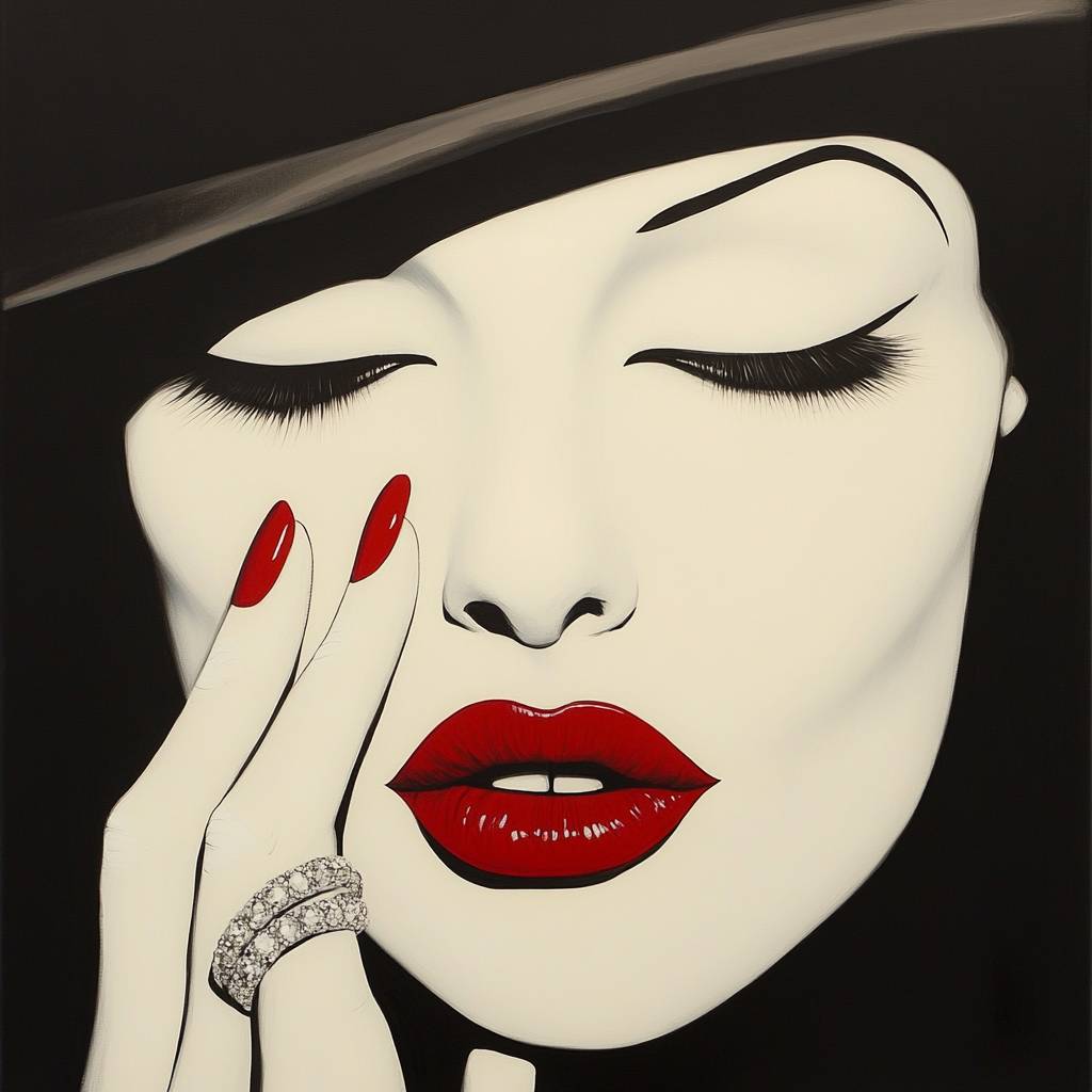 검은 모자와 다이아몬드 반지를 착용하고, 입술에 손을 대고 눈을 감은 빨간 립스틱을 바른 하얀 얼굴, 패트릭 나겔 스타일.