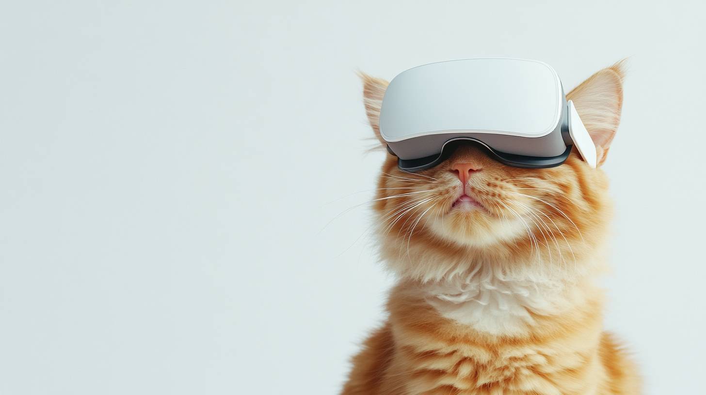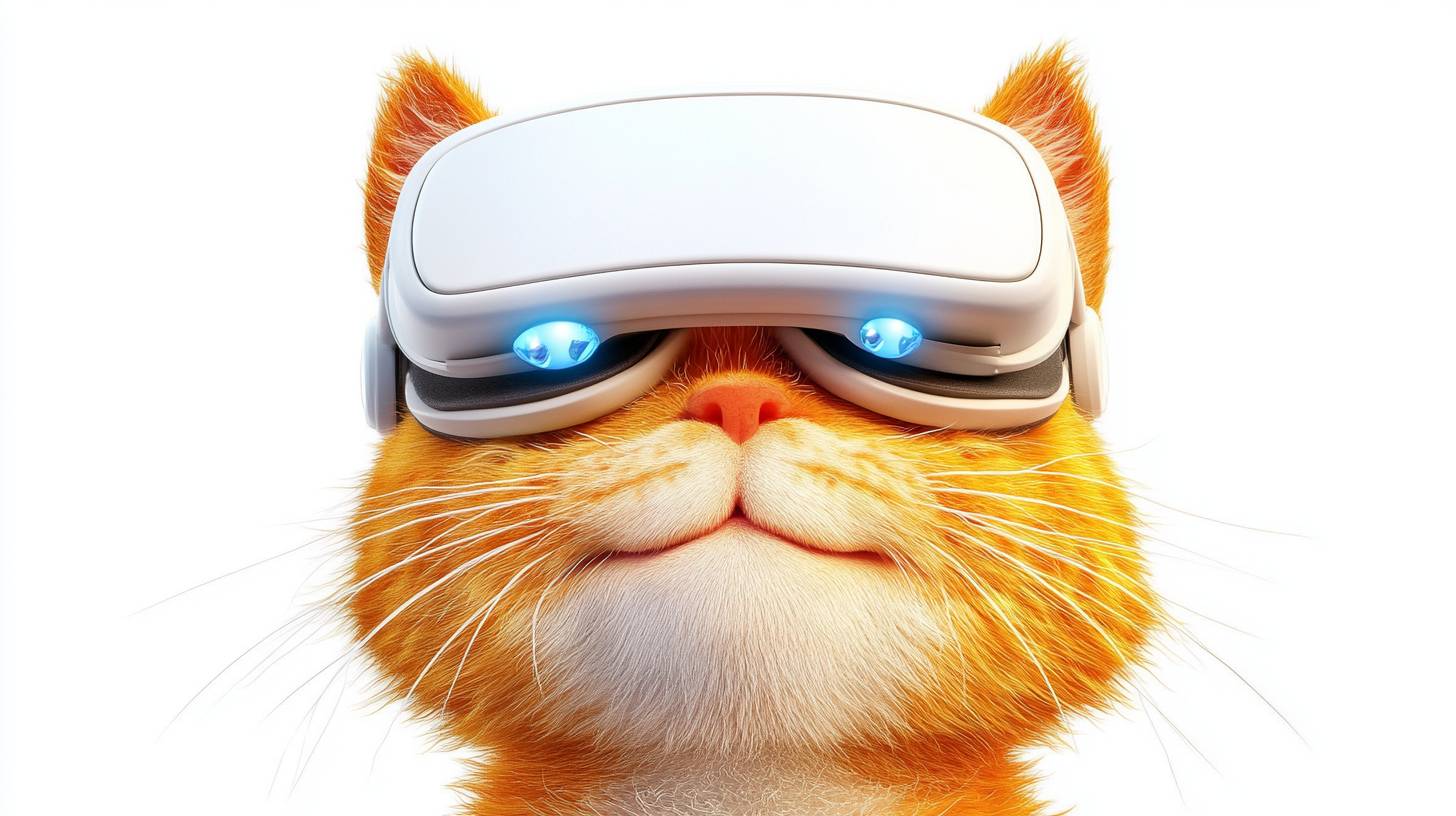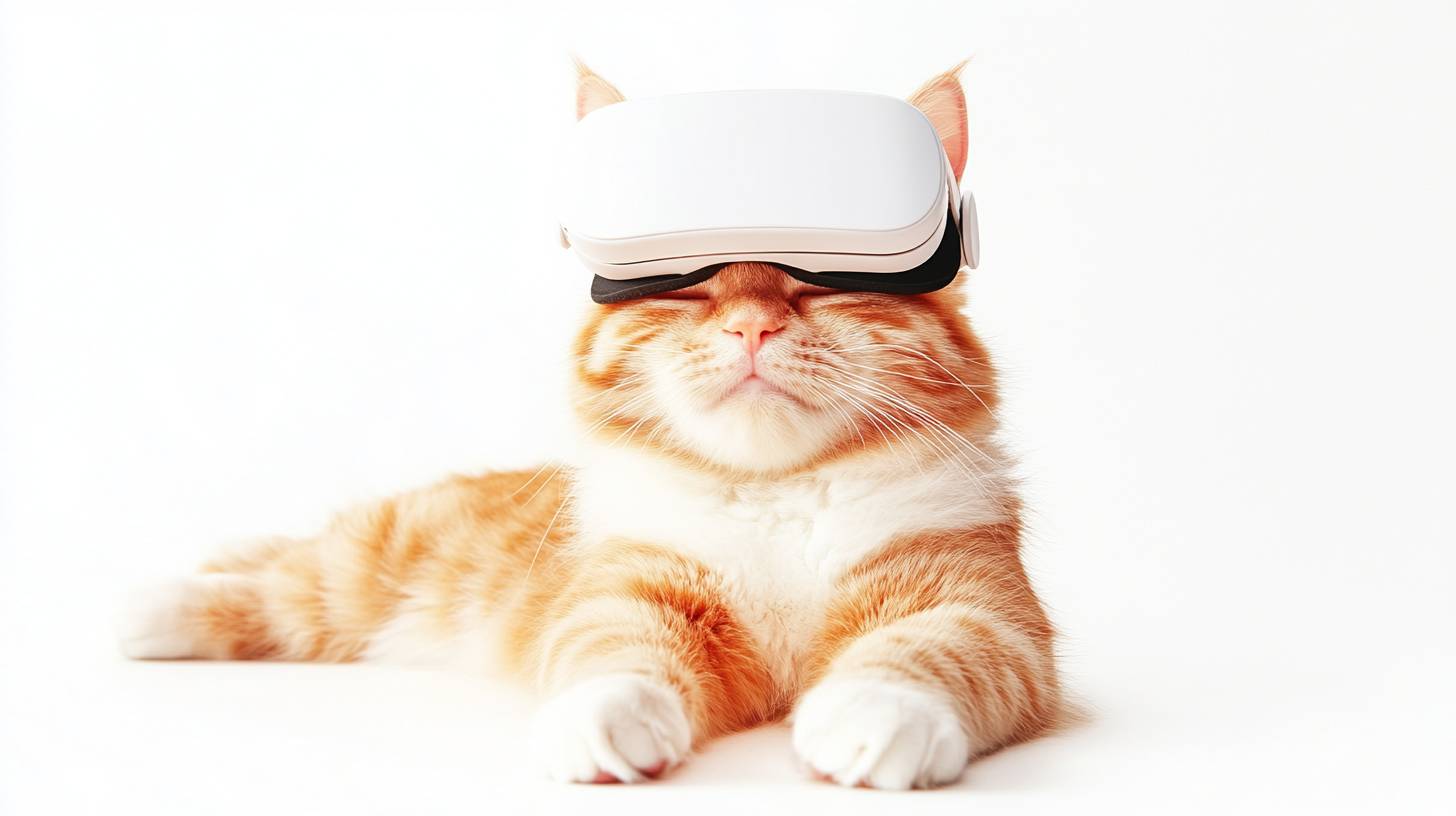 귀여운 주황색 고양이가 흰색 VR 헤드셋을 머리에 쓴 채 어설프고 재미있게 보이고 있습니다. 배경은 흰색이며 만화 같은 애니메이션 디자인입니다.