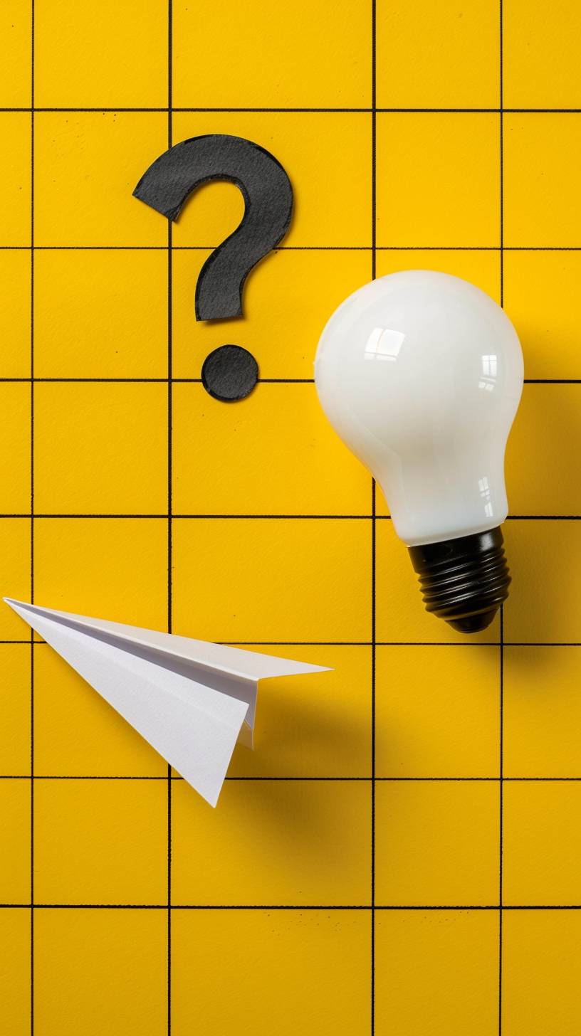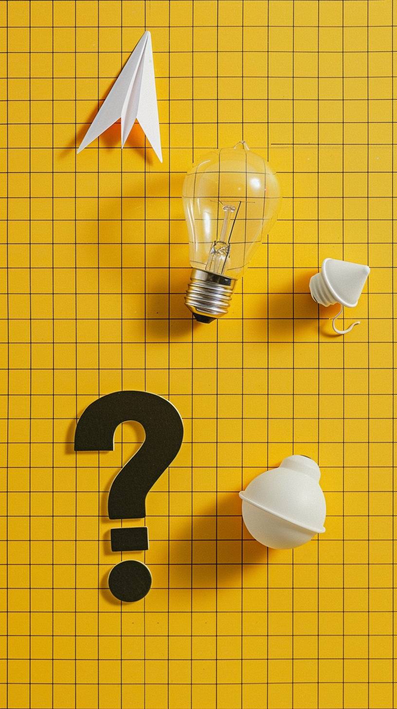 검은색 물음표, 흰색 전구, 노란 밝은 격자 위의 종이 비행기.