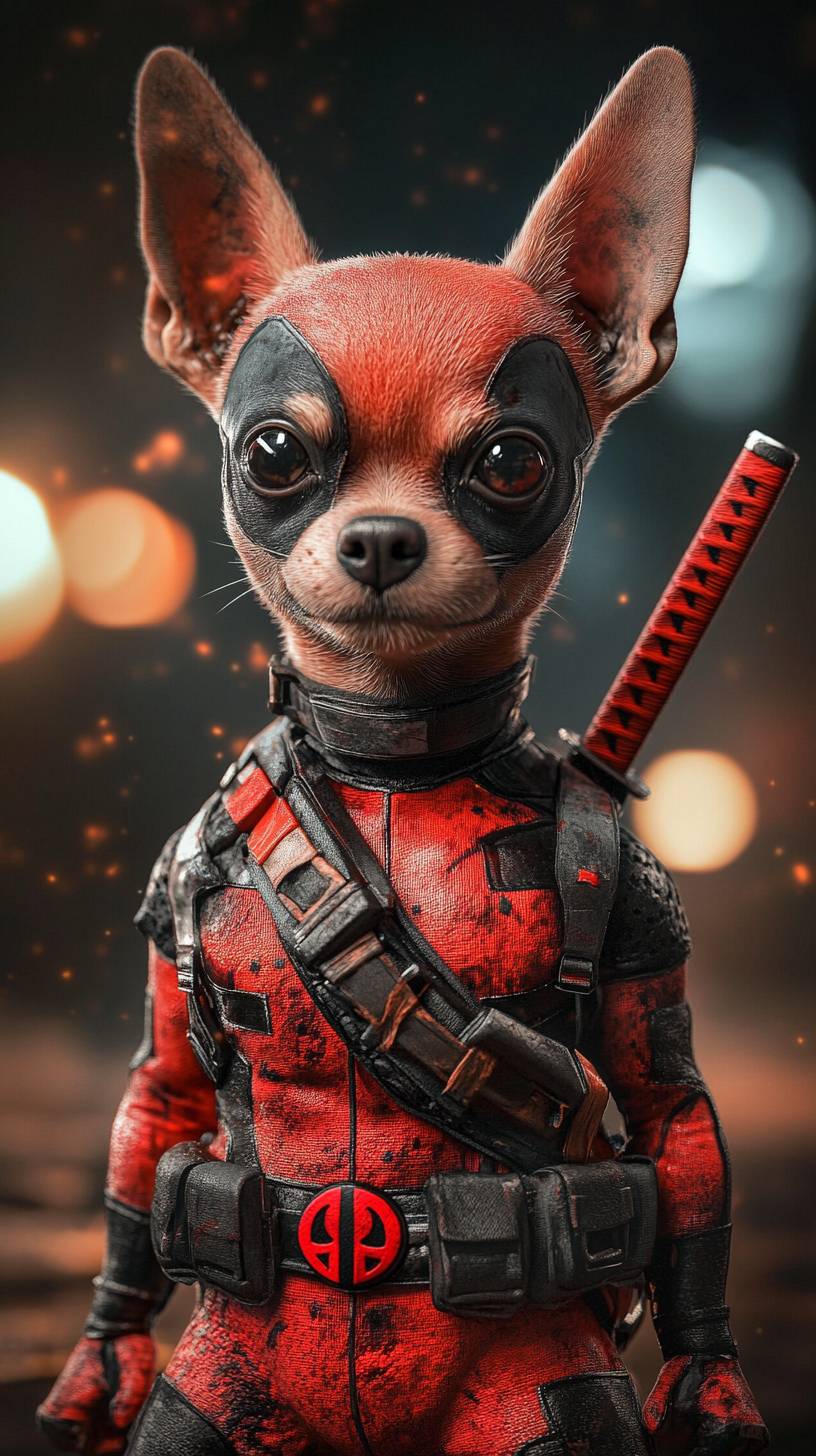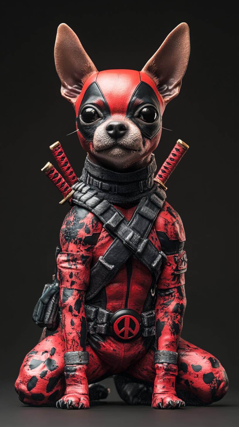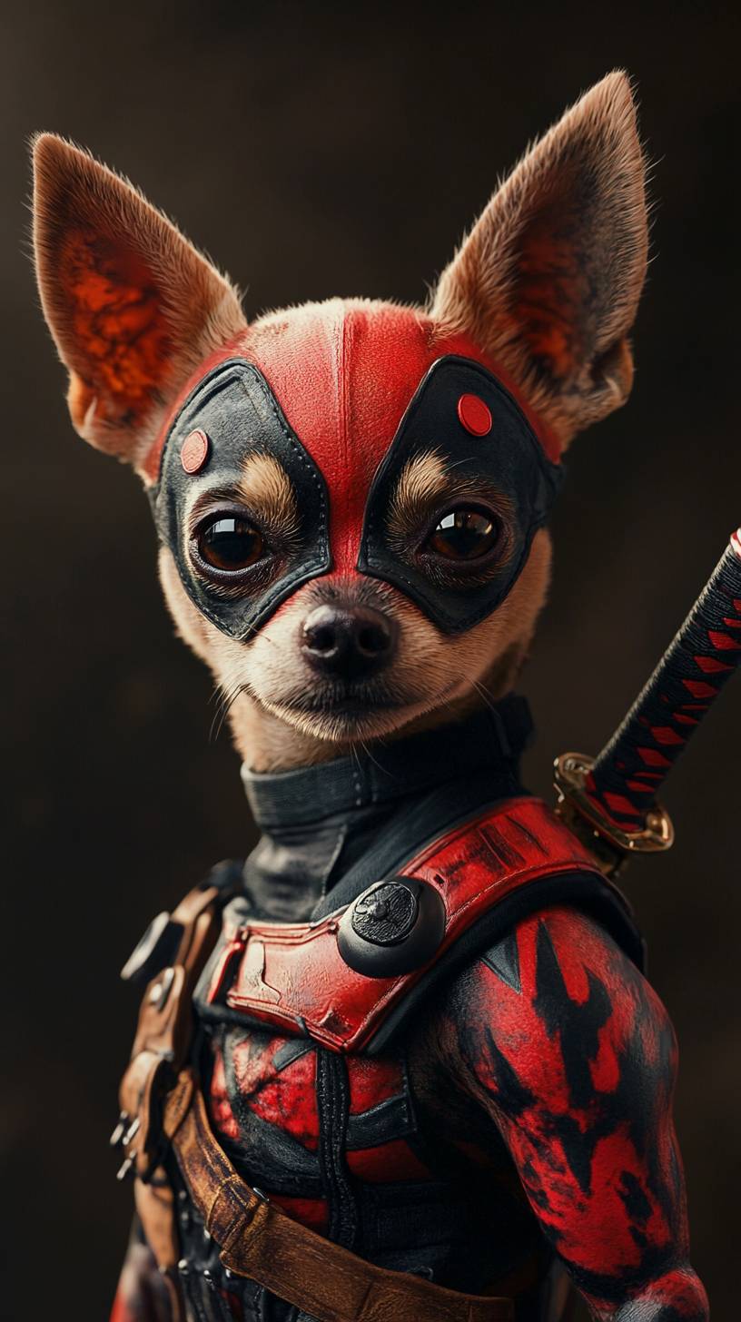 작고 근육질의 치와와로, 짧고 매끄러운 털을 가진 털을 가지고 있으며, 얼굴은 빨간색과 검은색 패턴으로 덮여 있어 데드풀의 상징적인 의상과 유사합니다. 장난기 많고 기민한 눈은 유머로 반짝이며, 작고 미니어처 장착된 하네스를 착용하고 있고, 등에는 미니어처 카타나가 교차하고 있어 혼란스러운 에너지와 매력을 발산하고 있습니다.