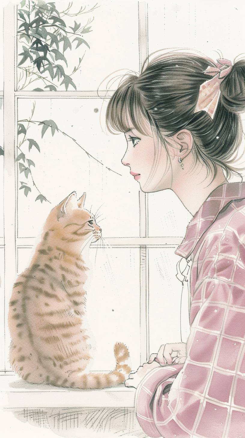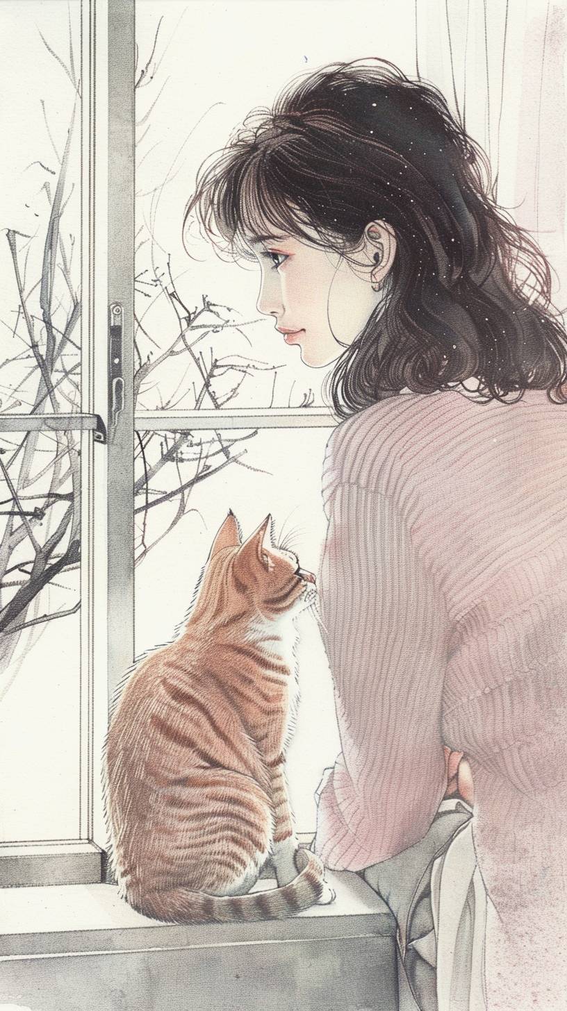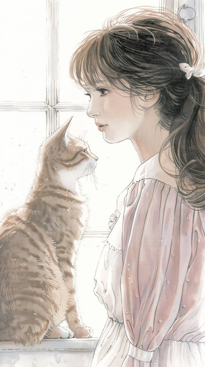갈색 머리를 가진 소녀와 그녀의 오렌지색 타비 고양이가 창턱에 있다.