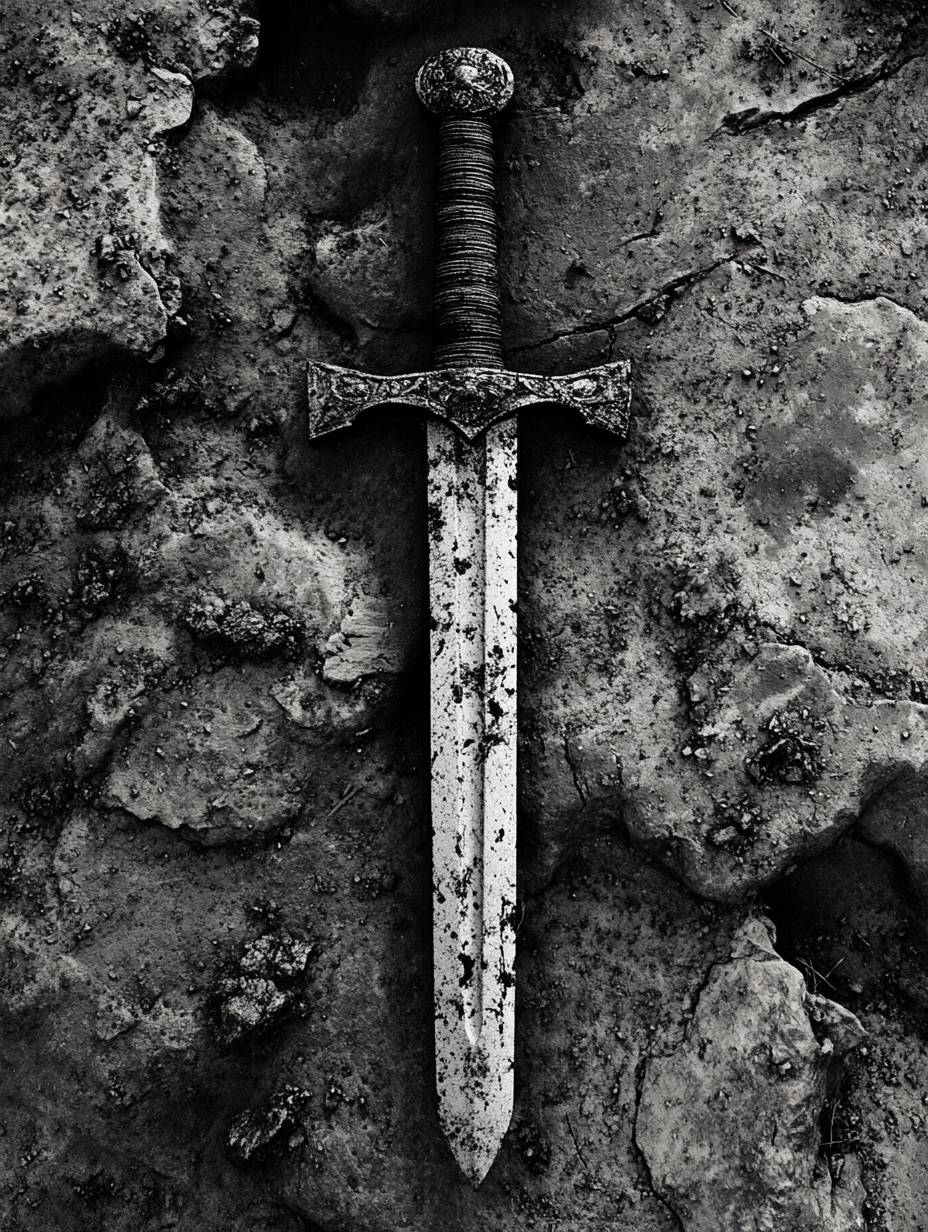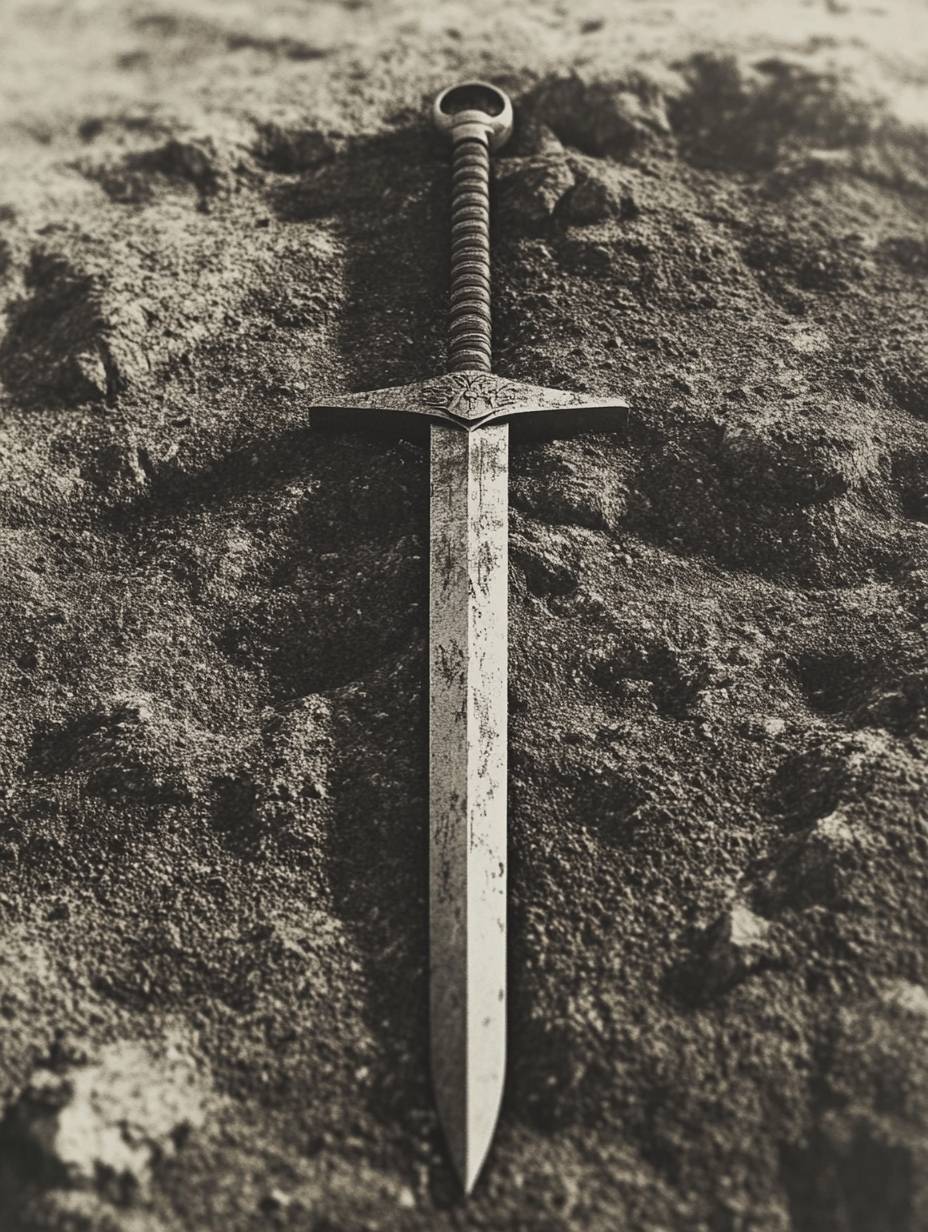 A sword thrust into the rough earth, black and white, vintage poraloid --ar 3:4 --style raw --v 6.1