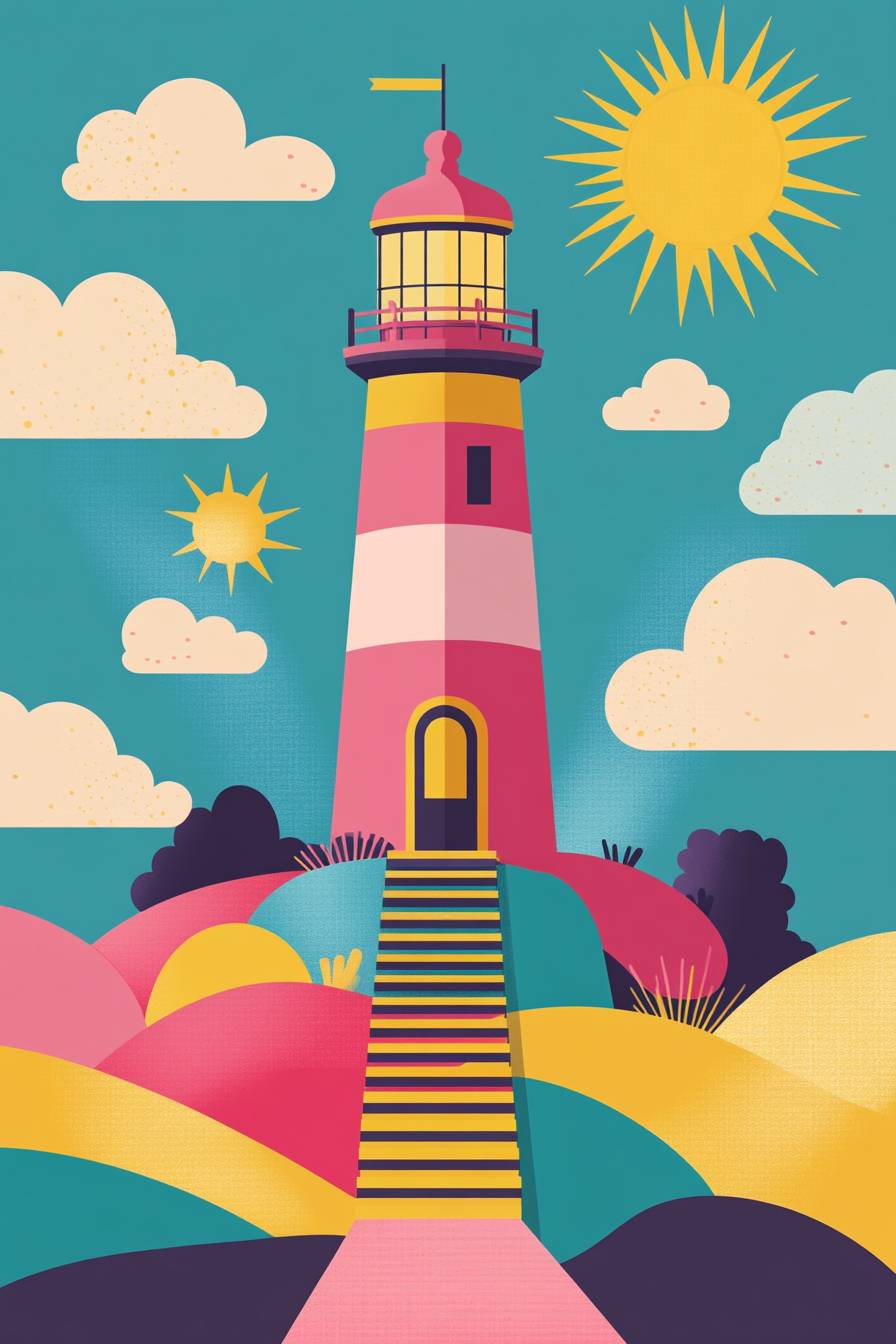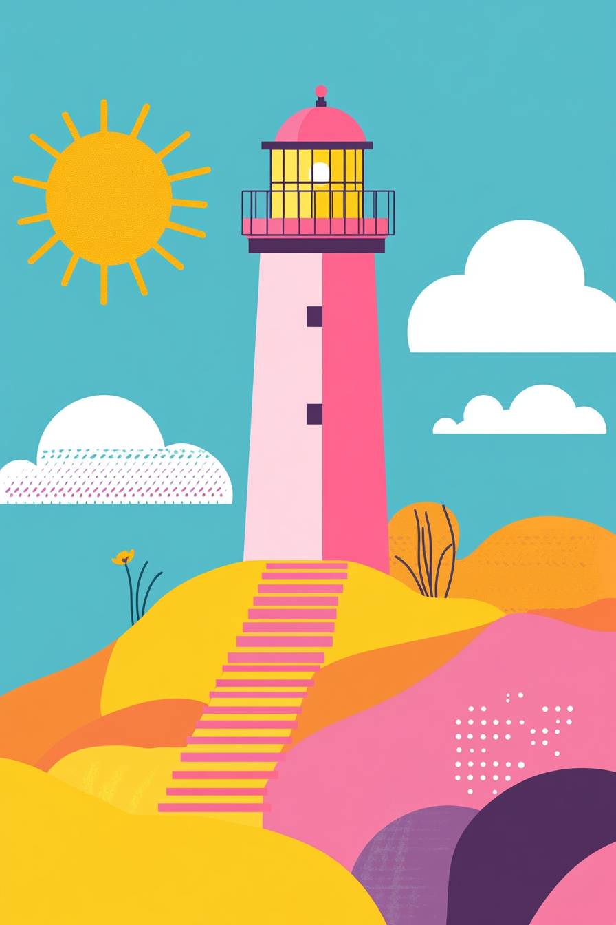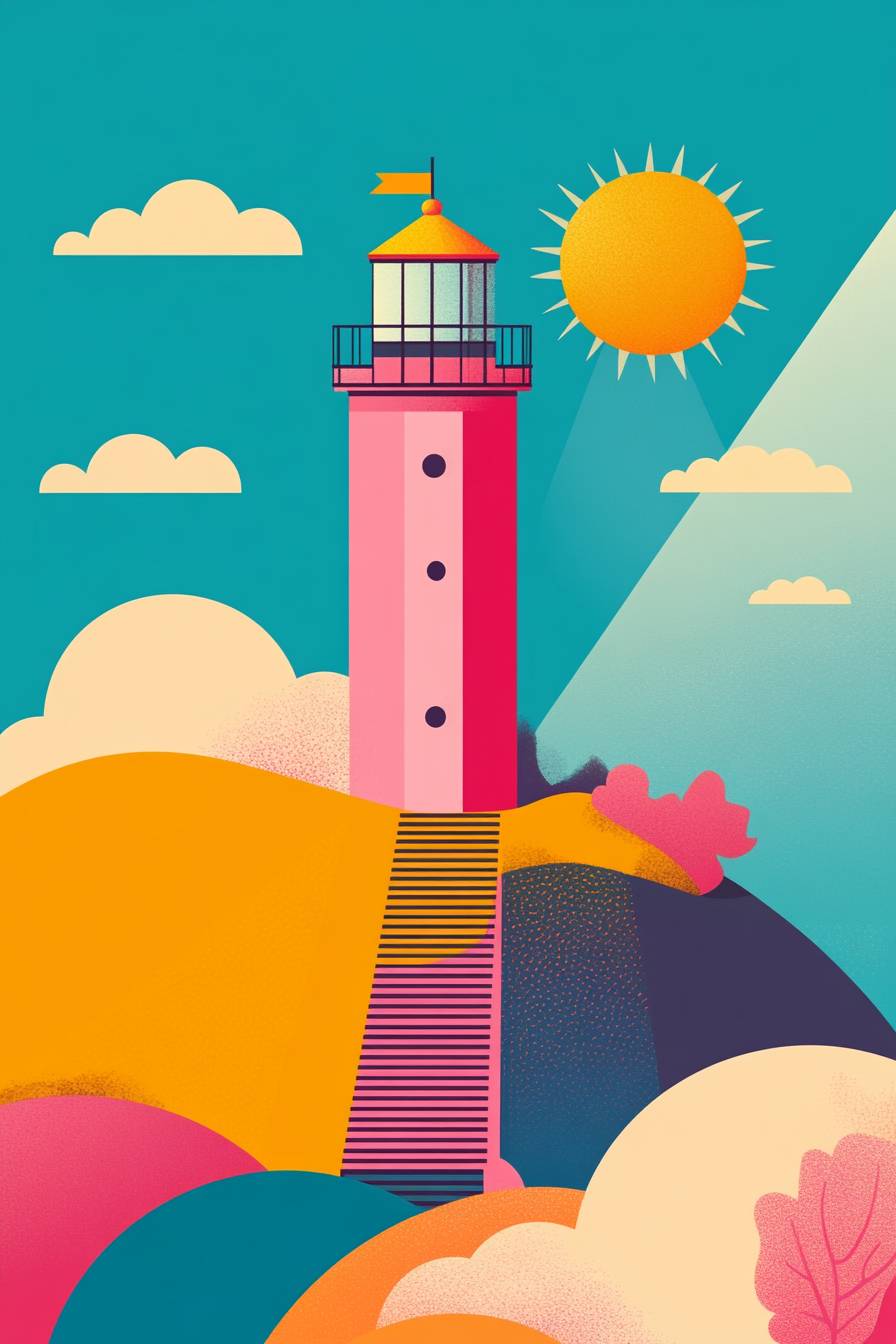 밝은 분홍색과 노란색의 등대를 묘사한 화려한 일러스트로, 구름과 언덕 그리고 태양이 둘러싸인 장면을 단순하고 기하학적인 스타일로 표현했습니다.