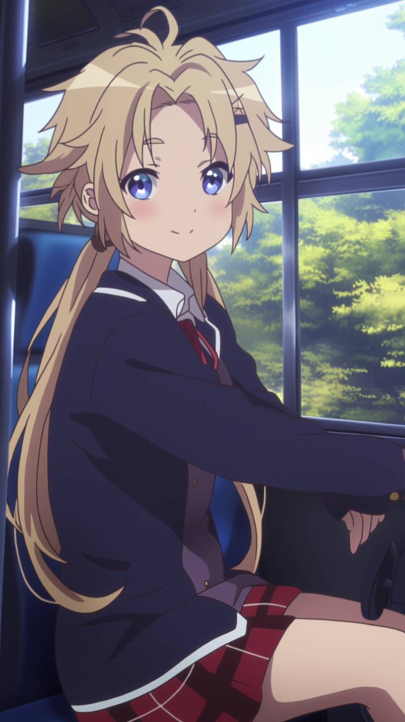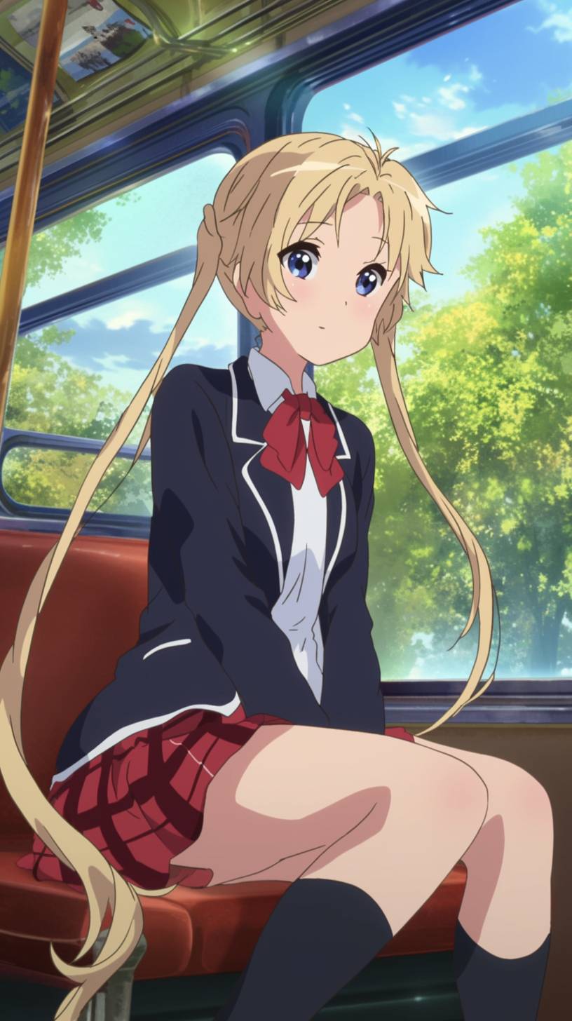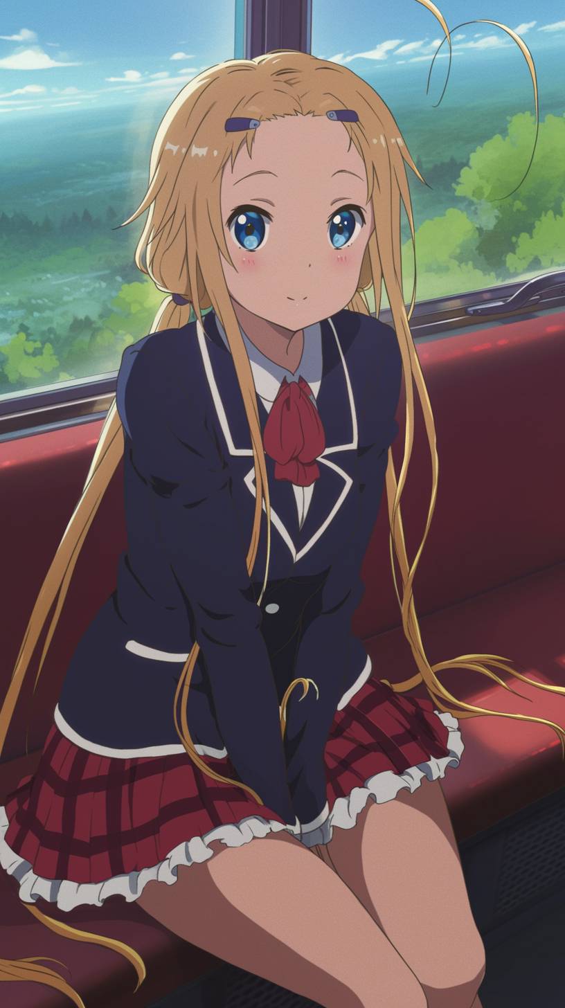 Cheerful and playful, Dekomor Sanae from the anime 'Love, Chunibyo & Other Delusions!' anime girl with long blonde hair styled into two long pigtail braids, her traditional Japanese school uniform with a navy blazer, white shirt, and a red skirt with prominent white edges fluttering around her. She sat on the bus and looked out at the scenery, lush with greenery, with a cute expression on her face . She doesn't have double meatballs,8K --ar 9:16 --style raw --niji 6