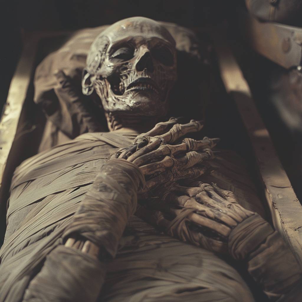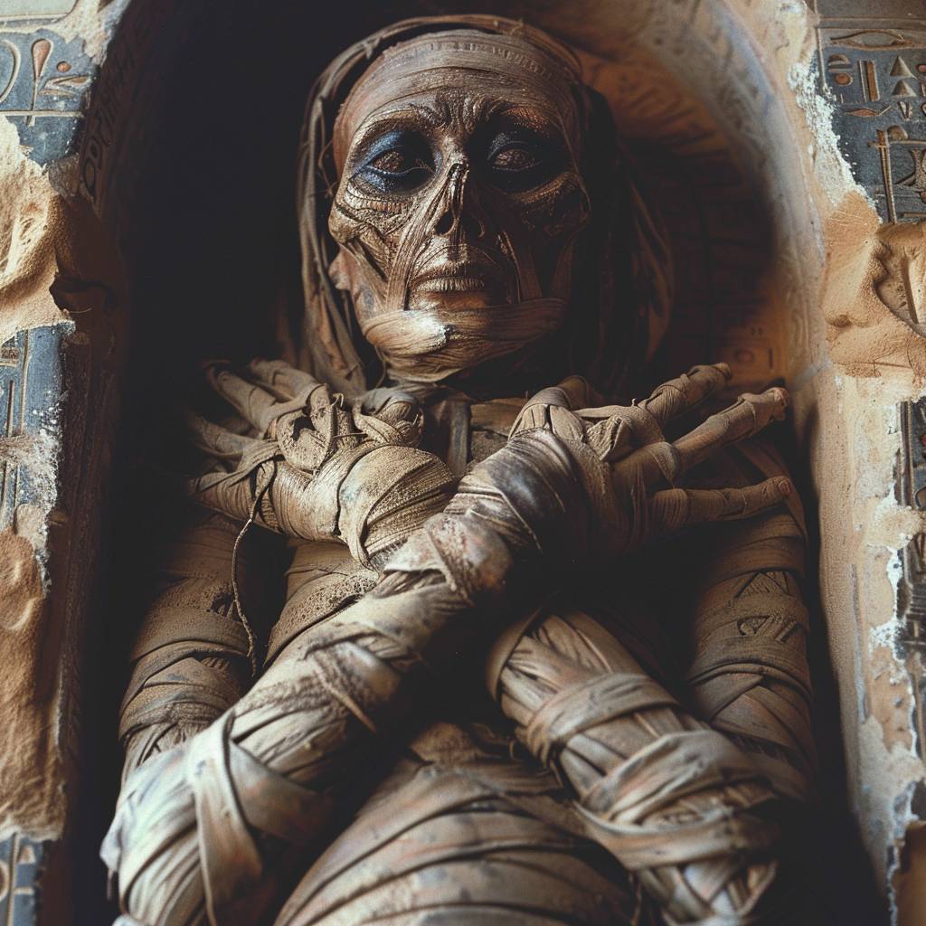 아름답고 무서운 이집트 미라가 관객과 플러팅하며, 부패하고 썩어가는 모습으로 석관에서 기어 올라와 관객을 향해 덤벼드는 모습. 대칭적인 전신 초상사진, 우아하고 매우 세밀하며 부드러운 환경 조명, 삼분할 법칙, 전문 HD 사진, 영화, 소니, 초상, 코닥 폴라로이드 3200dpi 스캔 중형 필름 Portra 800, 조엘-피터 위트킨 + 다이앤 아버스 + 리애넌 + 마이크 탕이 촬영한 화려한 색상의 초상사진.