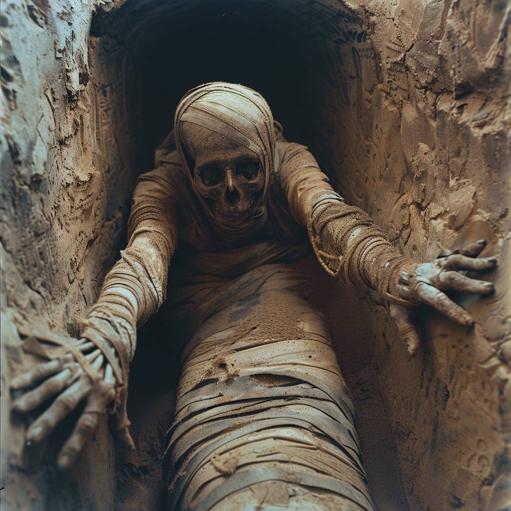 아름답고 무서운 이집트 미라가 관객을 향해 몸을 비틀며 다가오고, 대칭적인 전신 초상화를 보여주며, 세부 사항이 풍부하고 전문적인 HD 사진으로 생생한 색감을 선사합니다.