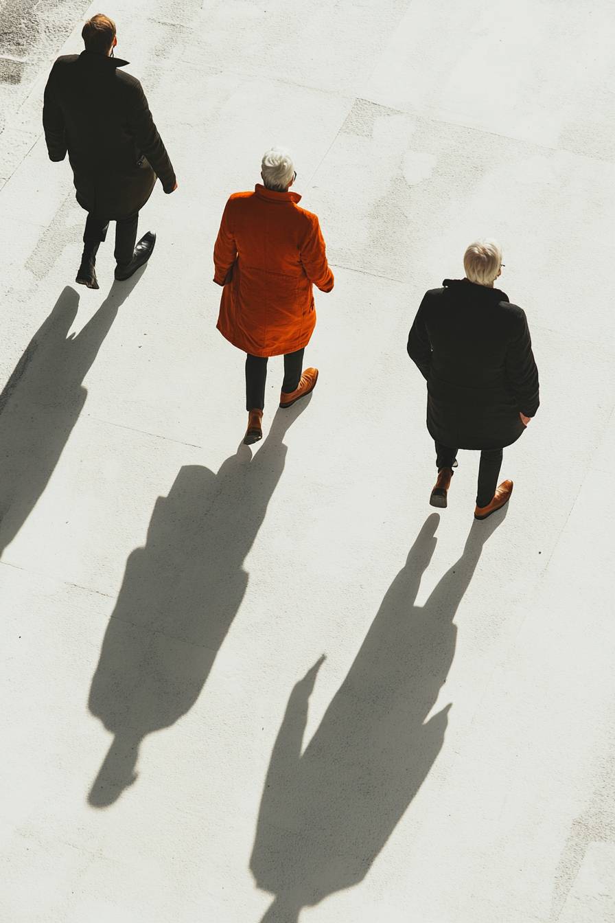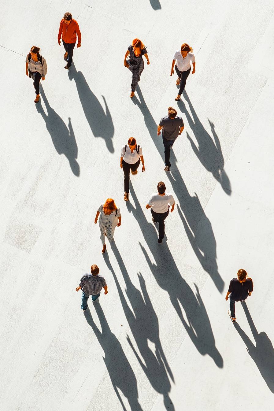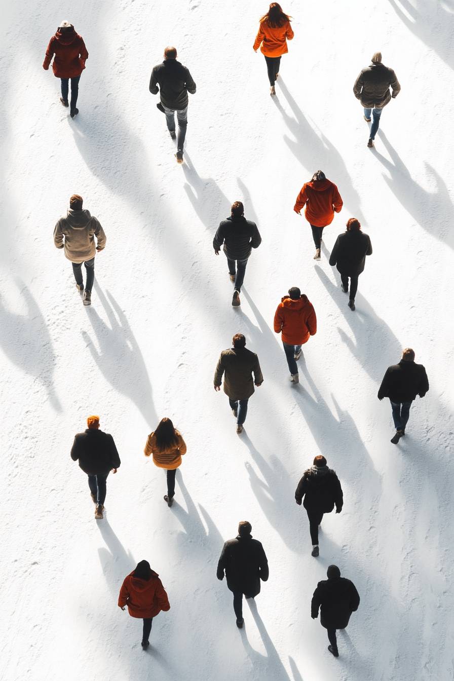 Overhead photography of people walking diagonally, completely white background, studio photo, accentuated shadows, Dutch shot, editorial photography --ar 2:3 --stylize 200 --v 6.1