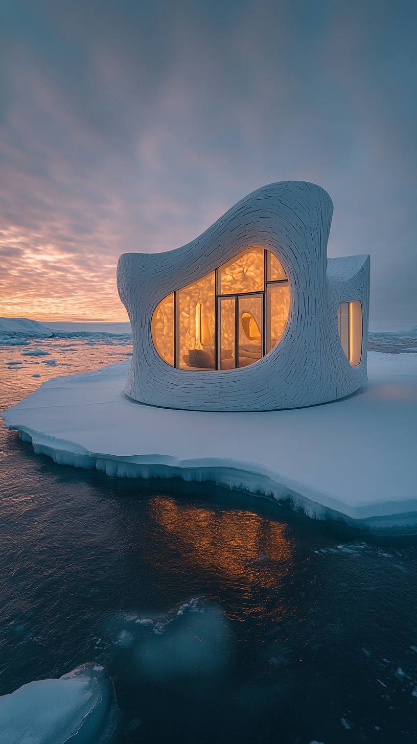 8K 사진, 남극의 광활한 평면을 위에서 바라본 모습, 내부에서 따뜻한 빛을 발하는 종이 공예 조명 박스 건물이 있으며 이 건물은 거대한 흰색 도자기 시트처럼 보이고 종이를 모방한 디자인으로 중국의 공중 랜턴을 연상시킵니다. 북극의 바람에 펄럭이며 눈이 땅을 가로질러 물결치며 거대한 선(禪)과 같은 패턴을 형성합니다. 빙붕과 바닷물이 건물에 다가옵니다.