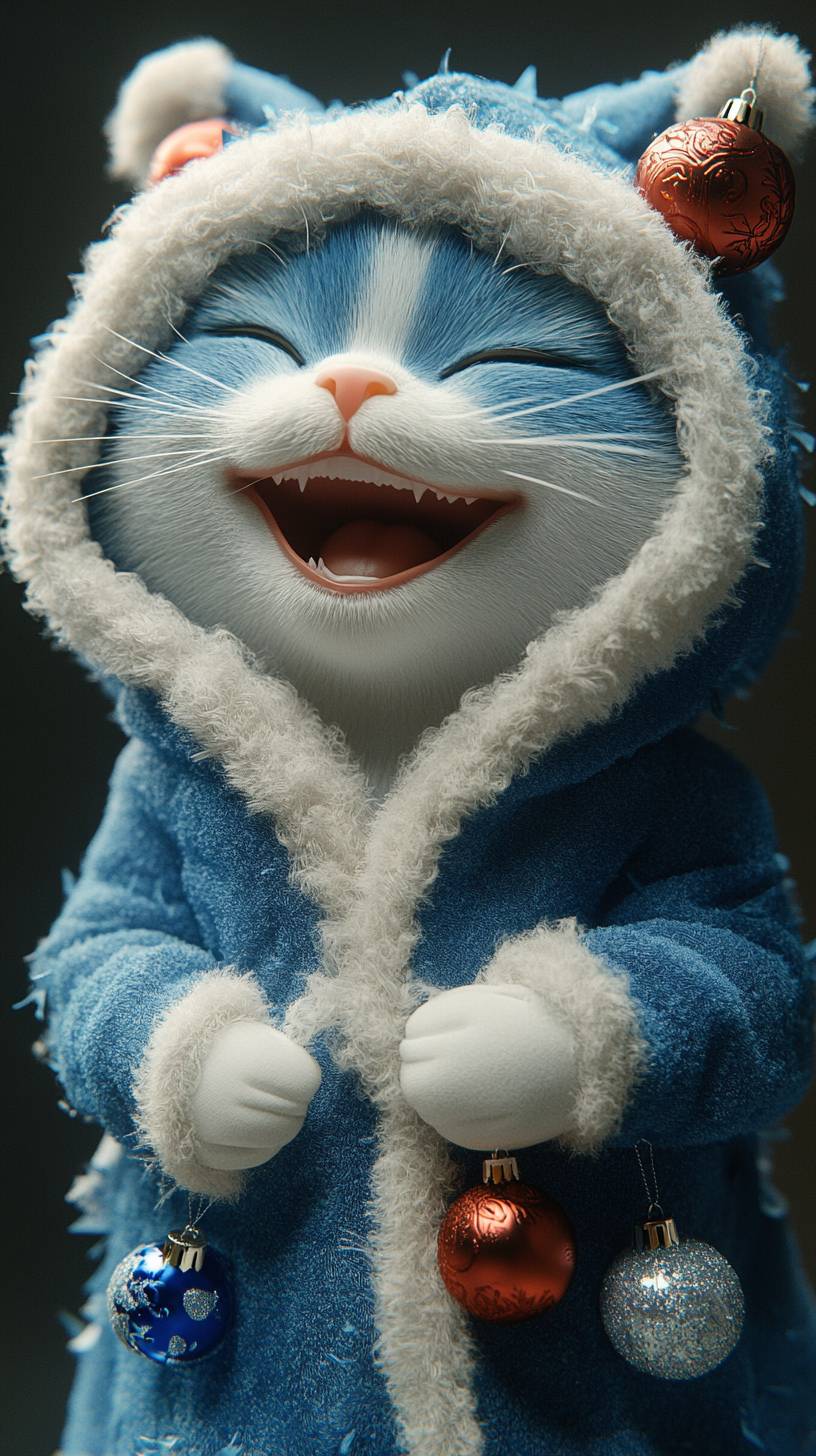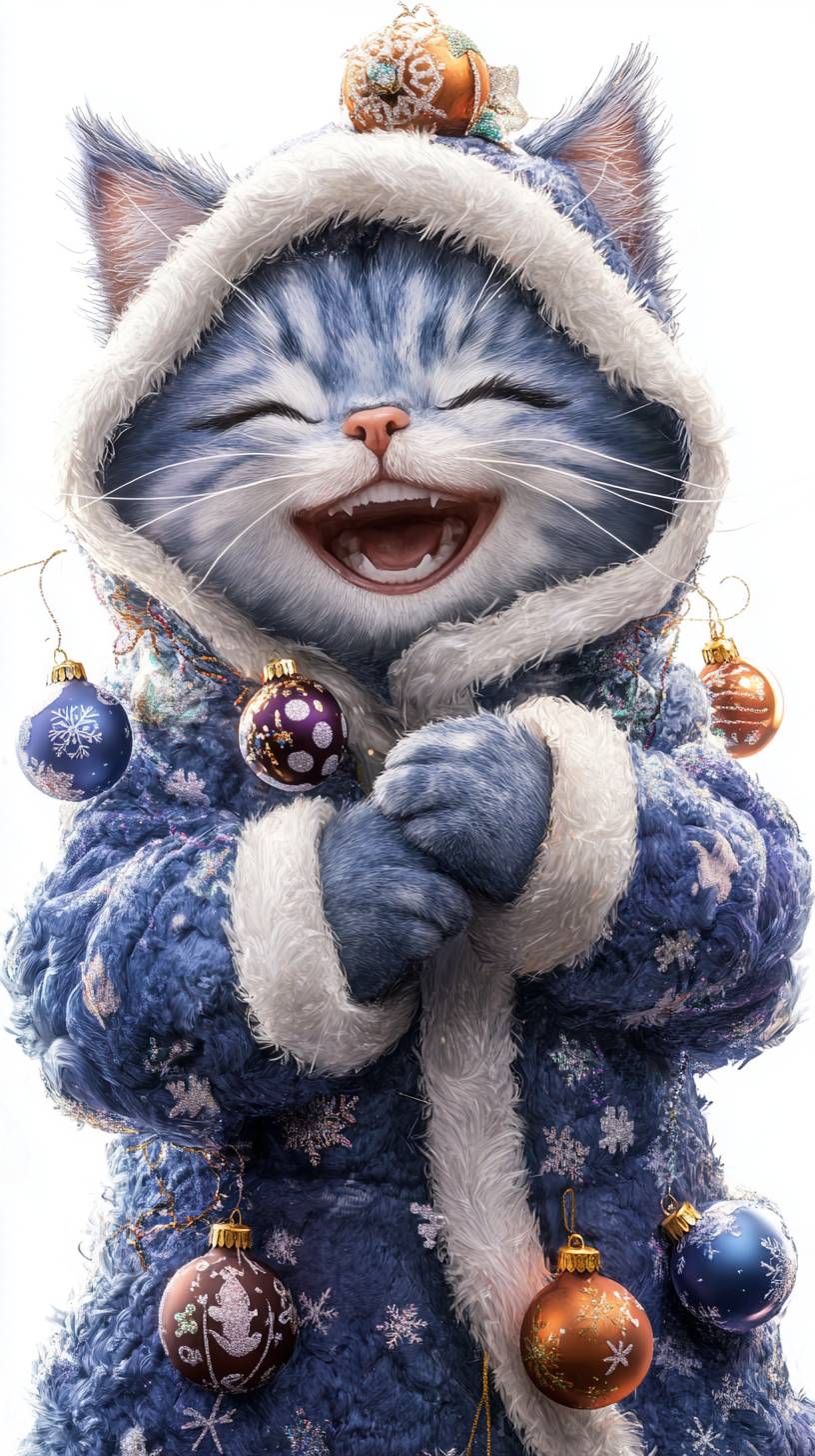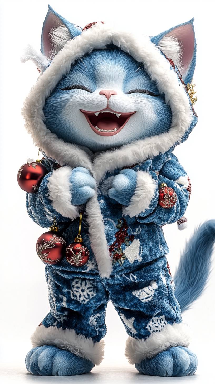 "Front-facing anthropomorphic cat laughing happily, wearing a blueberry-themed hooded outfit, textured with smooth blue skin, adorned with Christmas ornaments and a fluffy white trim. Full-body shot, --ar 9:16 --style raw --stylize 250 --v 6.1
