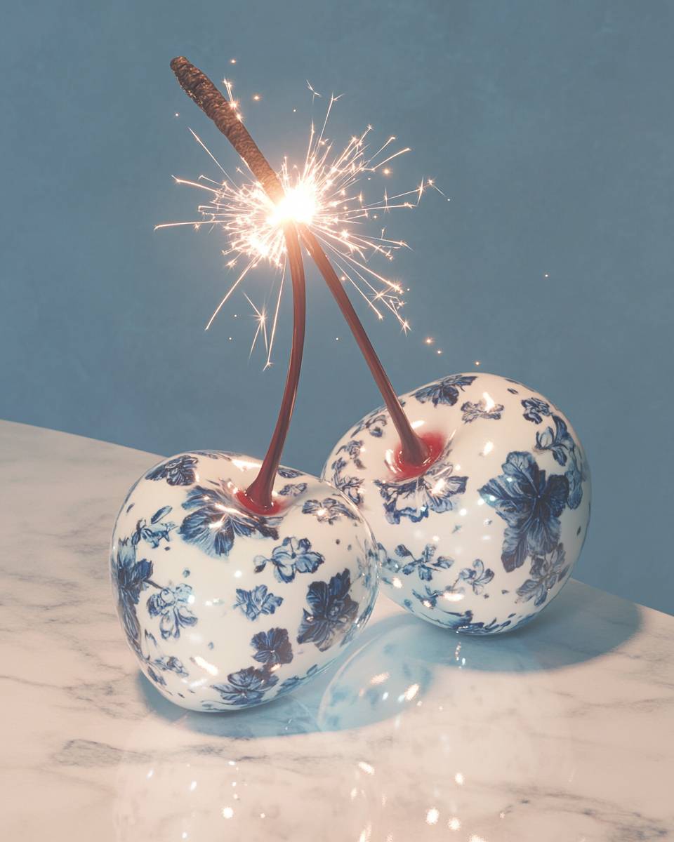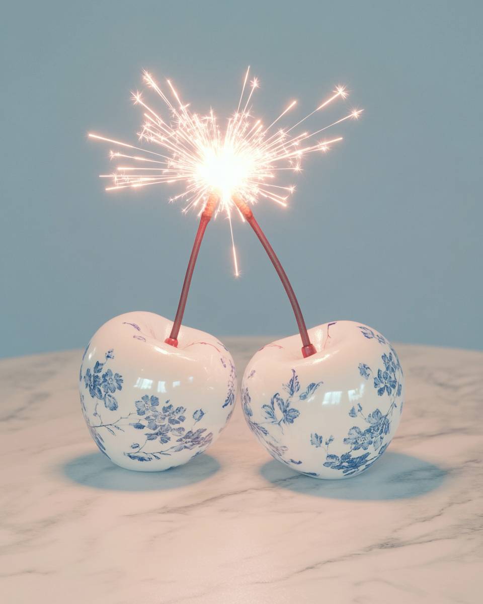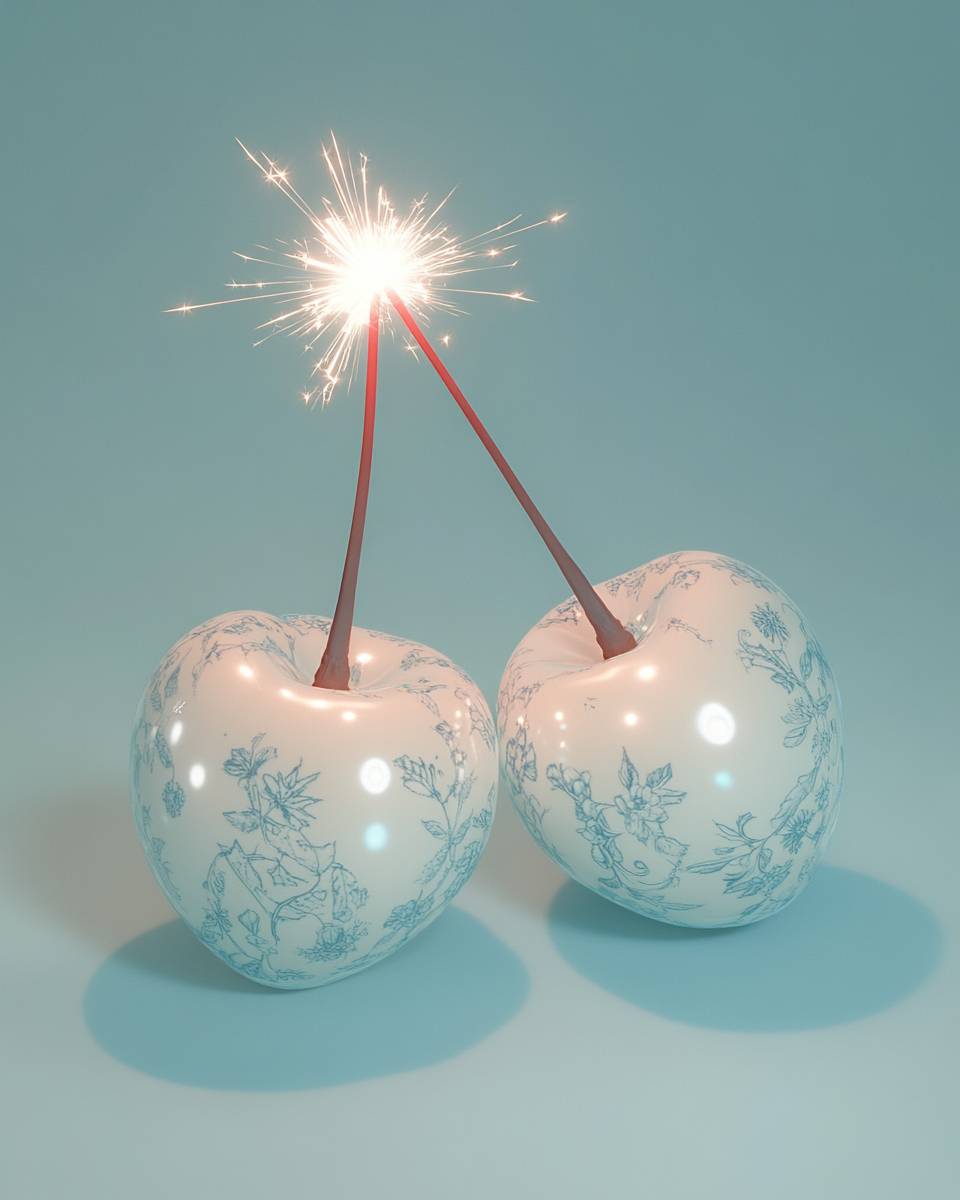 광택 있는 표면을 가진 두 개의 체리의 하이퍼 리얼리즘 이미지로, 복잡한 흰색과 파란색 꽃 패턴으로 장식되어 있습니다. 줄기가 얽혀 있으며, 하나의 줄기는 밝은 폭죽을 들고 있어 빛나는 불꽃과 부드러운 빛을 발산합니다. 배경은 풍부하고 깊은 파란색으로 극적인 대조를 만들어냅니다. 조명은 체리의 섬세한 패턴과 폭죽의 따뜻한 빛을 부드럽게 강조하여 초현실적이고 우아한 구성을 강화합니다.