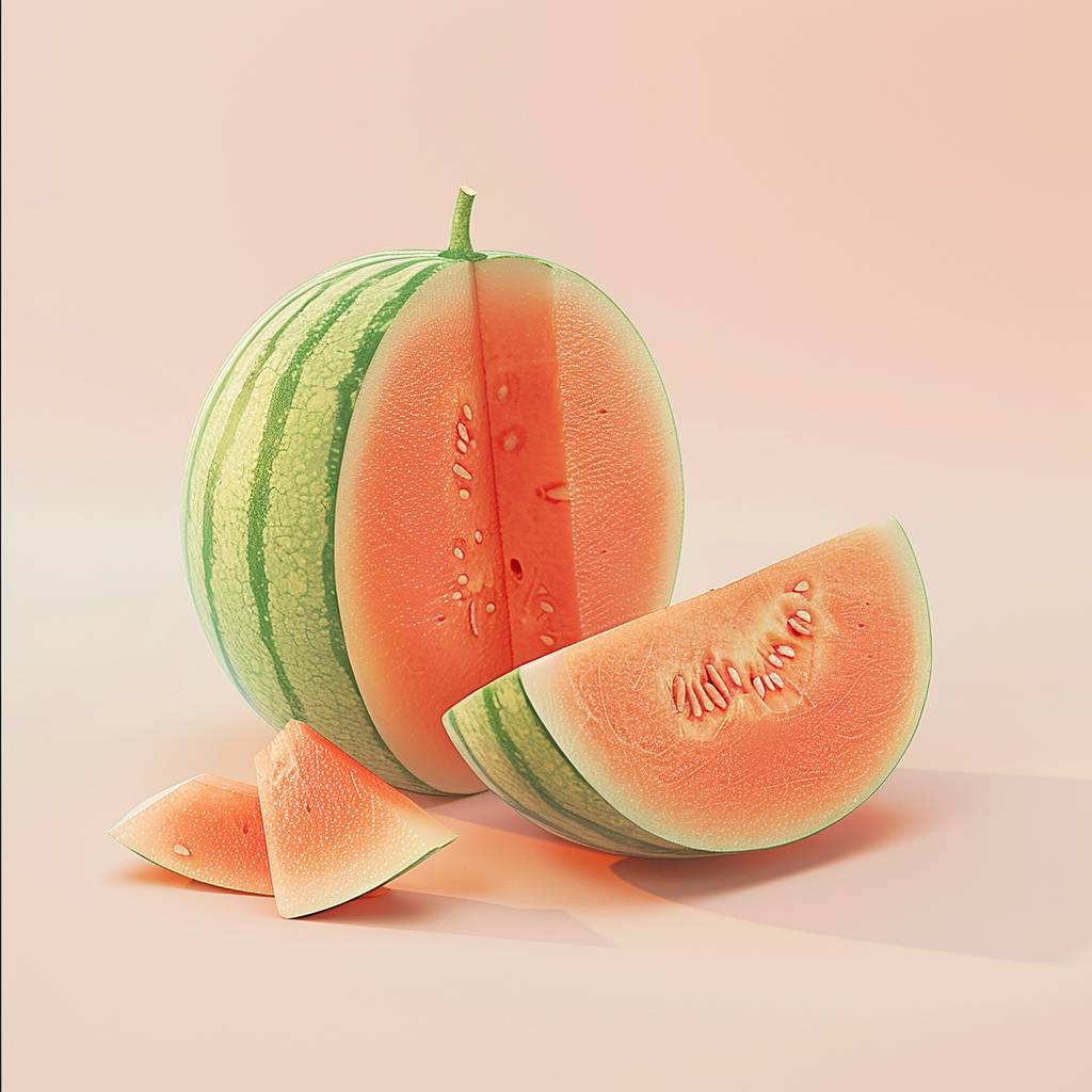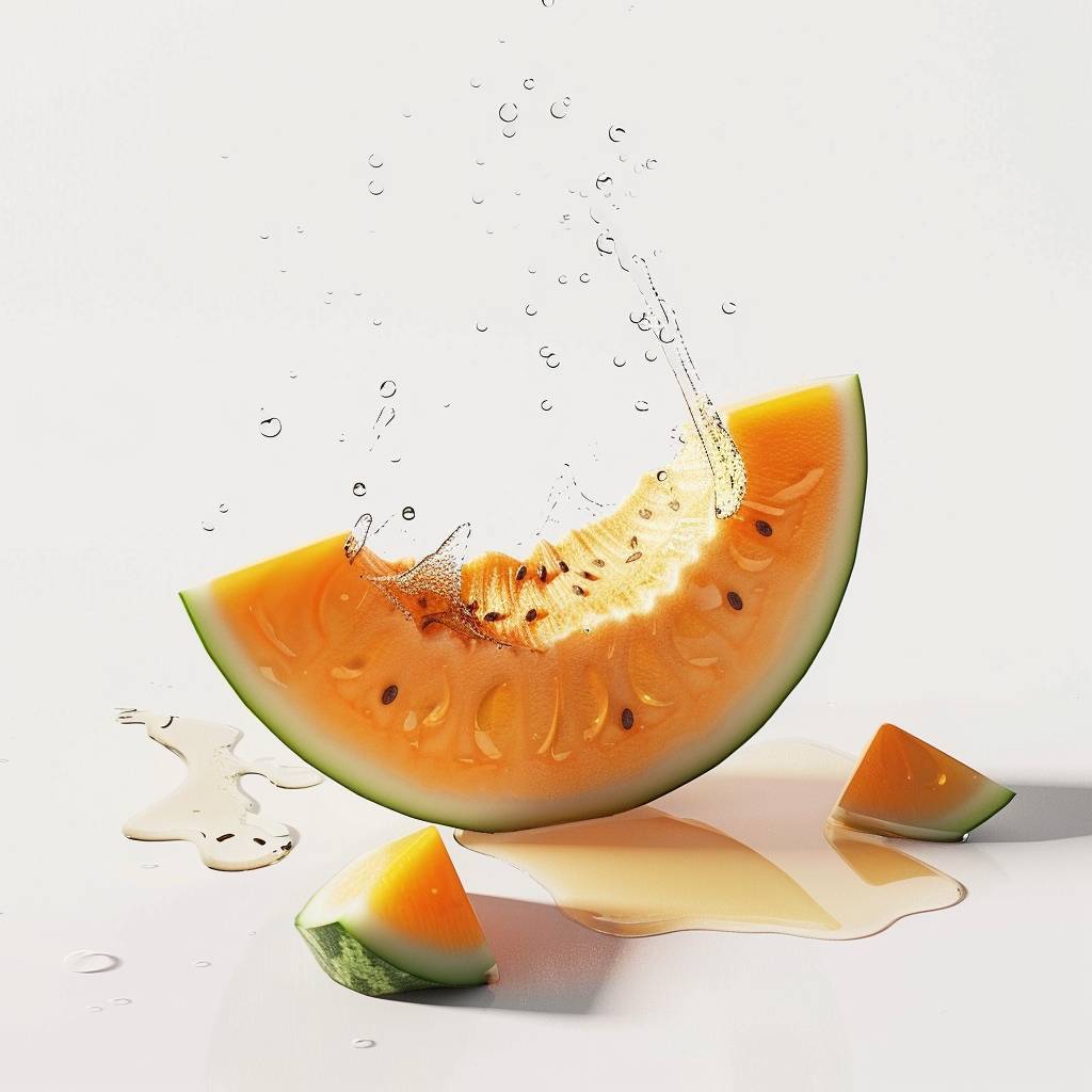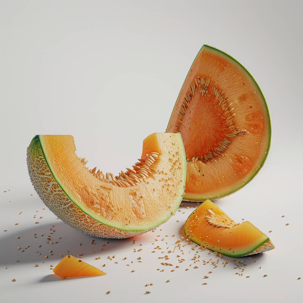 흰색 배경에 초현실적인 멜론 껍질과 슬라이스가 있습니다.
