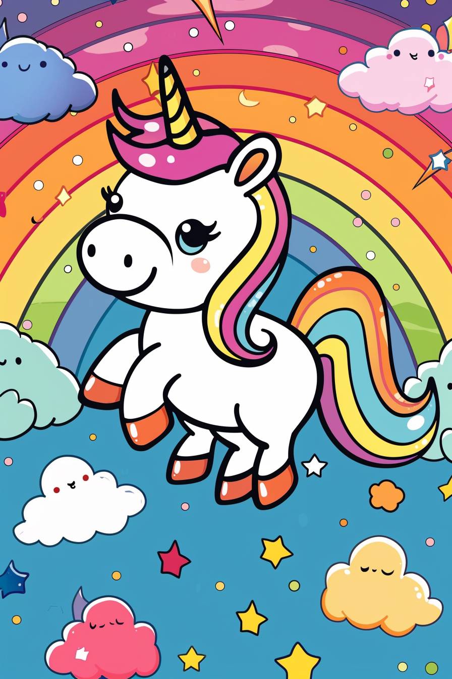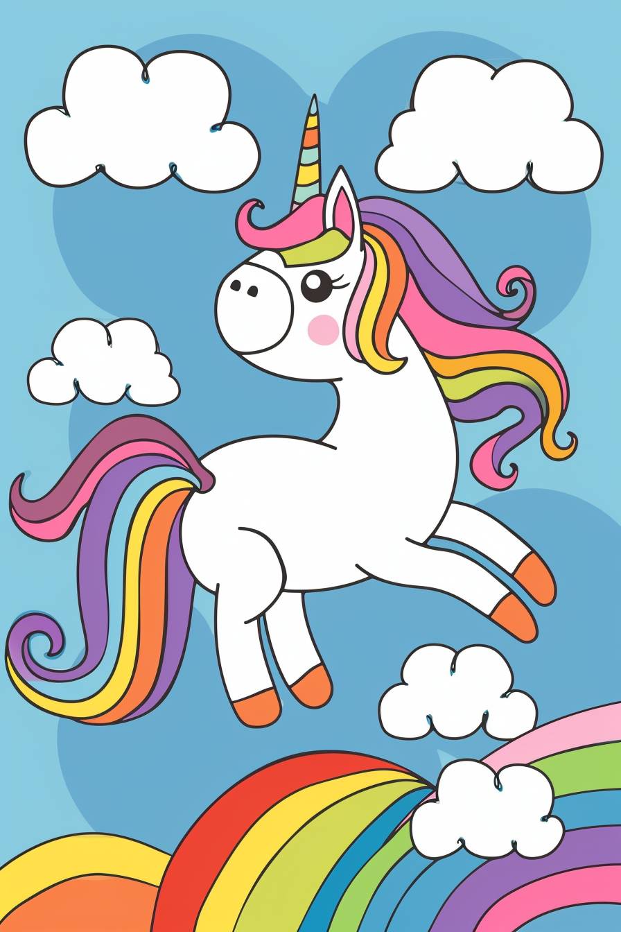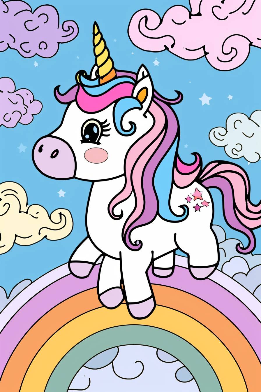 어린이를 위한 간단한 색칠책으로 귀여운 유니콘과 무지개, 구름이 그려져 있습니다.