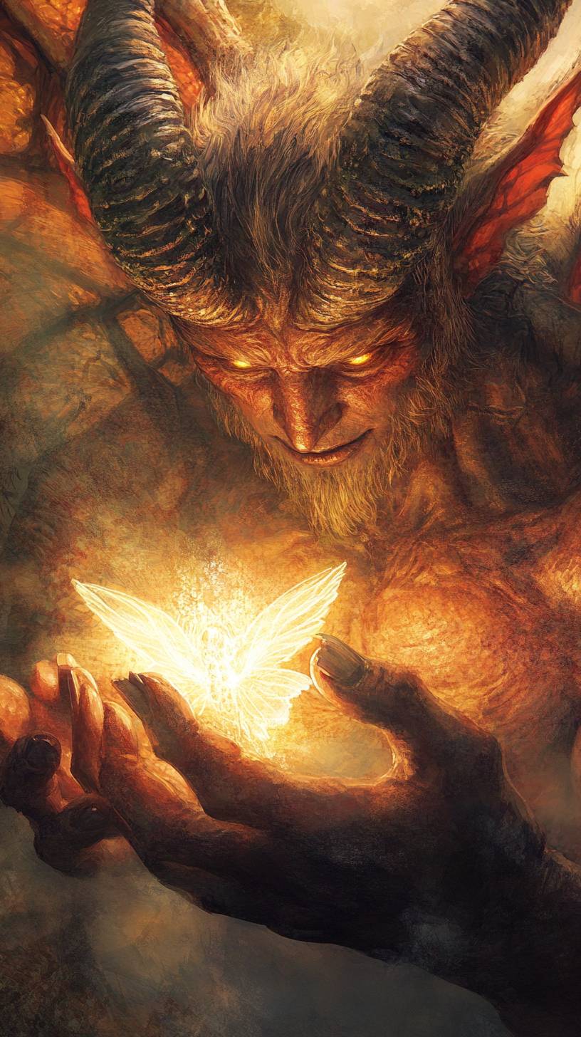 The devil brings light and happiness to help humanity. --ar 9:16 --v 6.1