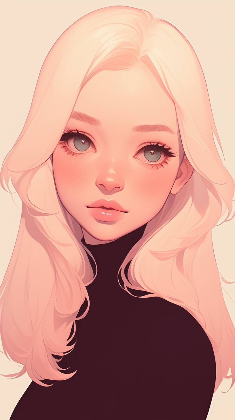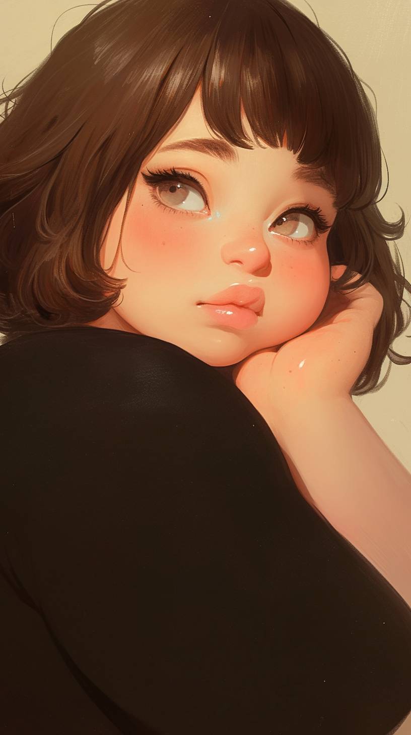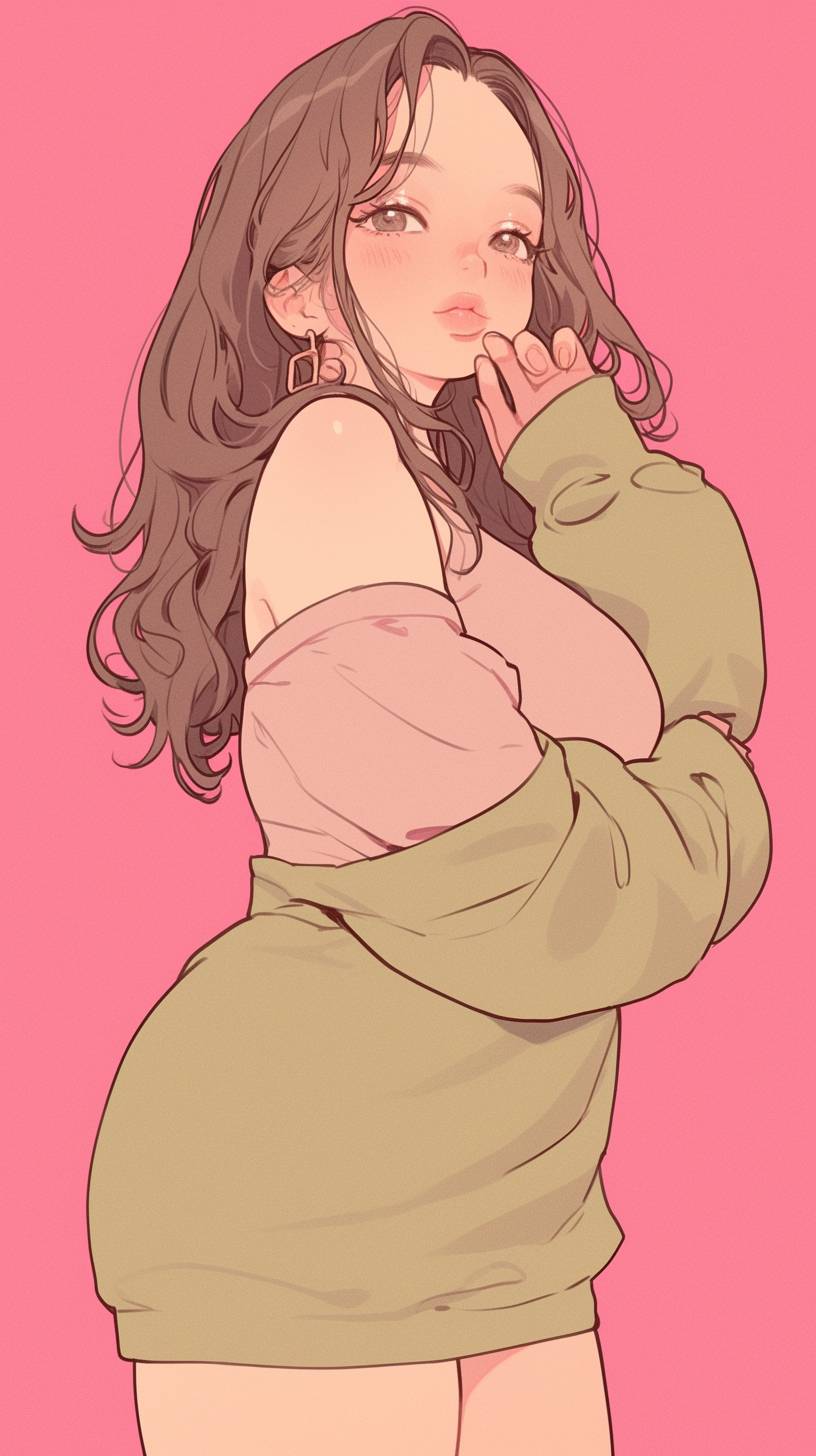 통통하고 아름다운 소녀가 연한 분홍색 옷을 입고, 통통한 입술과 볼로 미소를 짓고 있습니다.