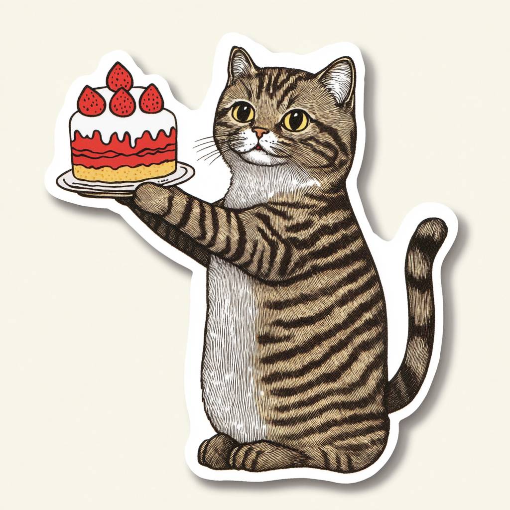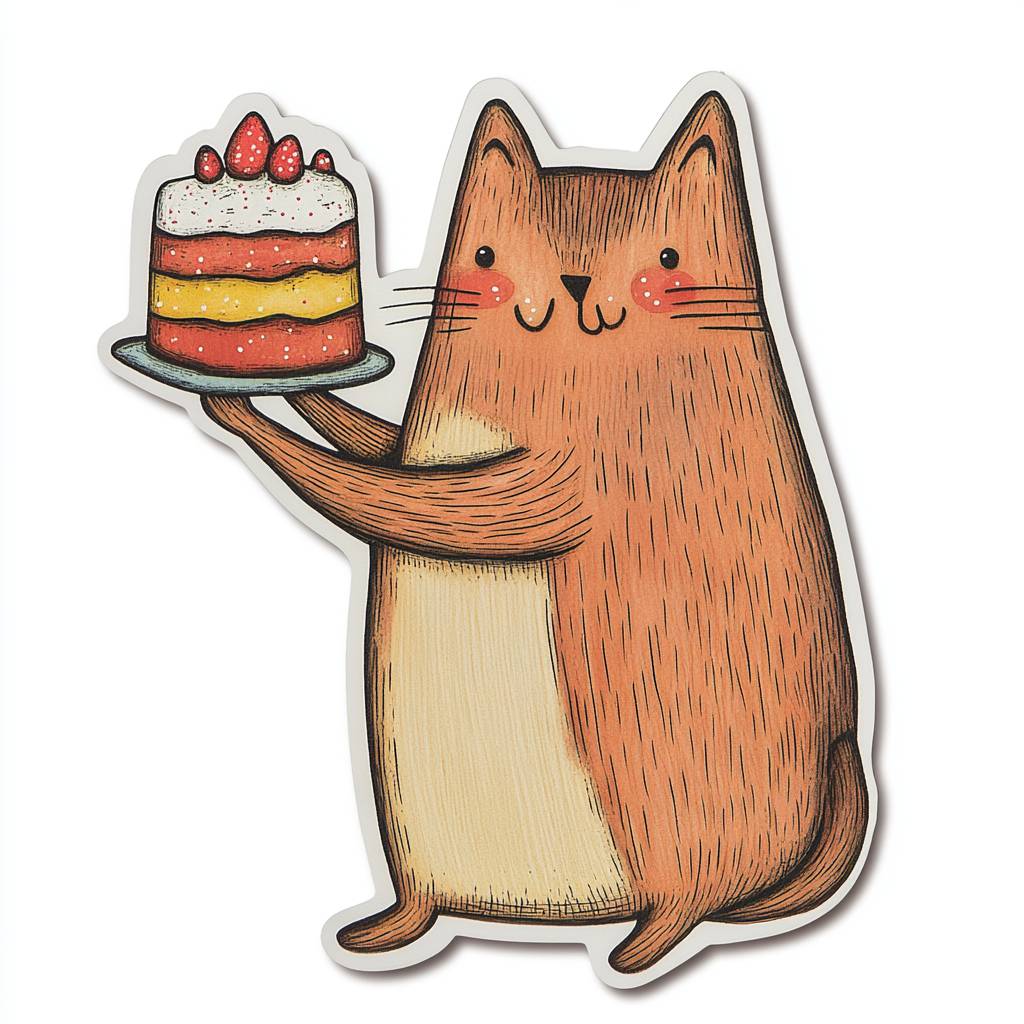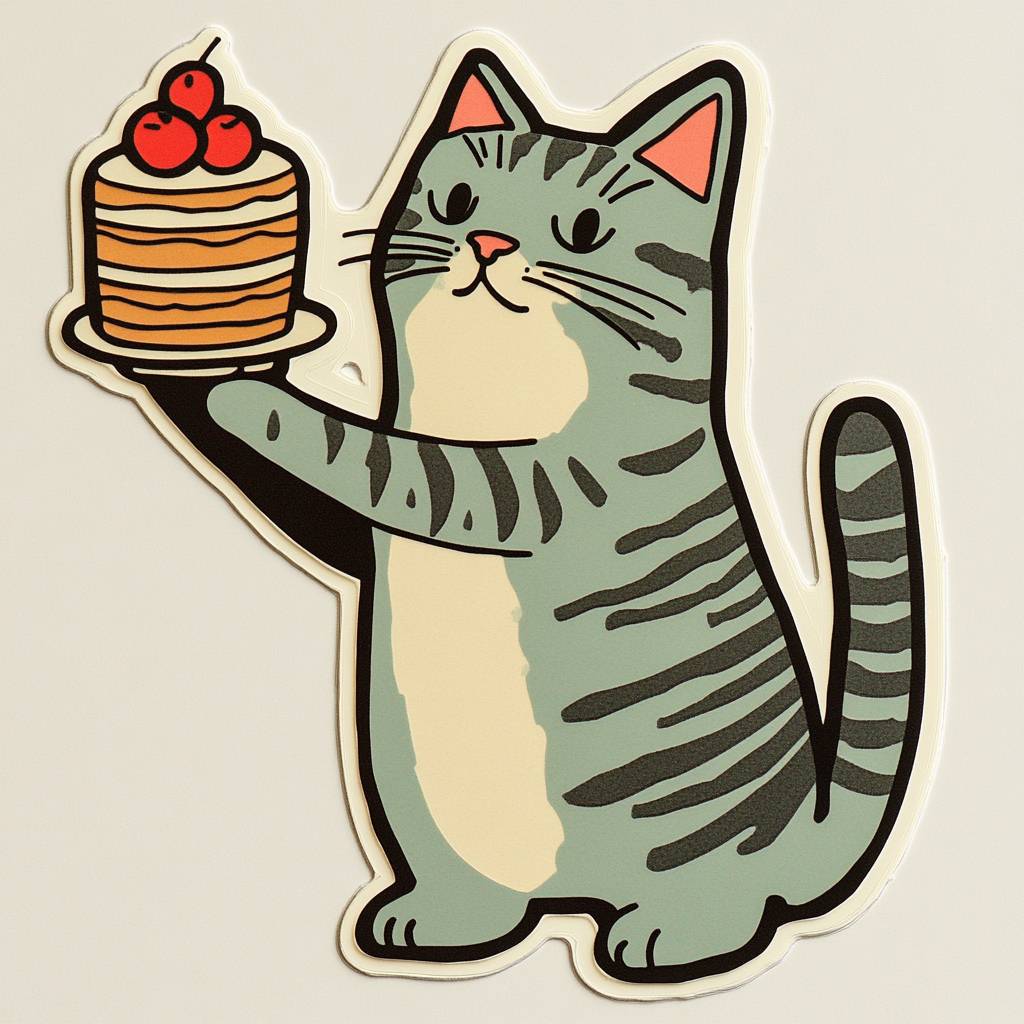 마르크 존스의 스티커, 케이크를 들고 있는 고양이를 묘사합니다.