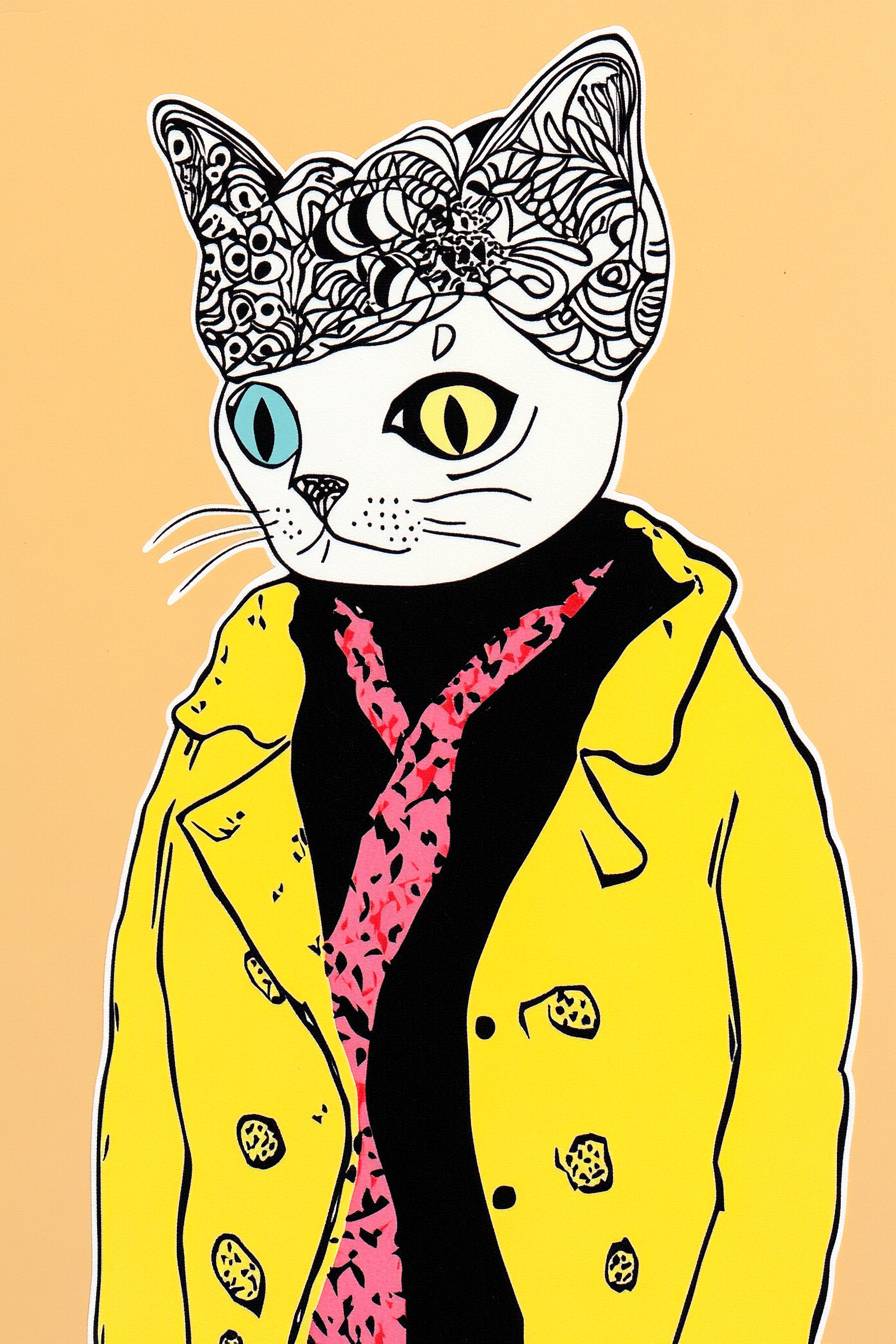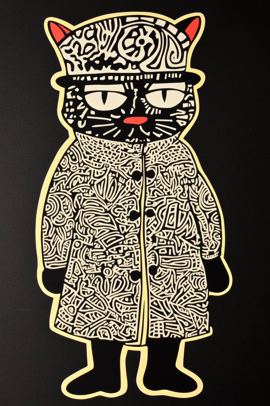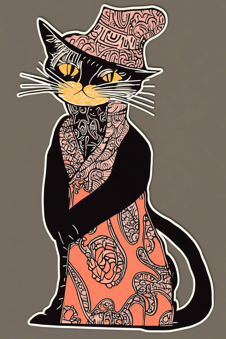 마이클 드포르주가 제작한 외투와 복잡한 모자를 쓴 고양이의 스티커입니다.