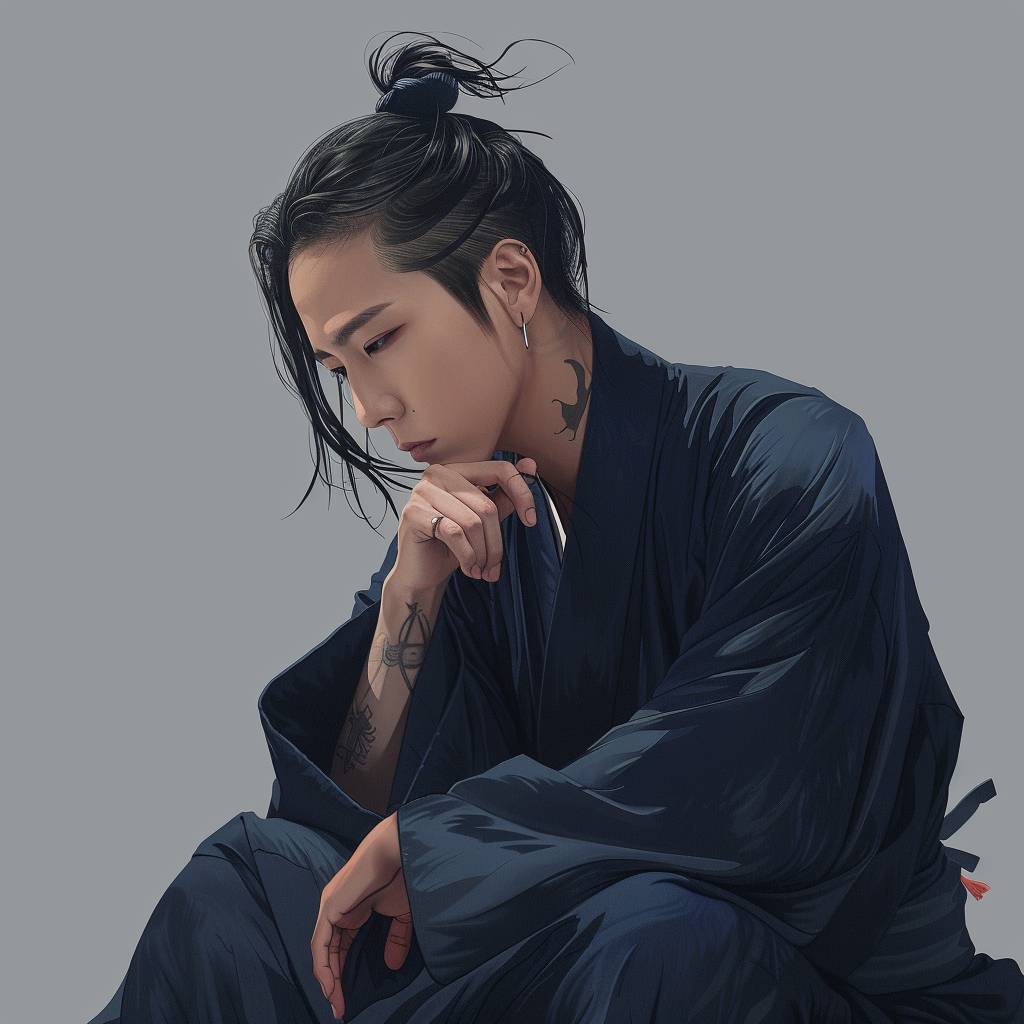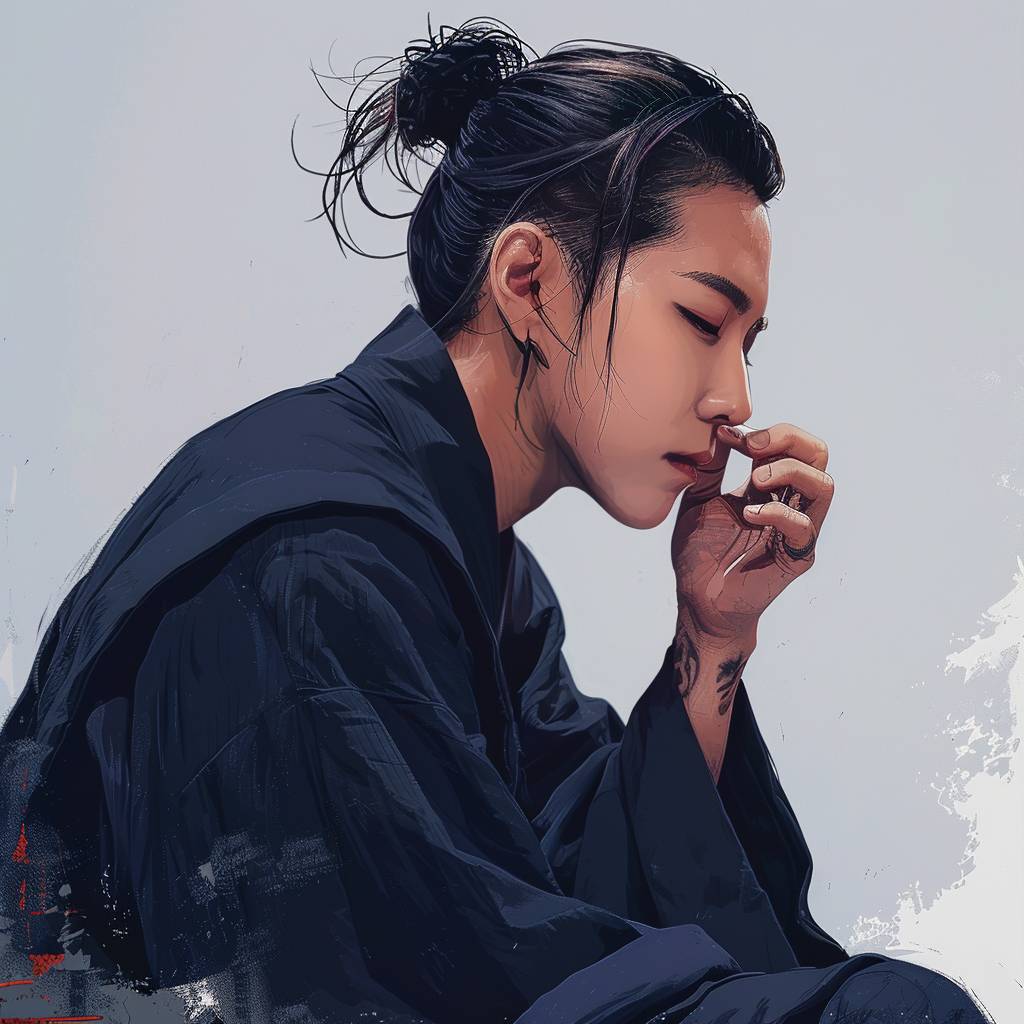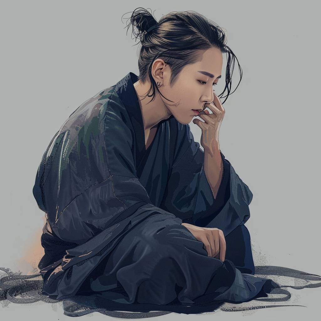 긴 머리를 묶은 잘생긴 남성이 짙은 파란색 한복을 입고 땅에 앉아 머리를 숙인 채 명상하고 있습니다. 그의 눈은 감겨 있고, 한 손은 입가에 가까이 대고 있으며, 마치 잠들거나 깊은 생각에 잠긴 것 같습니다. 간단하고 평평한 회색 배경은 차분한 만화 같은 미학을 가지고 있으며, 일본 만화 아트를 연상시킵니다.
