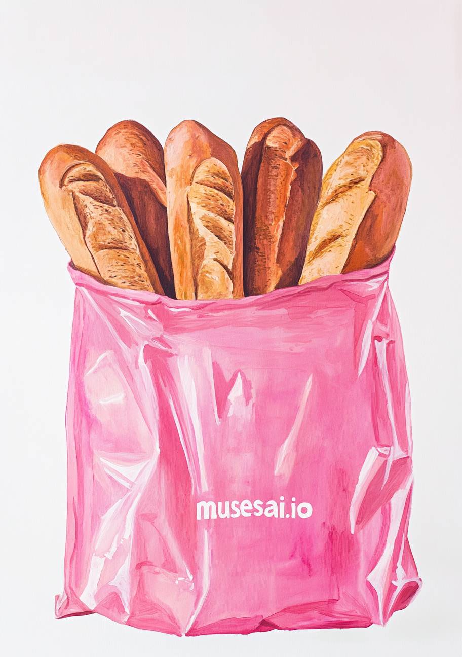 A pink plastic bag with "musesai.io" written on it, filled to the top with whole loaves of brown French bread against a white background. Gouache painting with simple lines in a minimalistic style, in the style of Maira Kalman. --ar 45:64 --style raw --v 6.1
