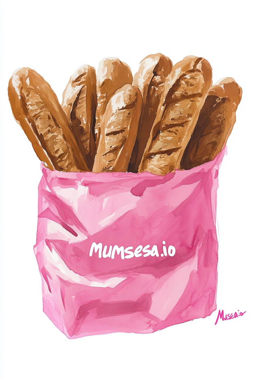 ‘musesai.io’라고 적힌 분홍색 플라스틱 가방이 흰색 배경에 있고, 그 안에는 통째로 구운 갈색 프랑스 빵이 가득 차 있습니다. 마이라 칼먼의 스타일로 간단한 선으로 그린 수채화입니다.