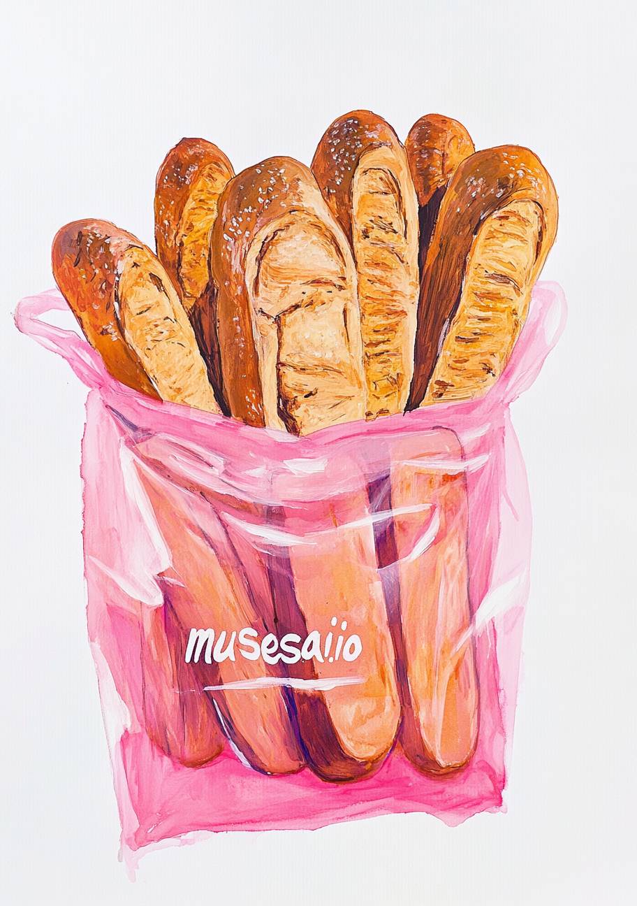 ‘musesai.io’라고 적힌 분홍색 비닐袋이 갈색 프랑스빵으로 가득 차 있다.
