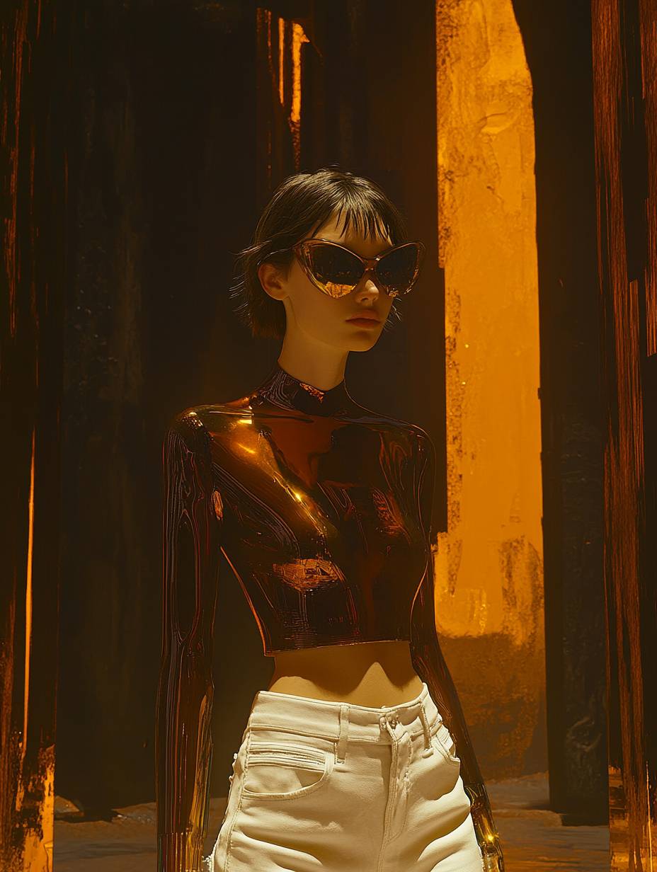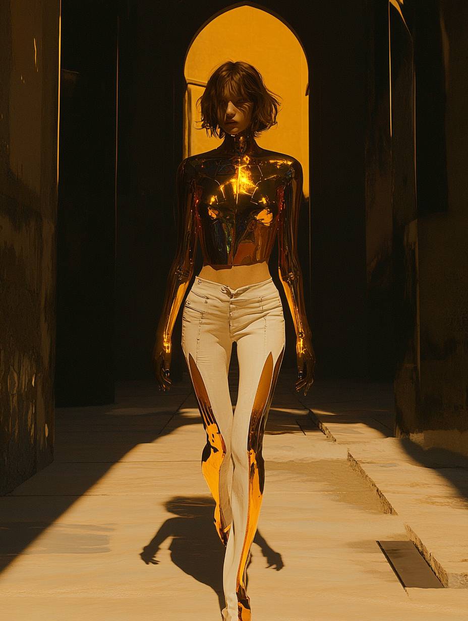 여성 사이보그 모델이 초현실적인 화려한 패션 상의와 길고 긴 코트, 찢어진 흰색 청바지를 입고 있습니다.