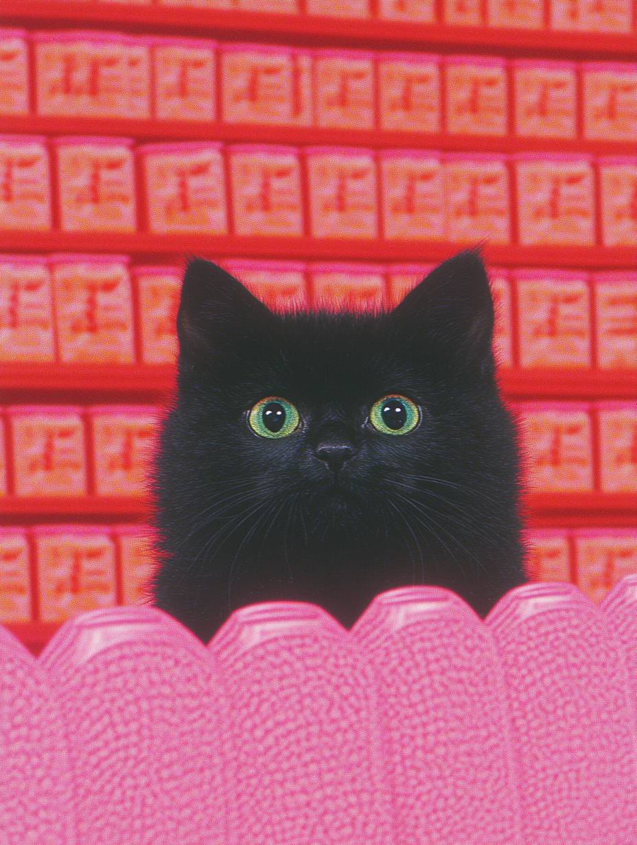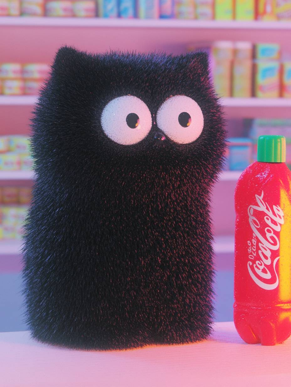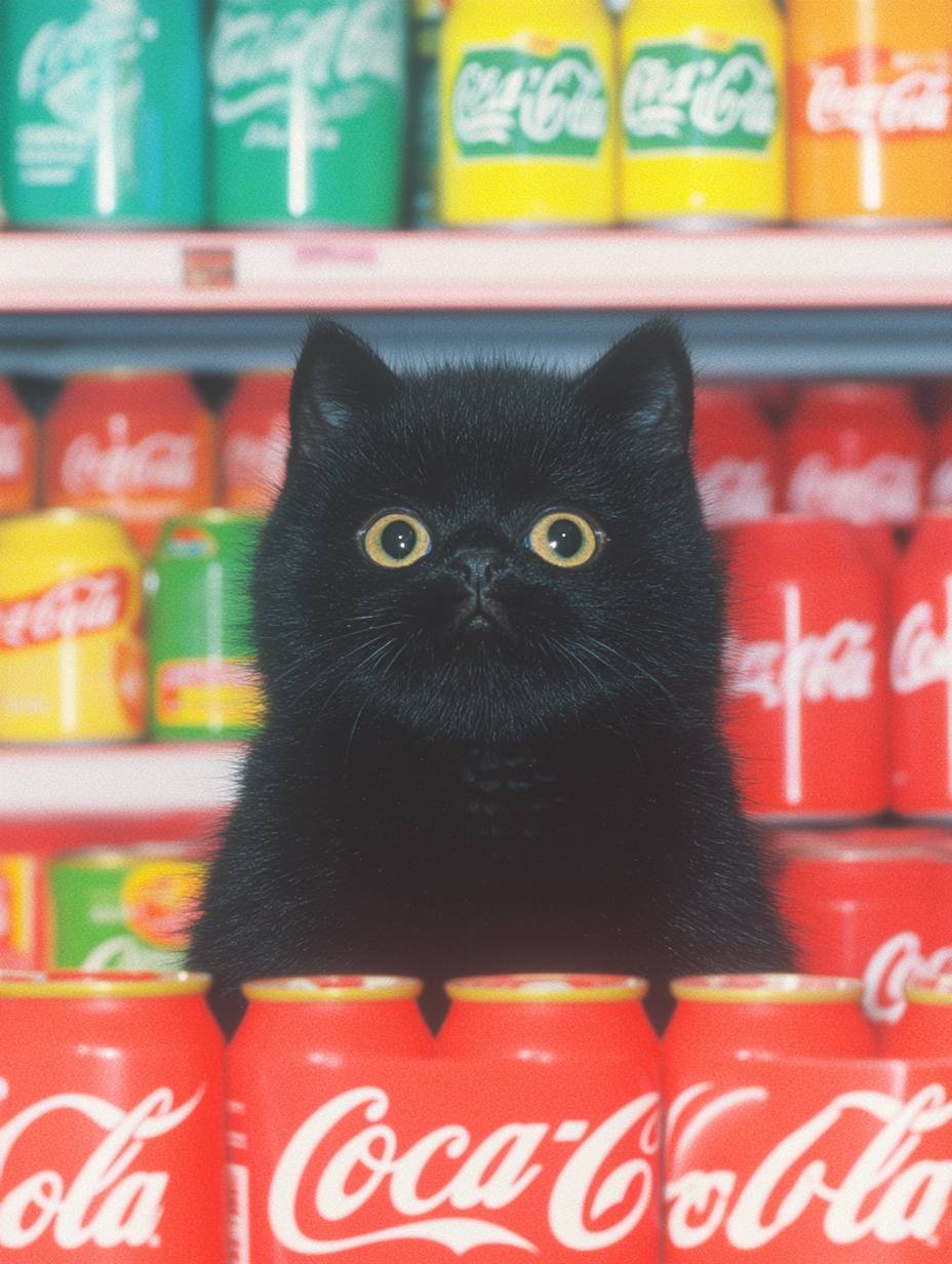귀여운 검은 고양이가 가게에서 코카콜라를 들고 있습니다.