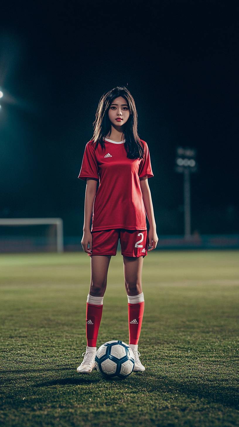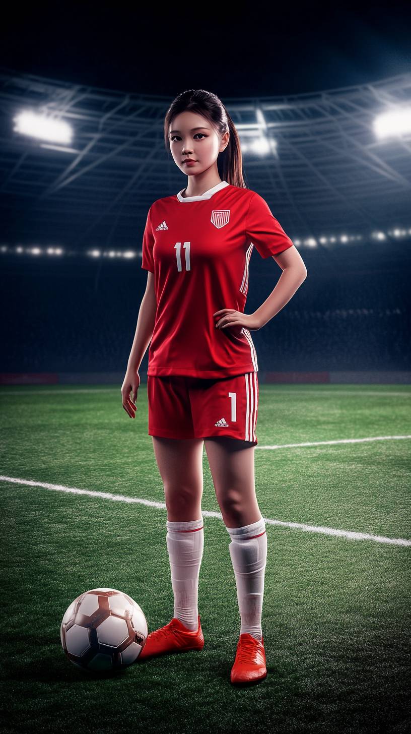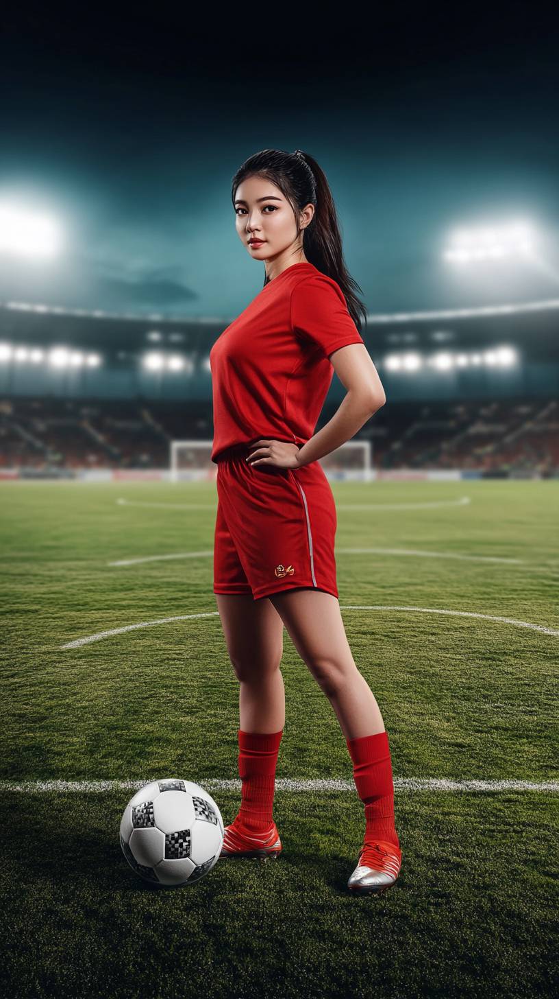 A beautiful 20-year-old Thai female model with fair skin, wearing a plain red football uniform (shirt and shorts) with no logos, standing confidently on a football field with a soccer ball. The style is hyper-realistic, photorealistic, cinematic, professional stadium lighting. --ar 9:16 --stylize 0 --v 6.1