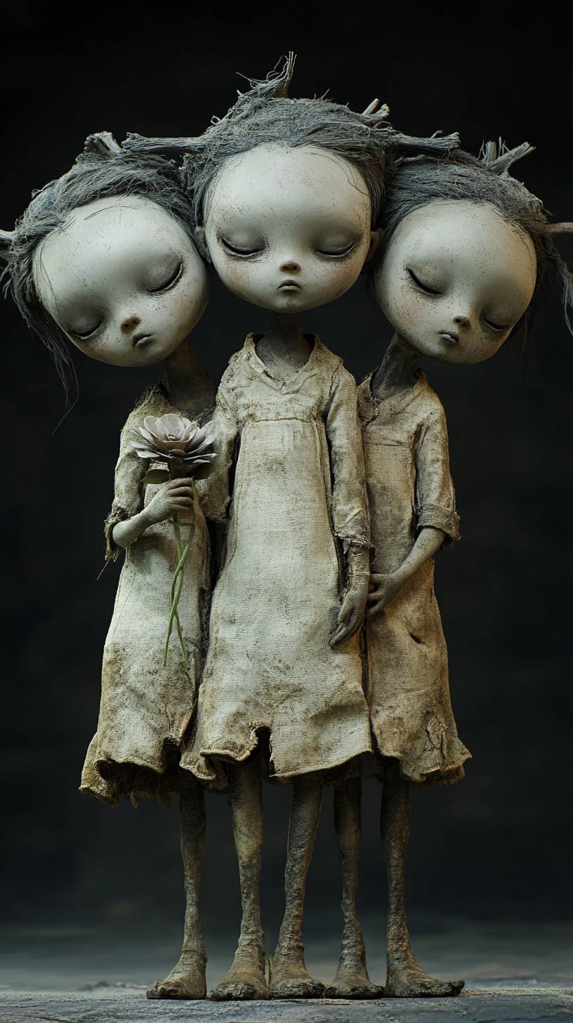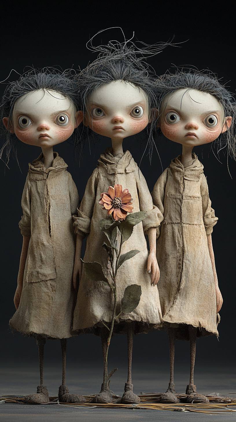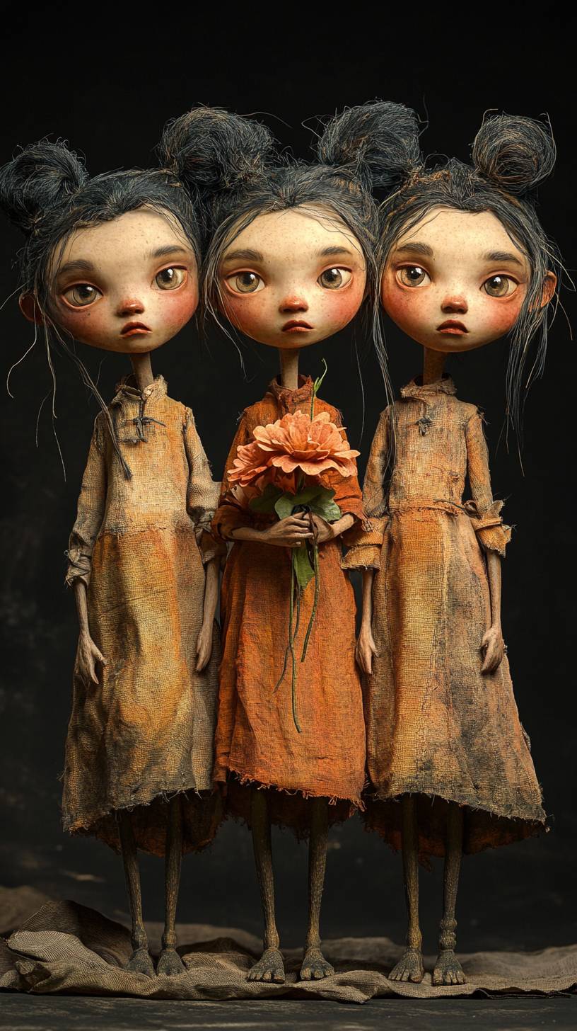 primitive, China, female, messy hair, 10 years old, expressionless, standing pose, three heads, linen clothes, holding a flower in the left hand, 3D model, cartoon character, figurine, black background, stage lighting --ar 9:16 --stylize 250 --v 6.1