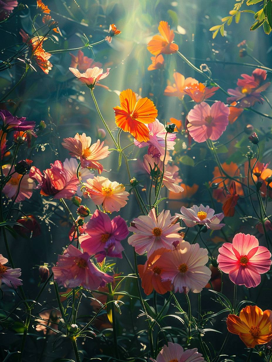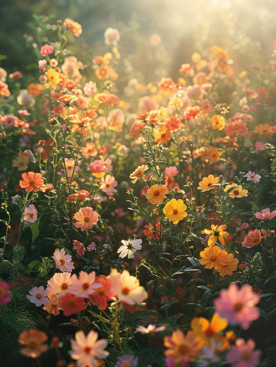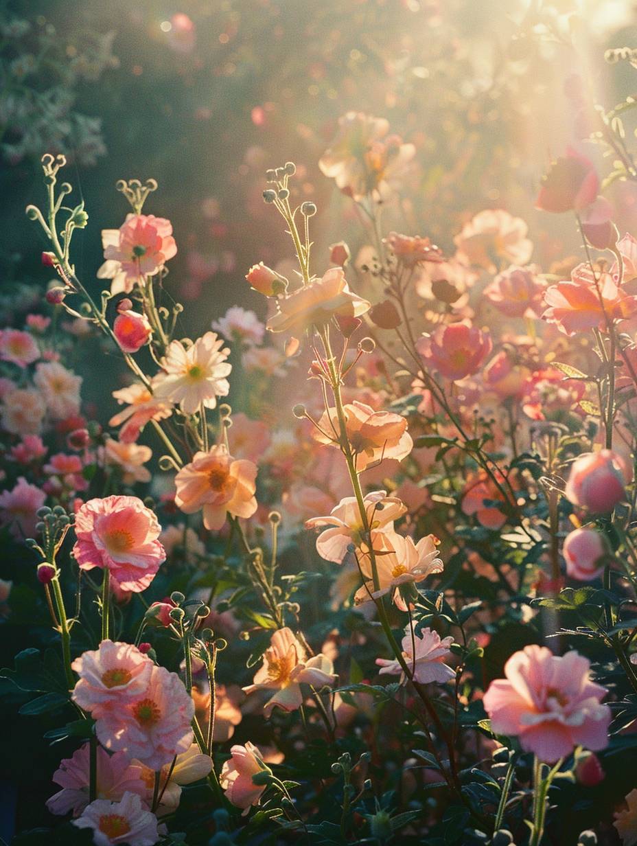 colorful blooms in a shady flower garden, in the style of rich tonal palette, delicate markings, sunrays shine upon it, beatrix potter, softly luminous, agfa vista, prairiecore --ar 3:4 --v 6.0 --s 250