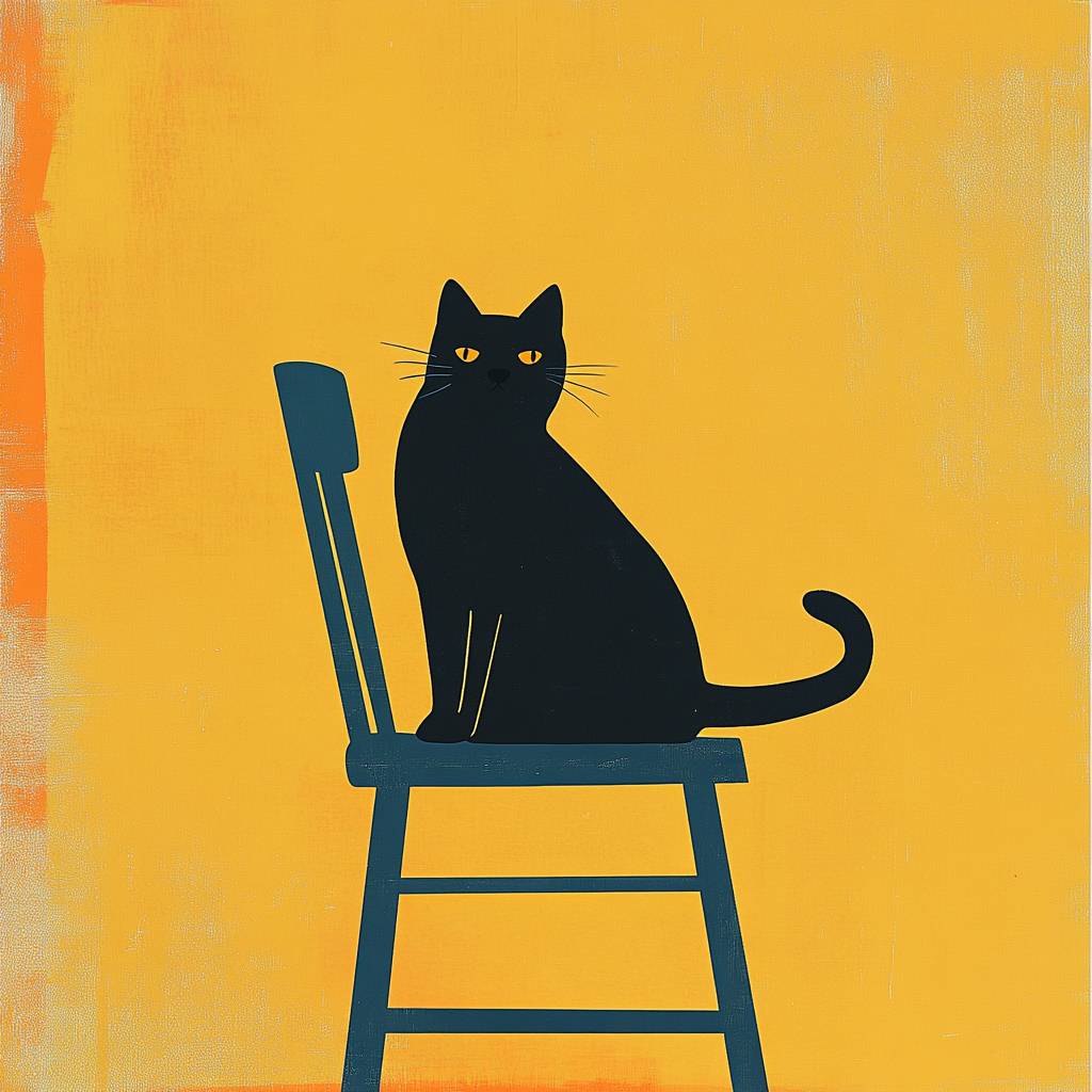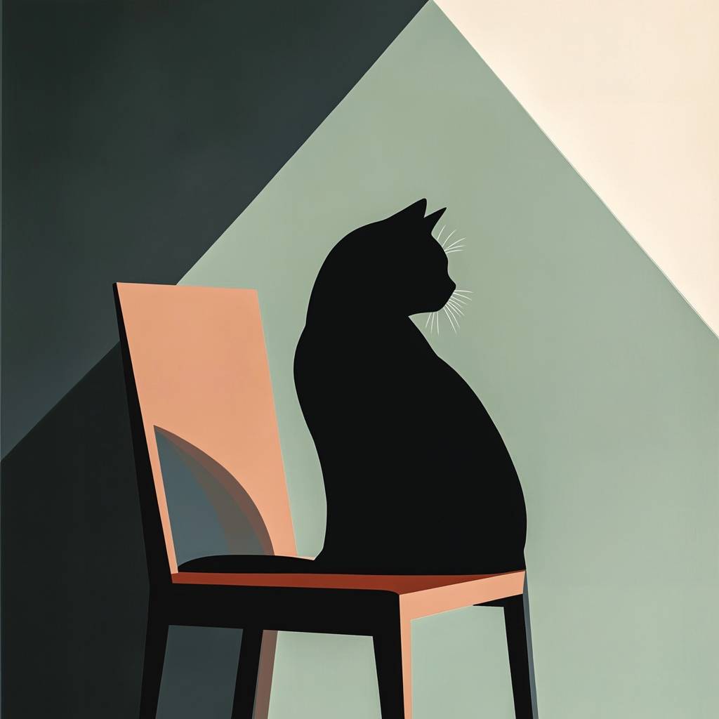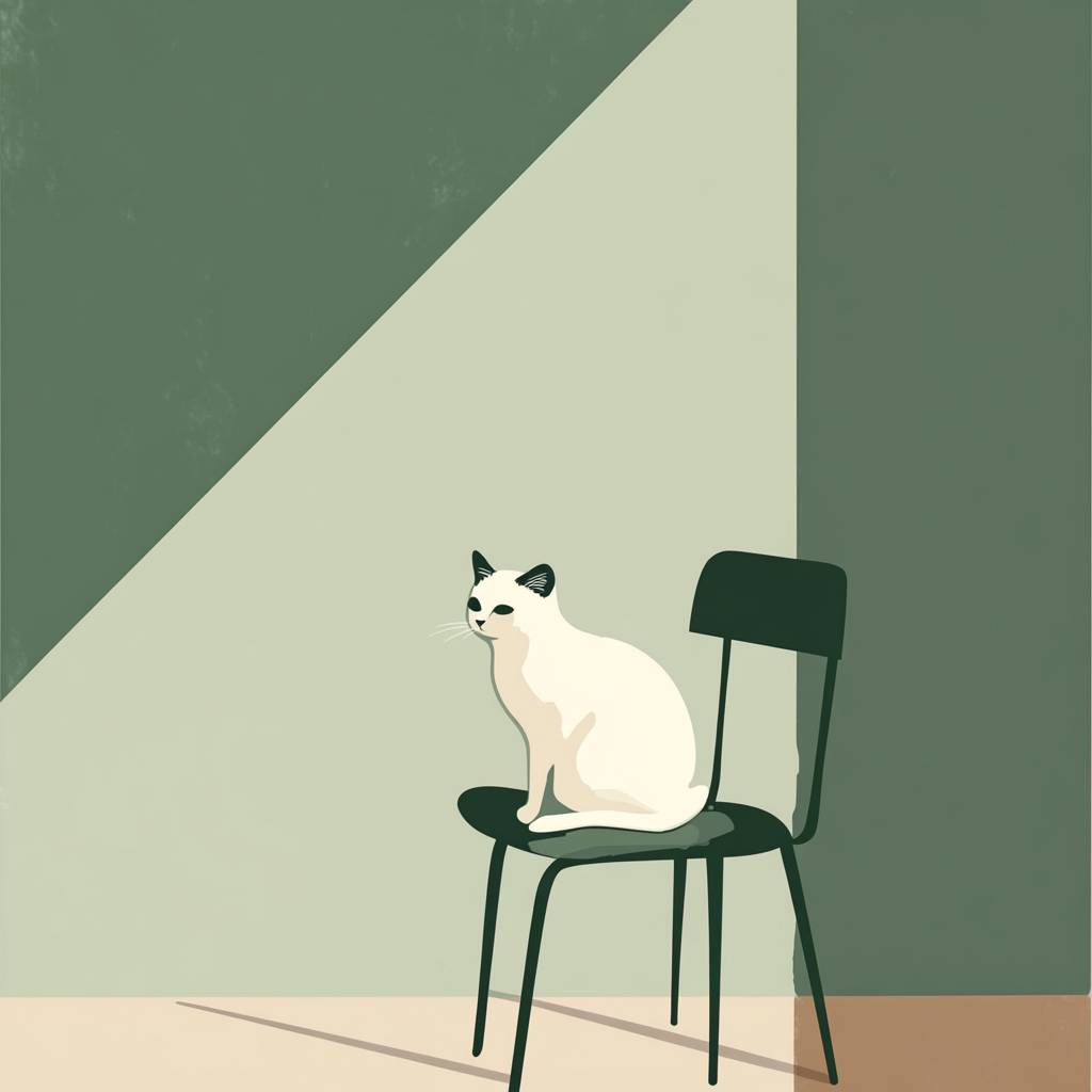 의자에 앉아 있는 고양이의 미니멀한 초상화, 유사한 색 조합으로.