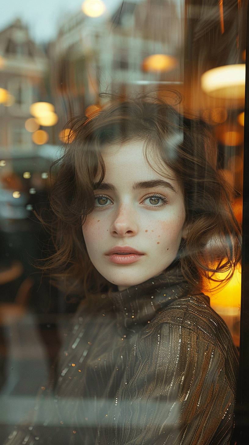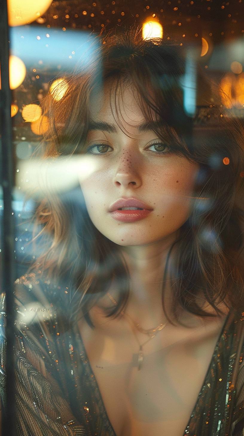 medium shot of attractive french girl in a city modern cafe on our first date, wearing Sequin Dress, brunette, casual smirk, reflections trough a window of another person walking by, shot in 2023 in the style of Vivian Maier. candid::3 30mm lens, shot in 2023. candid, minimalism, moody, modern, cinematic realism, Eye Level Shot, shot with hasselblad 30mm, Kodak Ektar 100 --no black and white photography --ar 9:16 --style raw --stylize 420 --v 6.0