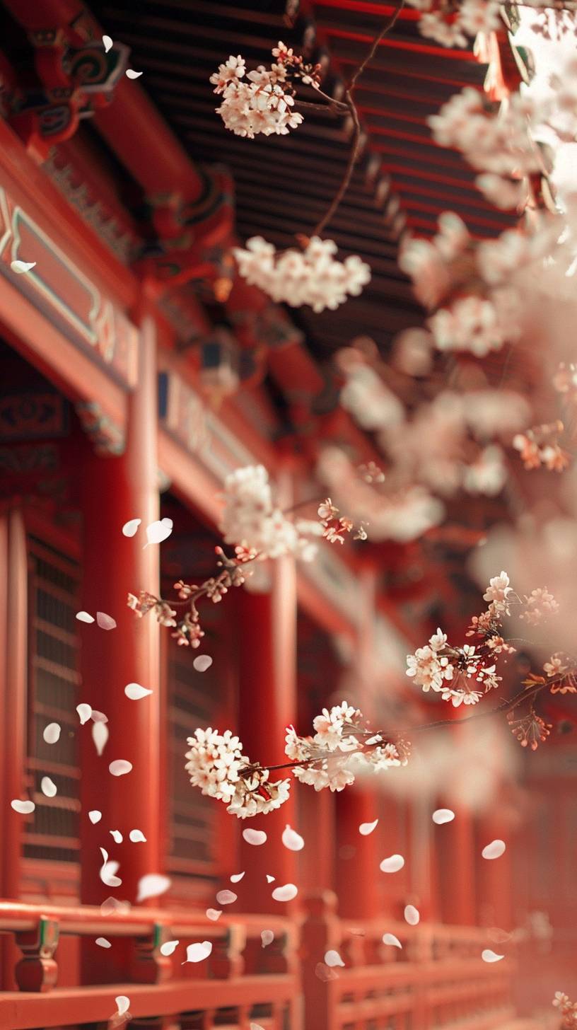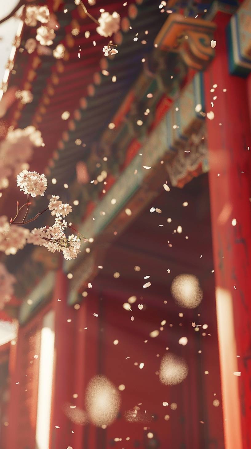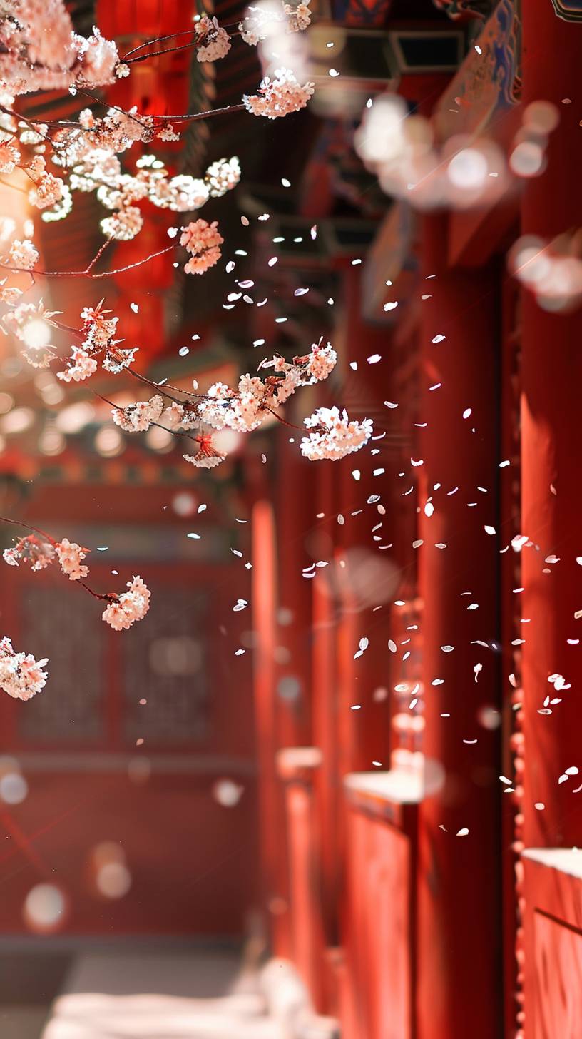 봄, 고대 중국 건물의 빨간 벽에 떨어지는 벚꽃잎, 활력이 가득한 장면, 섬세한 꽃잎과 부드러운 그림자가 어우러져 있다.